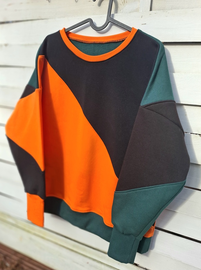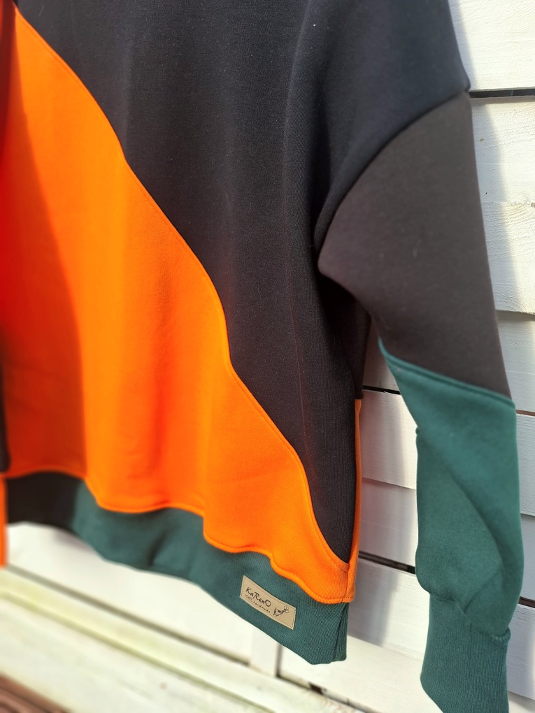 Przepiękna i zjawiskowa damska bluza z kolekcji AURIS. Fason owersize, krótka. Całość uszyta jest z dzianiny dresowej drapanej  premium (na misiu pod spodem) o gramaturze ok 300g . Połączenie kolorystyczne to czarny, pomarańcz oraz butelkowa zieleń. Wygląda na prawdę zjawiskowo.