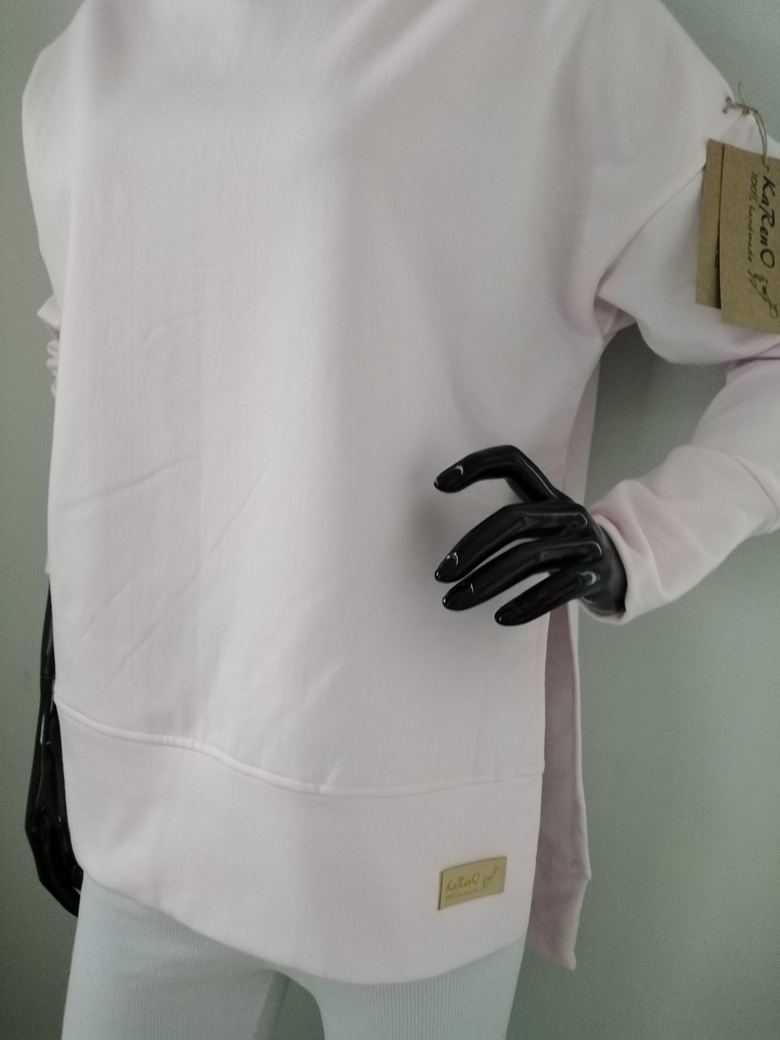 Bluza damska o prostym fasonie. Przód krótszy a tył dłuższy. Wysokie rozcięcia wysokie po bokach. Uszyta z dzianiny dresowej grubej, drapanej na misiu od spodu. Fason bardzo wygodny luźny, który doskonale ukryje wszelkie niedoskonałości sylwetki. Idealna do spodni.