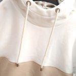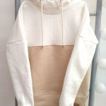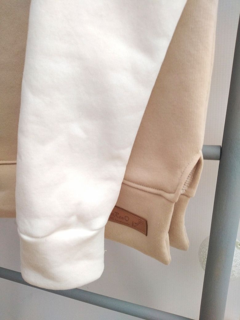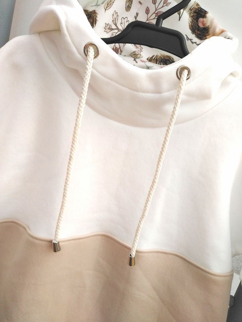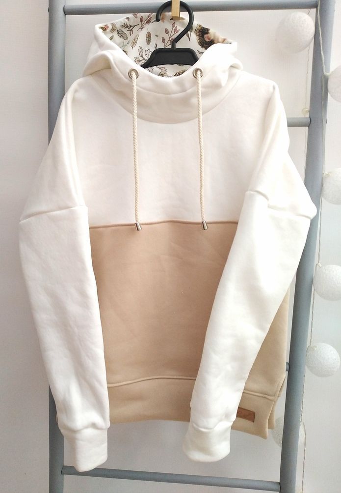 Piękna dwukolorowa bluza damska z kapturem. Kolor śmietanki i delikatnego beżu. środek kaptura w wzór jeży. Kaptur wykończony sznurkiem. Fason bluzy owersize z rozcięciami po bokach, co sprawia że jest ona bardzo wygodna. Dzianina dresowa premium, gruba i mięsista.