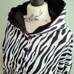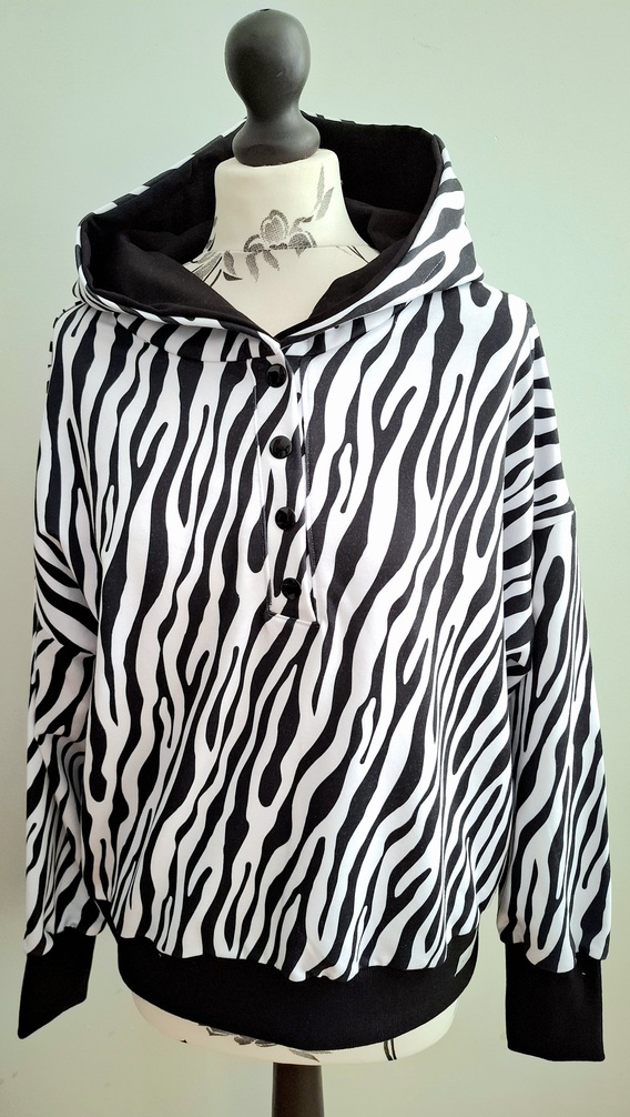 Przepiękna damska bluza z kapturem w biało czarny wzór zebry. Zapinana na metalowe trzy zatrzaski. Dół bluzy oraz rękawy wykończone ściągaczem w kolorze czarnym.