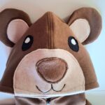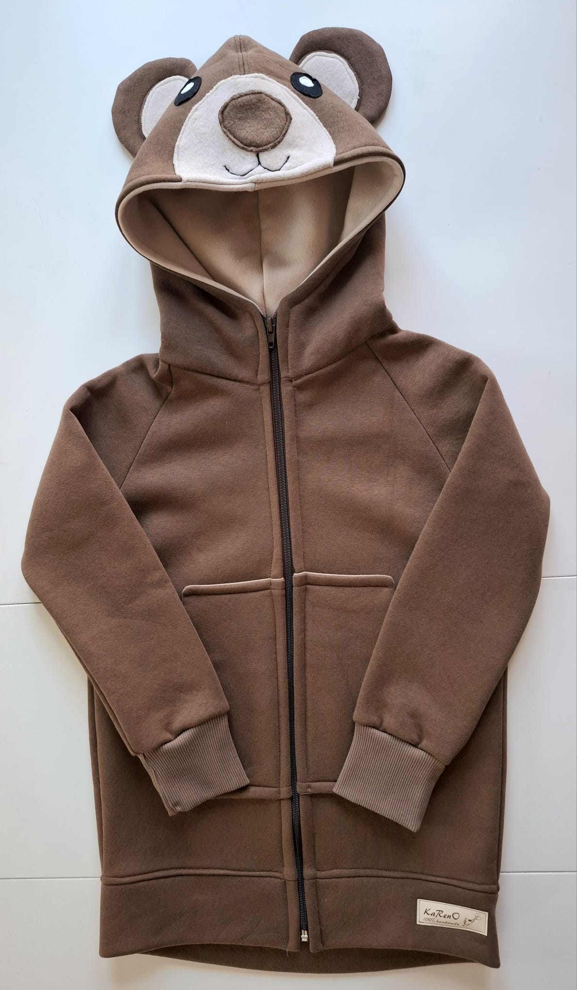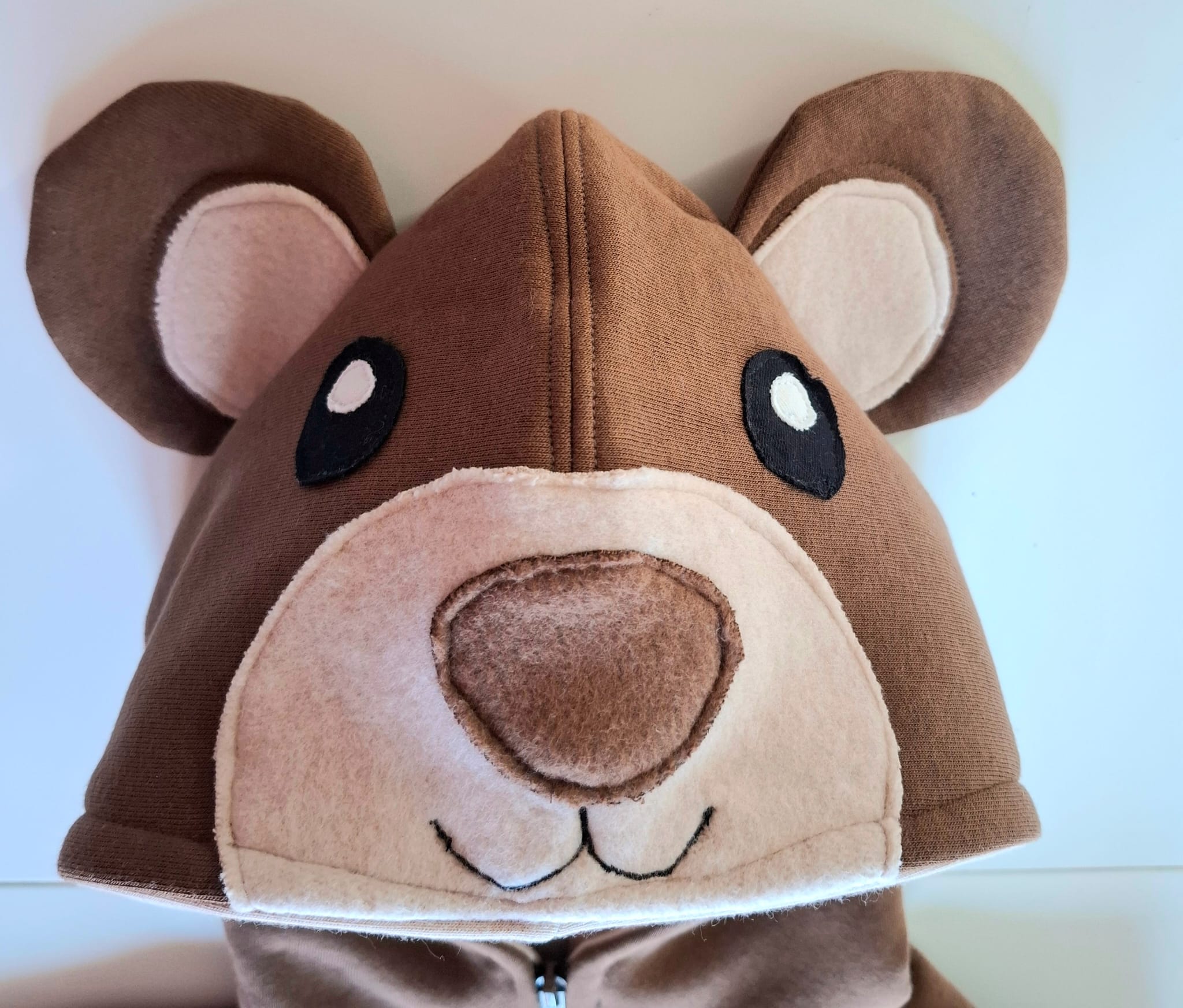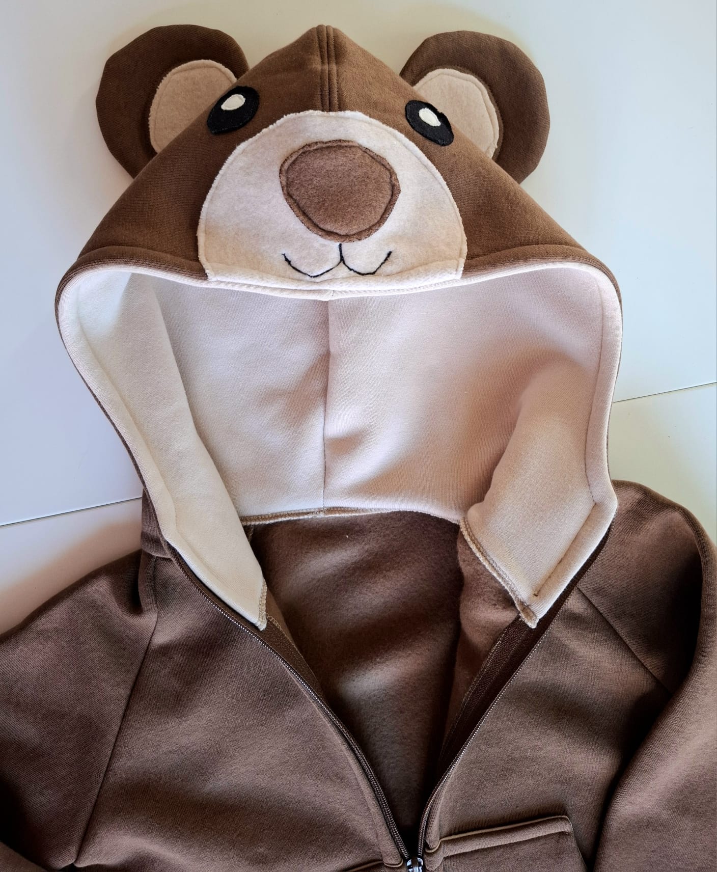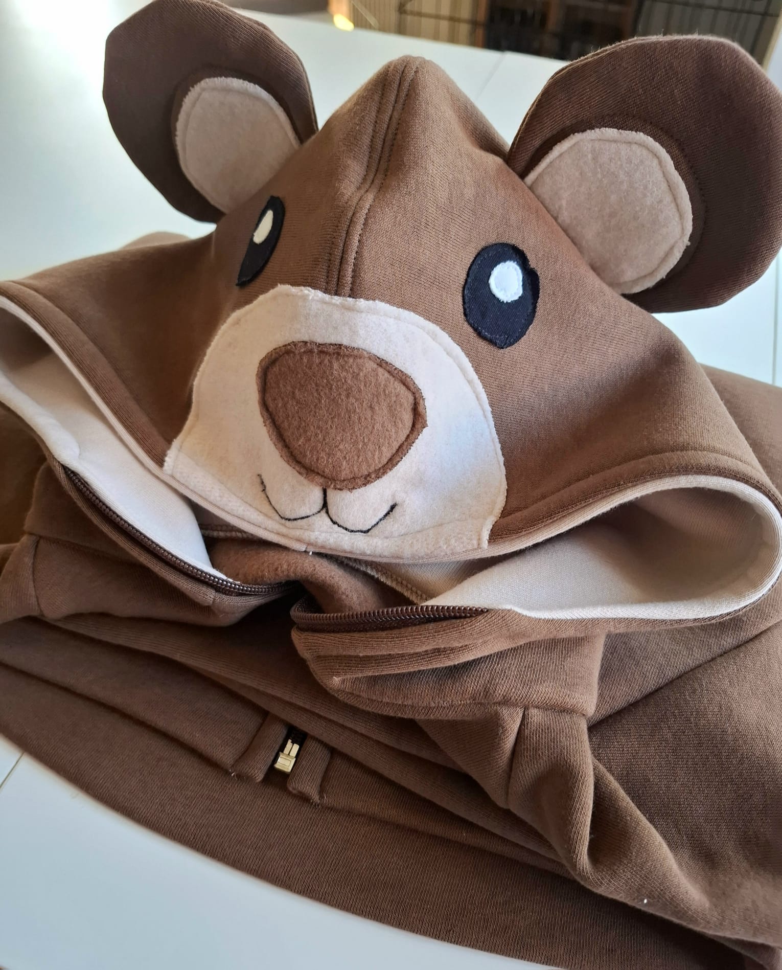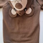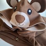 Bardzo gruba i mięsista bluza dziecięca. Bluza z kapturem i uszami i mordką misia wyszytą na kapturze . Uszyta jest z dzianiny dresowej drapanej premium o gramaturze aż 300g, w kolorze brązowym, zaś wykończenia bluzy w pięknym kolorze beżowym. Bardzo miękka i miła w dotyku.