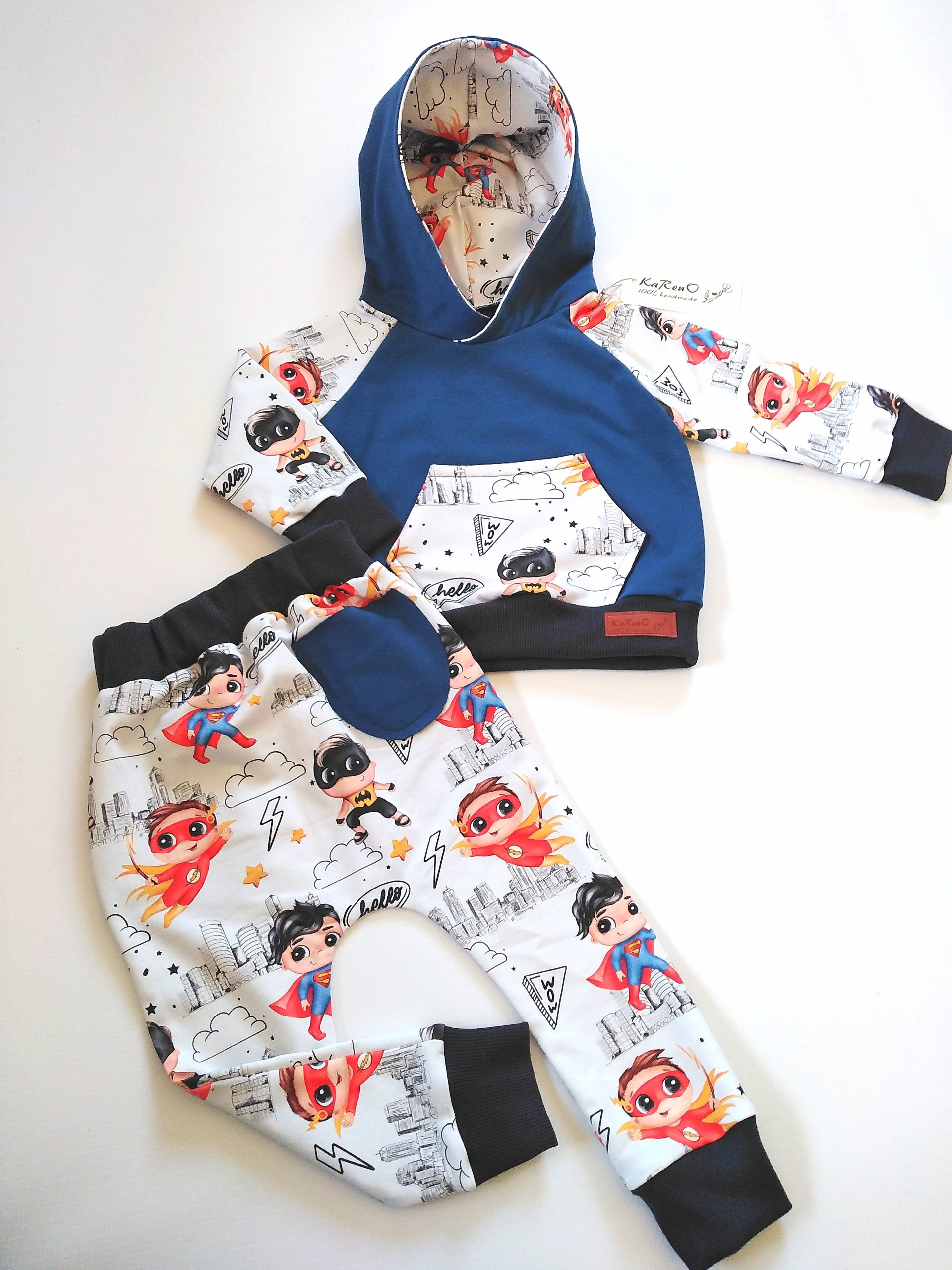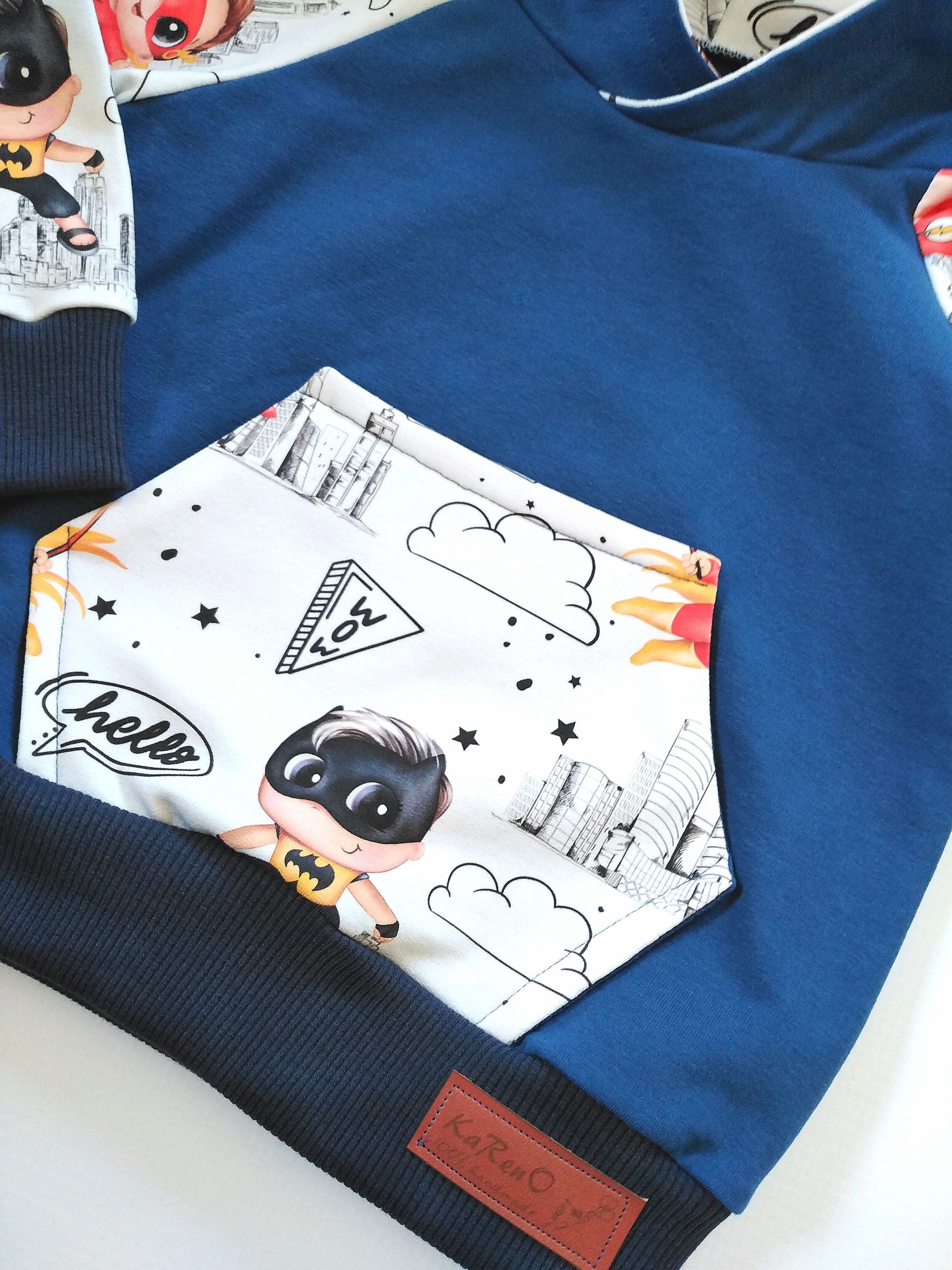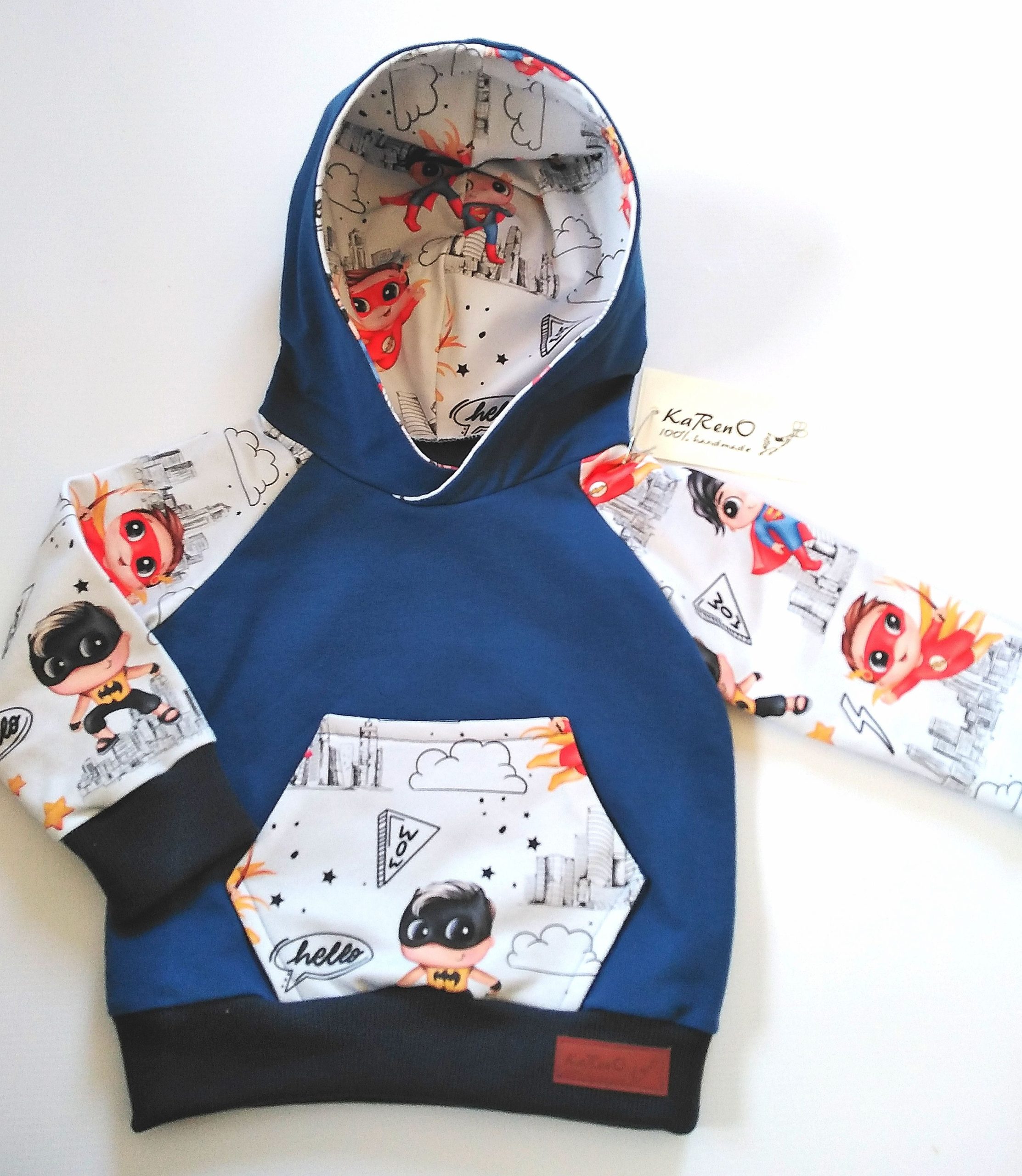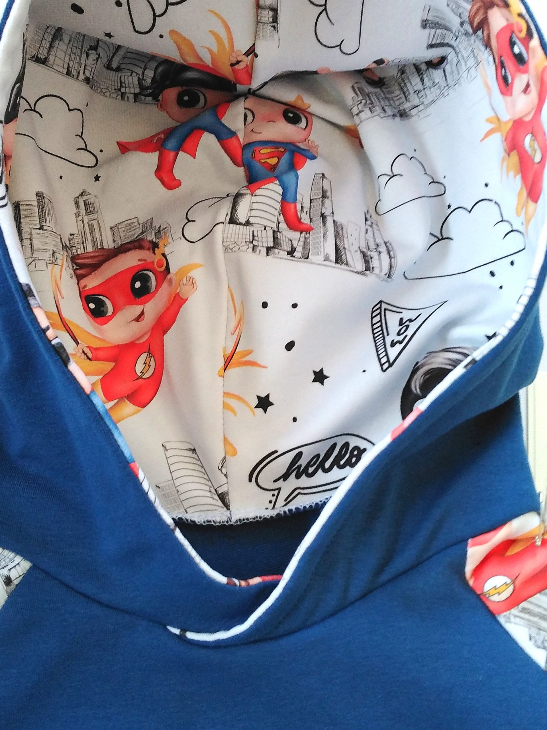 Bluza dziecięca z obszernym kapturem z dużą kieszenią na przodzie w modny wzór super bohaterów w połączeniu z dzianiną dresową w kolorze dżinsowym