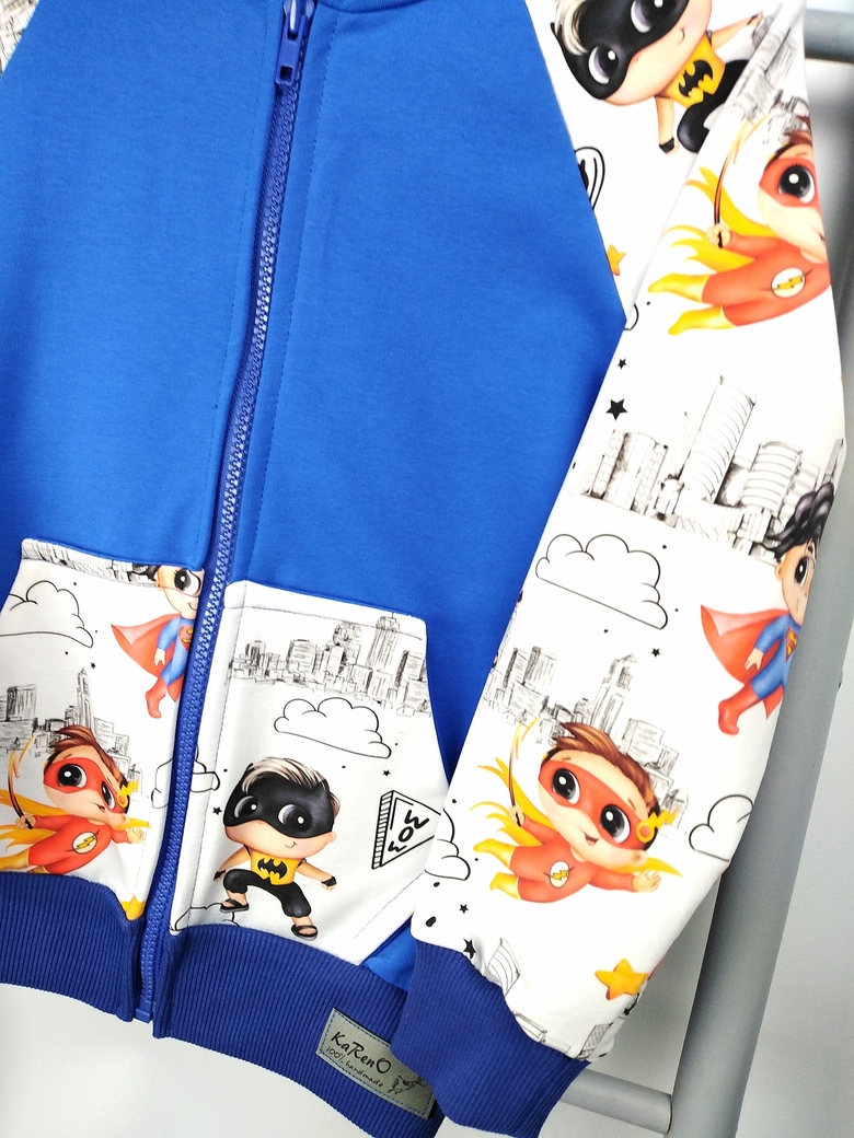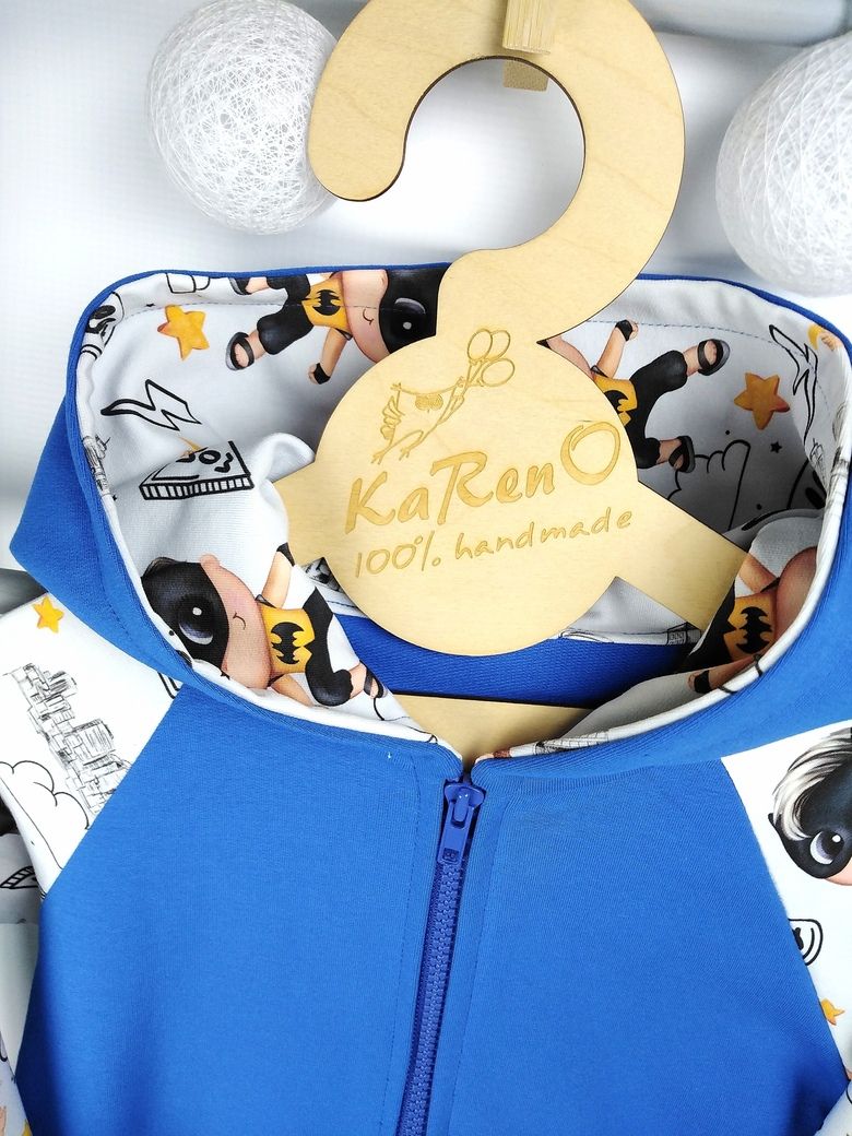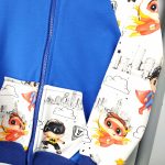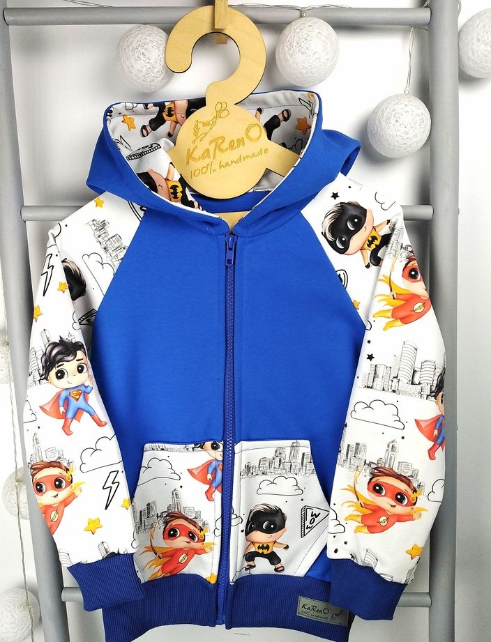 Bluza dziecięca z obszernym kapturem z dużą kieszenią na przodzie w modny wzór super bohaterów w połączeniu z dzianiną dresową w kolorze niebieskim zapinana na zamek