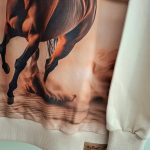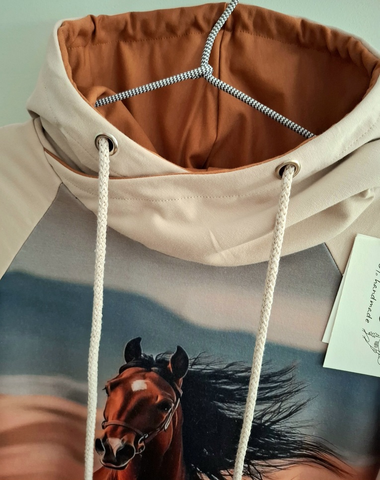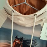 Piękna bluza z kapturem z wizerunkiem brązowego konia w galopie na przodzie. Kolor bluzy jasny beż.  Uszyta jest z dzianiny dresowej pętelkowej premium, bardzo miękka i miła w dotyku. Nadruk wykonany jest metodą cyfrową. Dzięki domieszce elastanu do tkaniny nasze bluzy są bardzo wygodne i nie krępują ruchów.