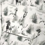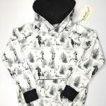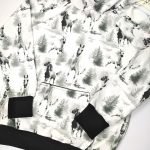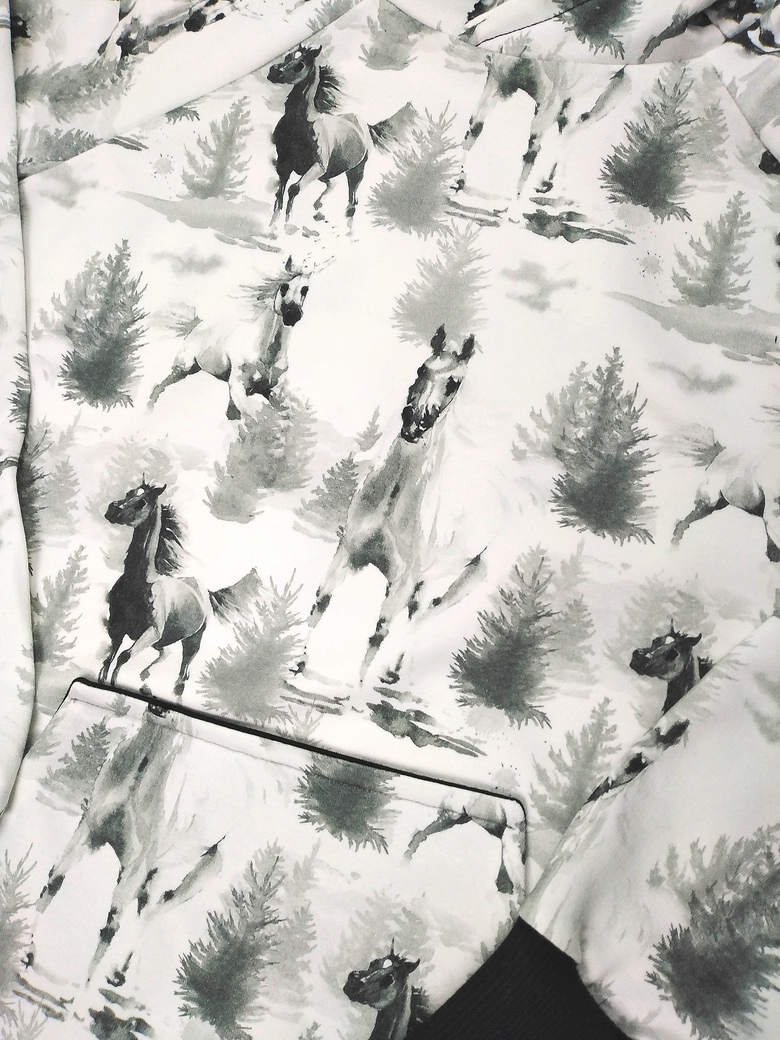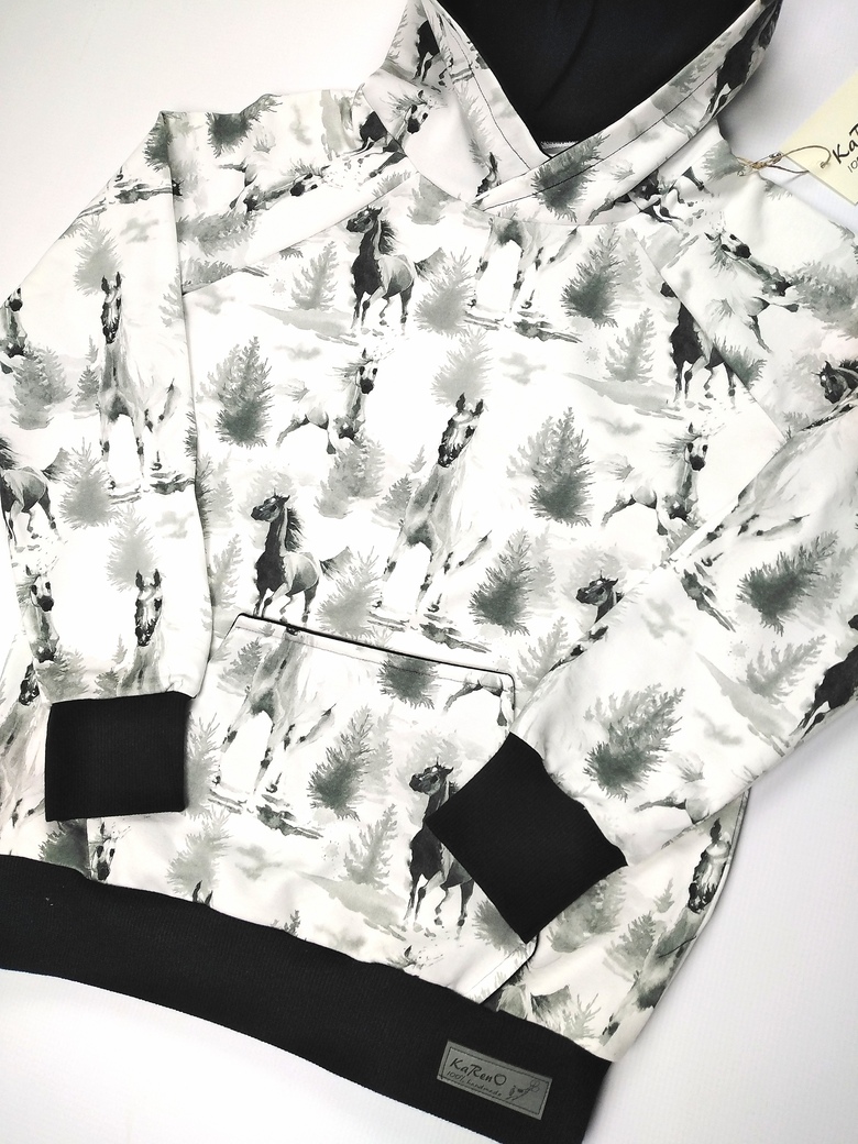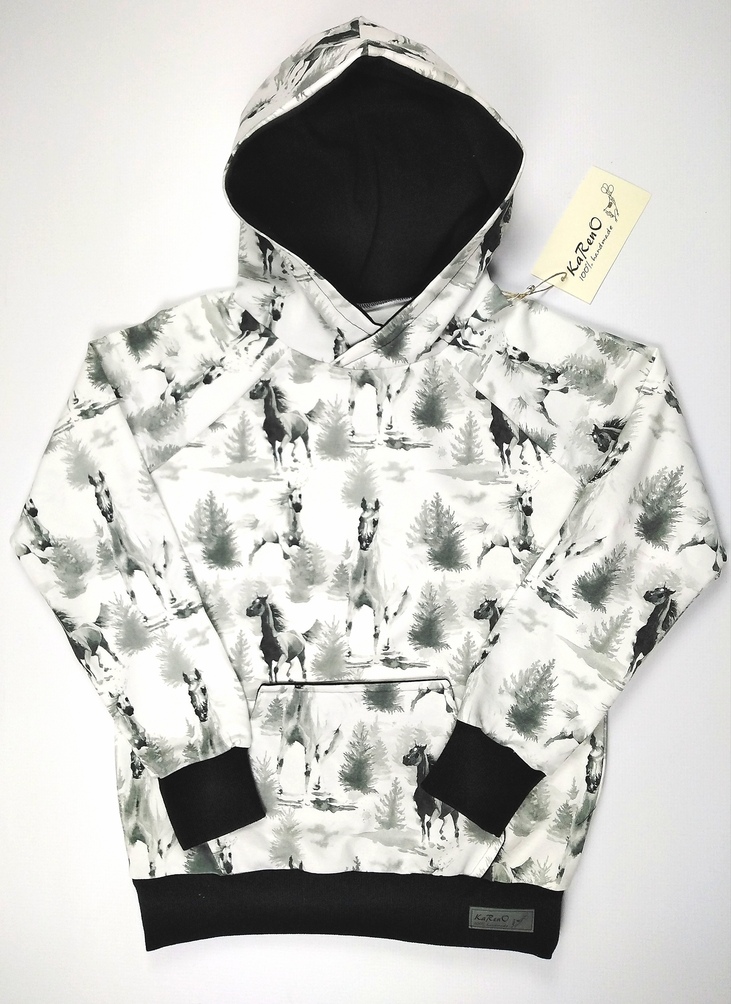 Bluza z kapturem z obszernym kapturem z dużą kieszenią na przodzie w piękny wzór koni w kolorystyce szarości z wykończeniami w kolorze czarnym