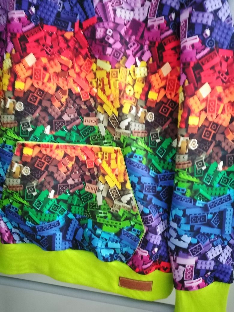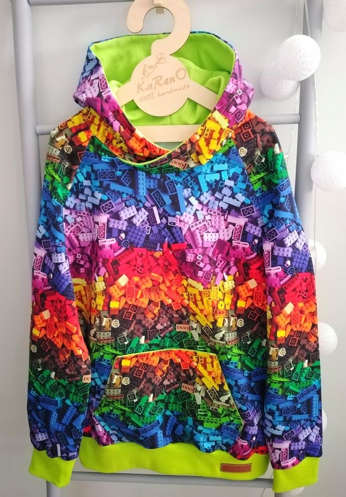 Bluza z kapturem z obszernym kapturem z dużą kieszenią na przodzie. Uszyta jest z dzianiny dresowej pętelkowej premium w piękny kolorowych klocków , bardzo miękka i miła w dotyku. Nadruk wykonany jest metodą komputerową.Dzięki domieszce elastanu do tkaniny nasze bluzy są bardzo wygodne i nie krępują ruchów.