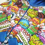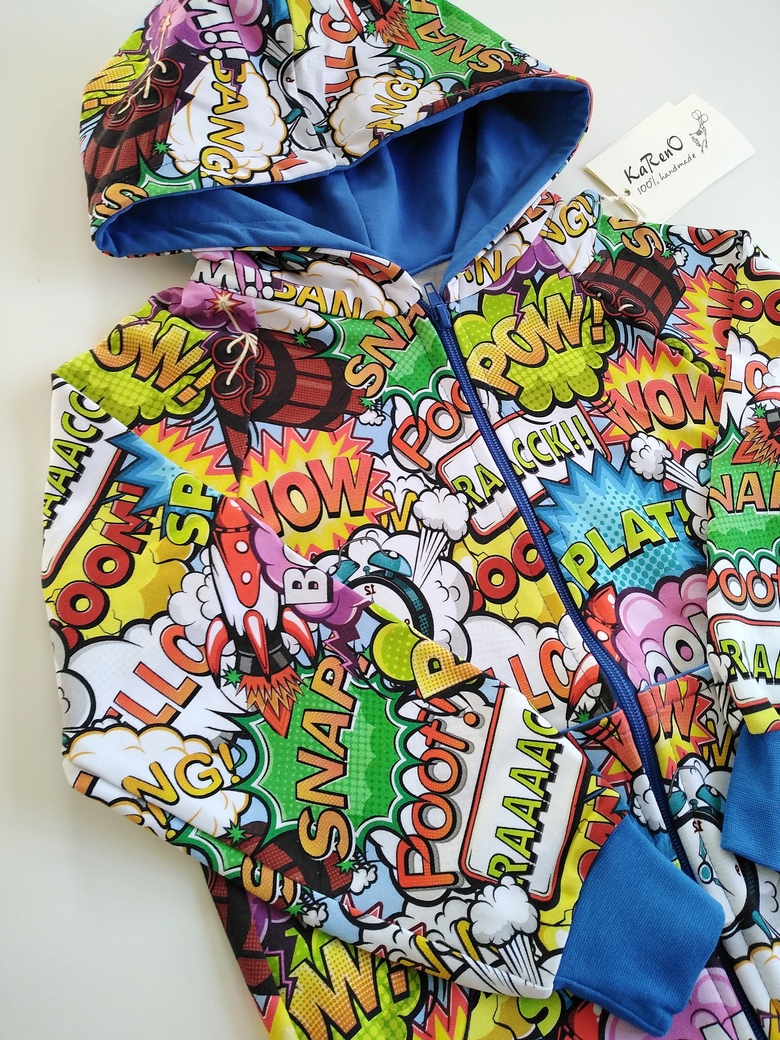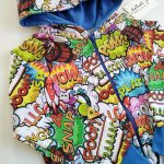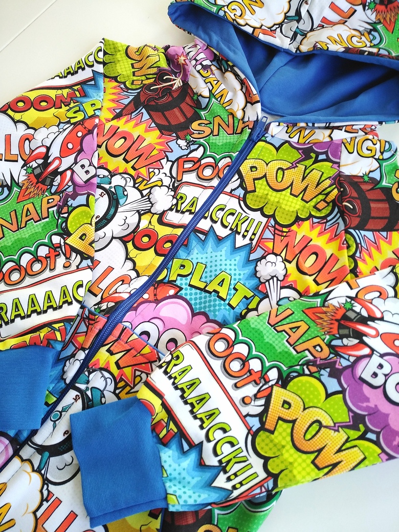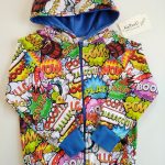 Bluza dziecięca z kapturem zapinana na zamek w piękny print kolorowego komiksu na jasnym tle. Całość wykończona w kolorze niebieskim chabrowym. Uszyta jest z dzianiny dresowej pętelkowej premium , bardzo miękka i miła w dotyku. Nadruk wykonany jest metodą komputerową. Dzięki domieszce elastanu do tkaniny nasze bluzy są bardzo wygodne i nie krępują ruchów.