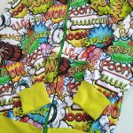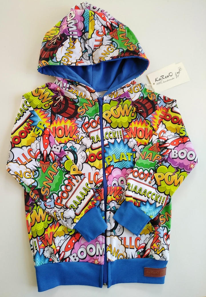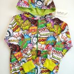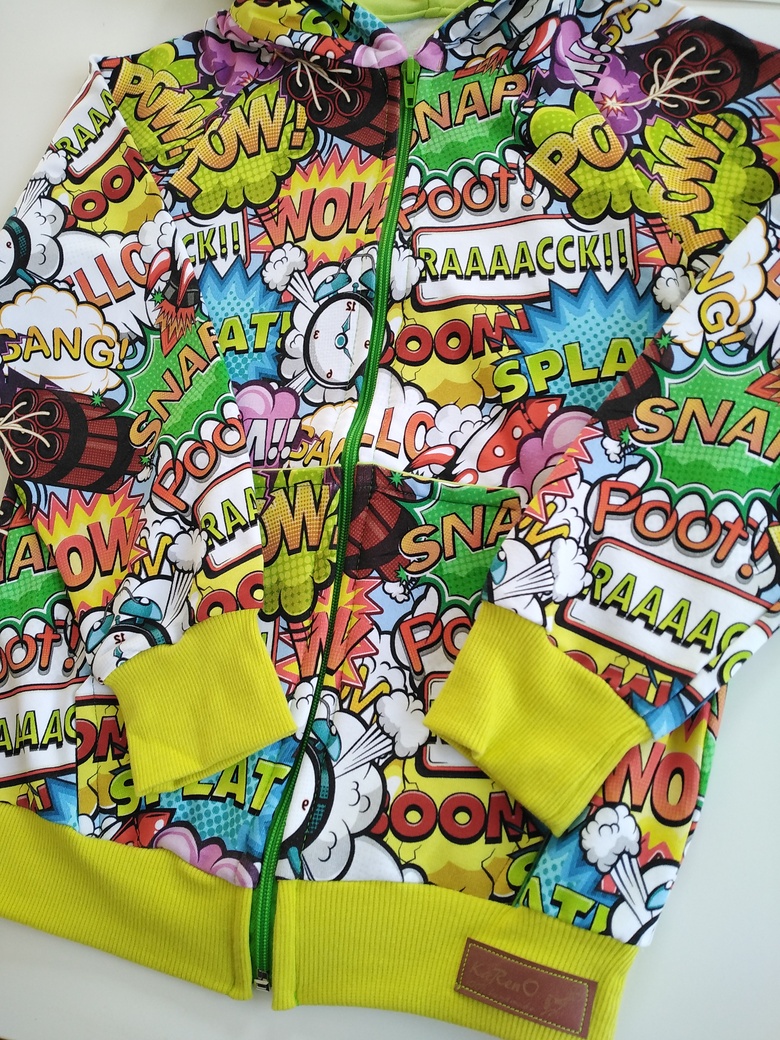 Bluza dziecięca z kapturem zapinana na zamek w piękny print kolorowego komiksu. Całość wykończona w kolorze limonki. Uszyta jest z dzianiny dresowej pętelkowej premium , bardzo miękka i miła w dotyku. Nadruk wykonany jest metodą komputerową. Dzięki domieszce elastanu do tkaniny nasze bluzy są bardzo wygodne i nie krępują ruchów.