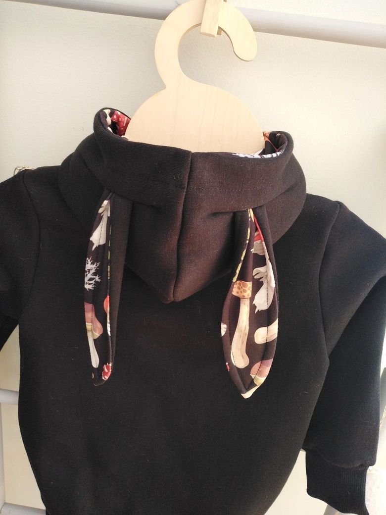 Bluza dziecięca na zamek z obszernym kapturem i długimi uszami w pięknym kolorze czarnym. Środek kaptura i uszu w print kolorowych grzybków