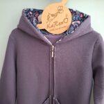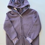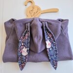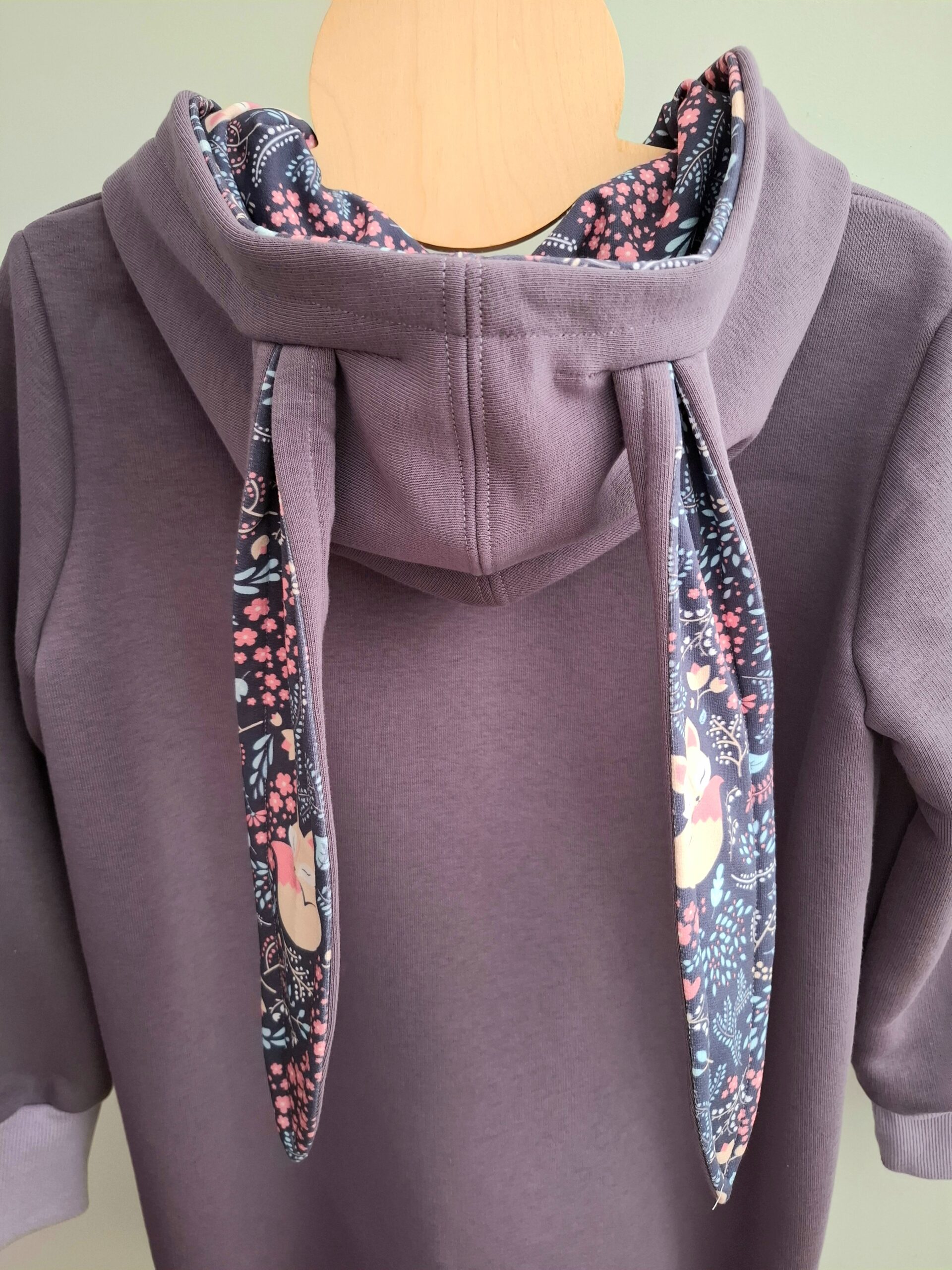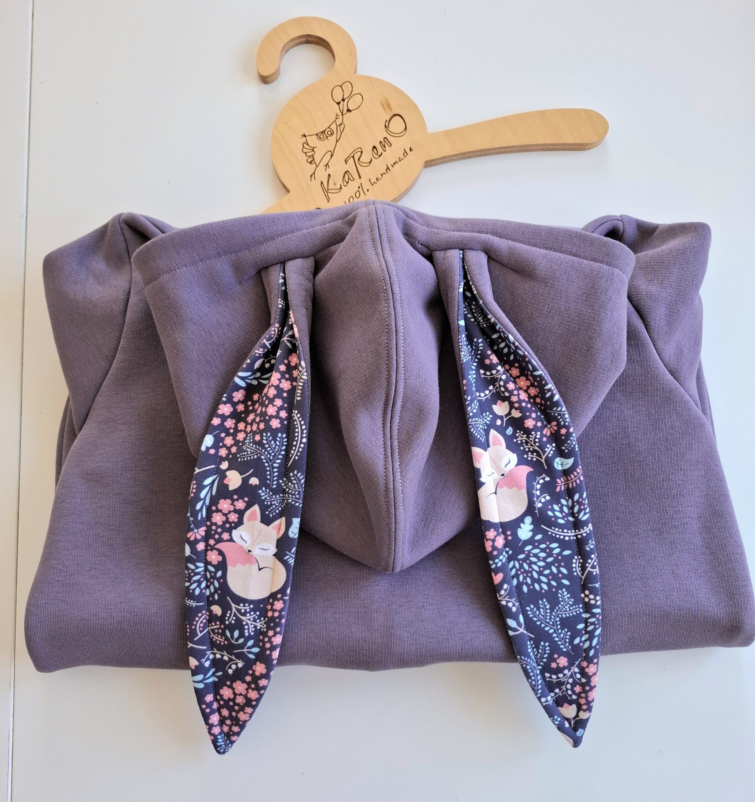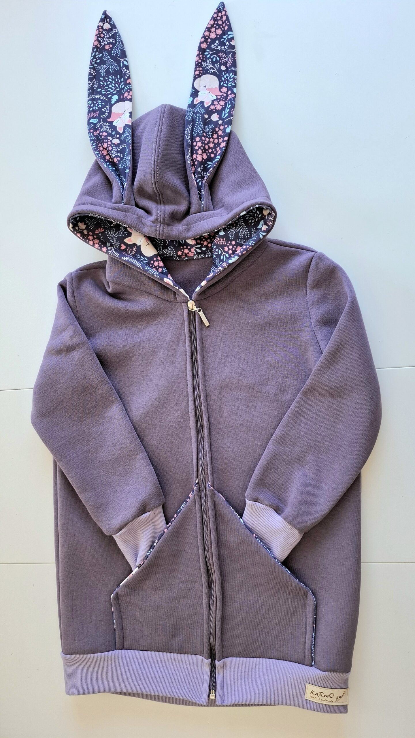 Bluza dziecięca na zamek z obszernym kapturem i długimi uszami w pięknym kolorze fioletu. Środek kaptura i uszu w print klisków