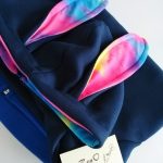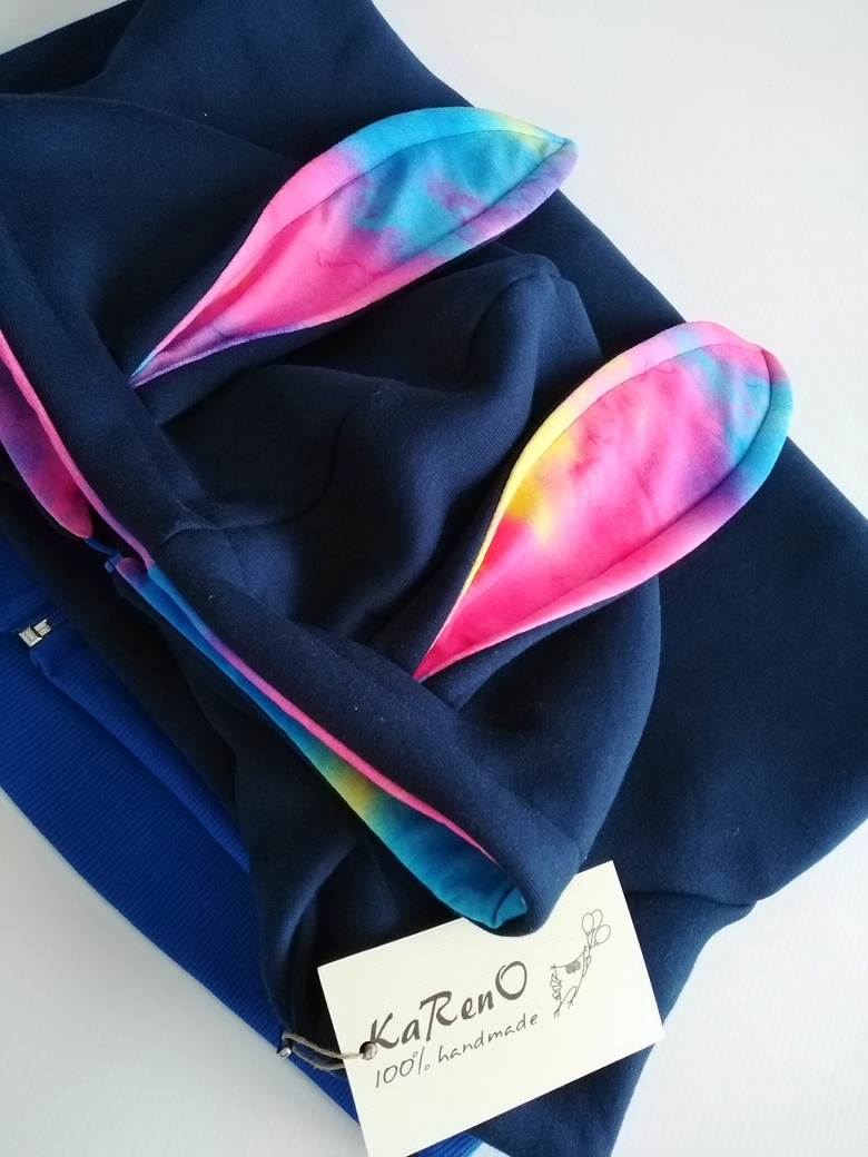 Bluza dziecięca na zamek z obszernym kapturem i długimi uszami w pięknym kolorze granatu. Środek kaptura i uszu w kolorze multi kolorowym