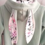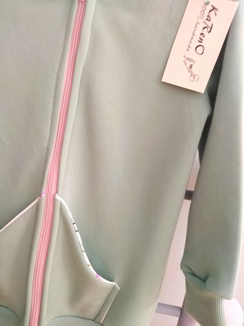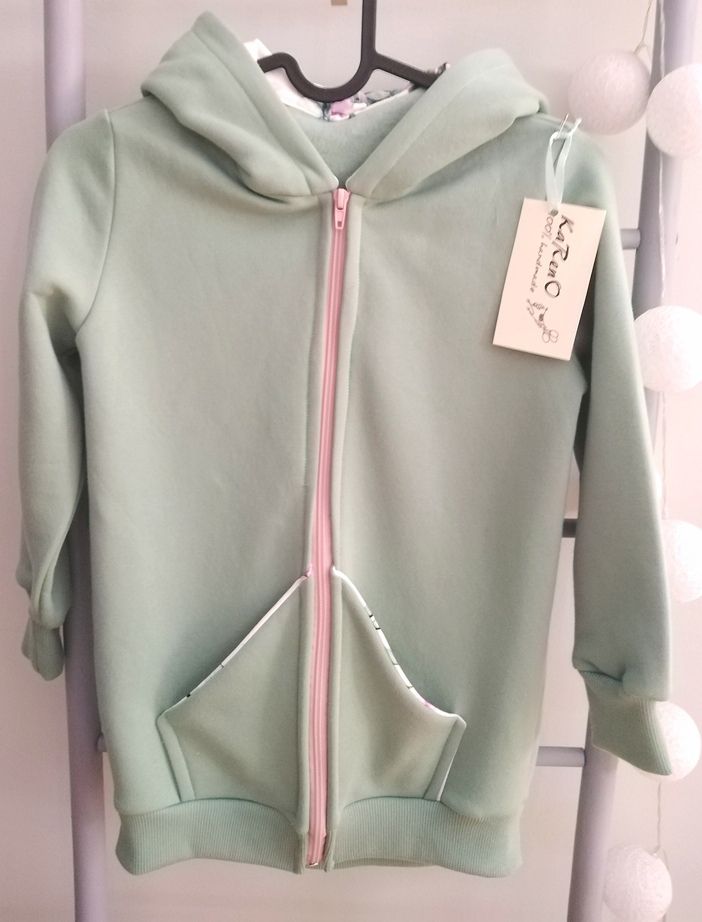 Bluza dziecięca na zamek z obszernym kapturem i długimi uszami w pięknym kolorze brudnej mięty. Środek kaptura i uszu w print kwiatów.