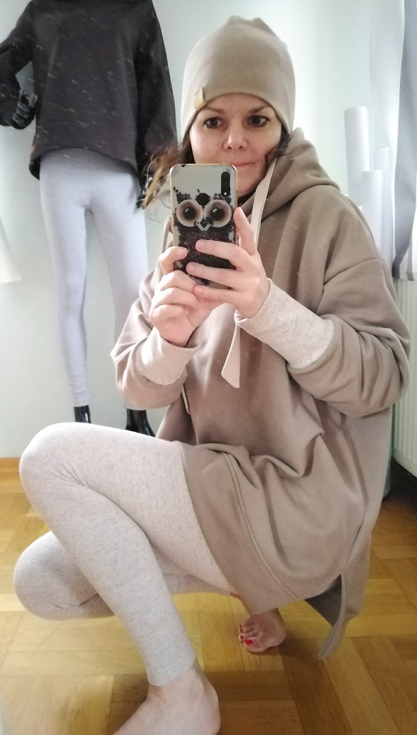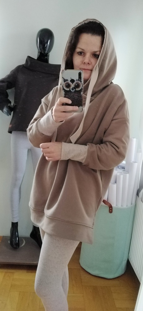 Piękna mięsista bluza damska w kolorze soczystej ciepłego brązu. Dzianina dresowa drapana premium z misiem pod spodem. Bardzo ciepła. Fason owersize z obniżoną linią ramion, rozcięcia u dołu bluzy zapewniają wygodę i komfort noszenia, nie krępuje ruchów. Uroku całości dodaje obszerny kaptur.