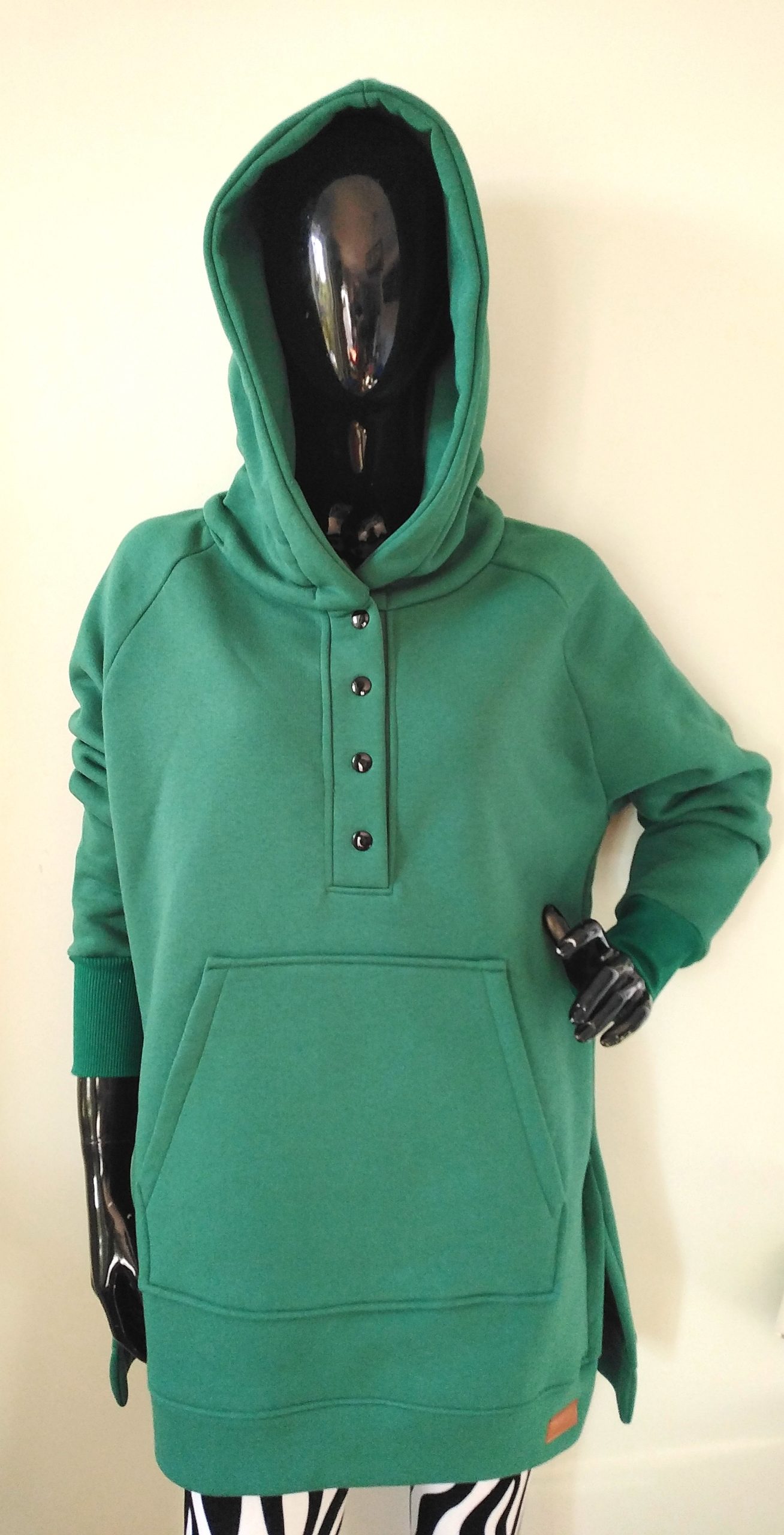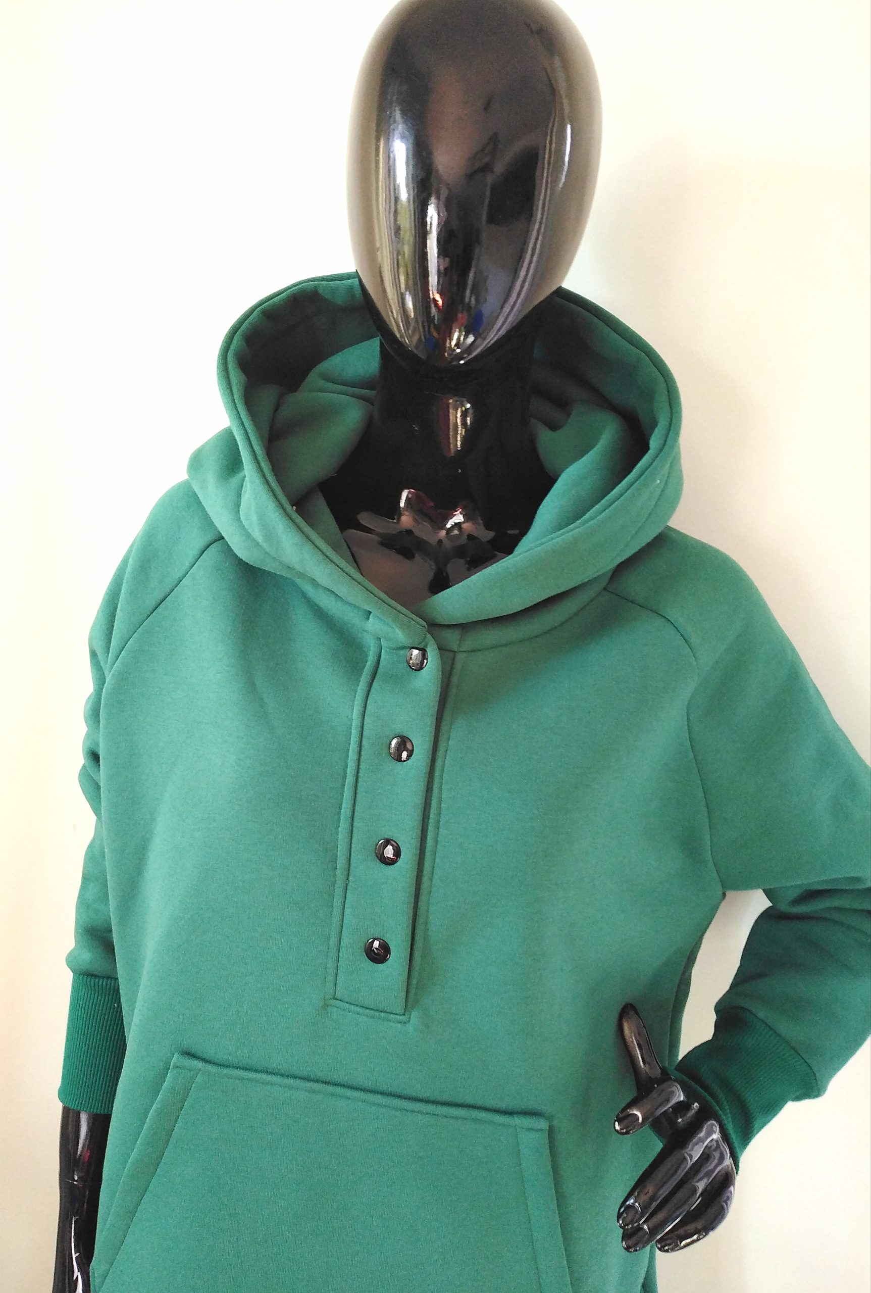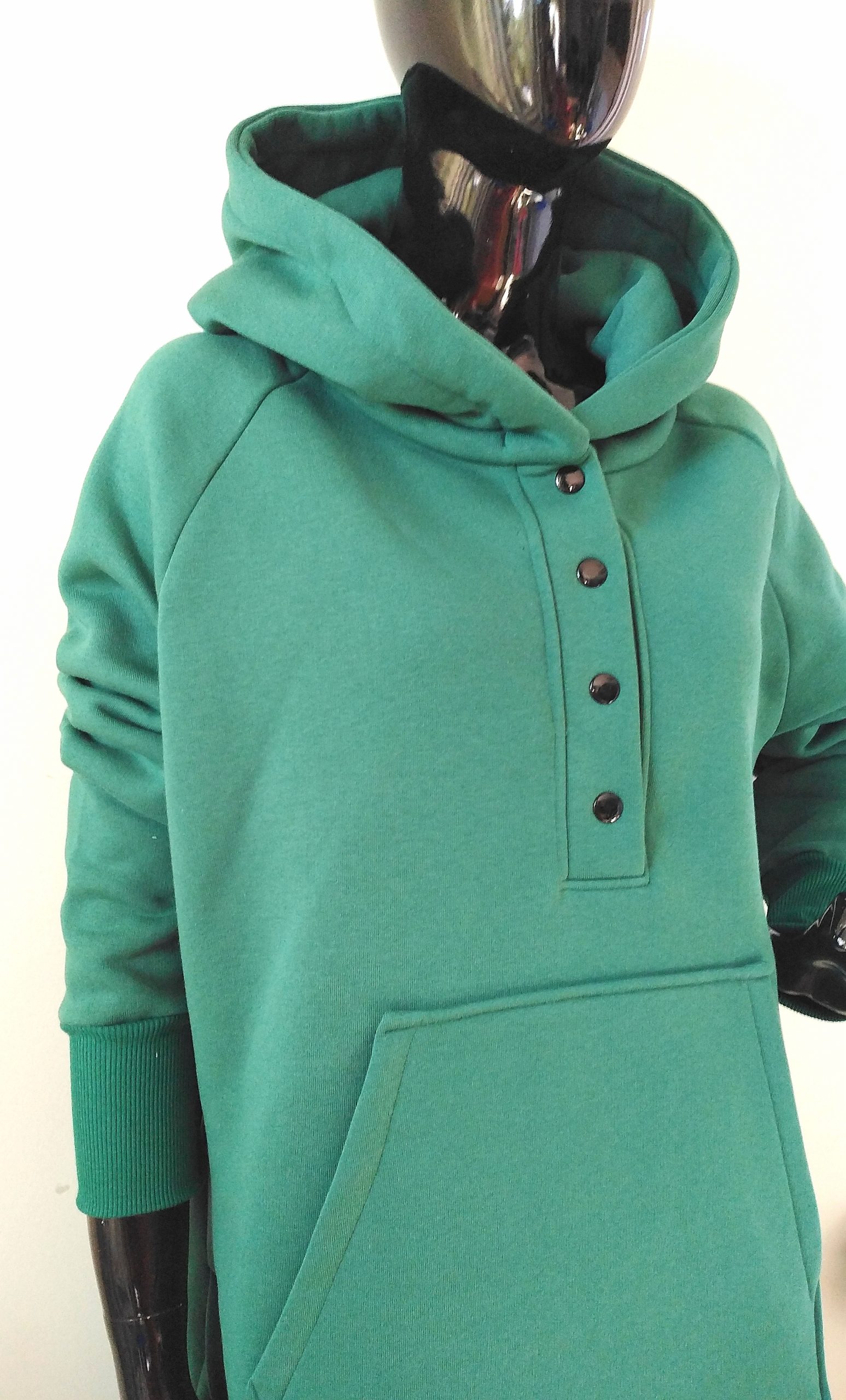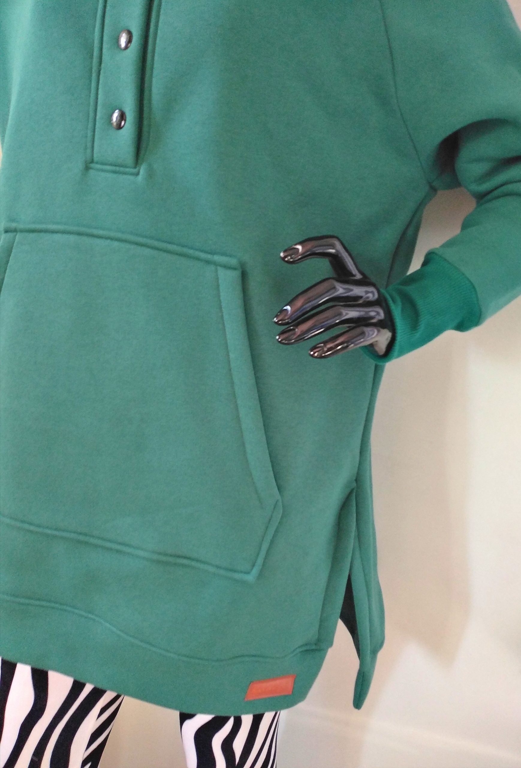 Piękna mięsista bluza damska w kolorze zielonym. Dzianina dresowa drapana premium z misiem pod spodem. Bardzo ciepła. Fason z kapturem, zapinana na metalowe napy, rozcięcia u dołu bluzy zapewniają wygodę i komfort noszenia, nie krępuje ruchów. Uroku całości dodaje obszerny kaptur.