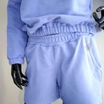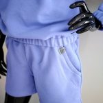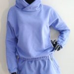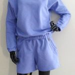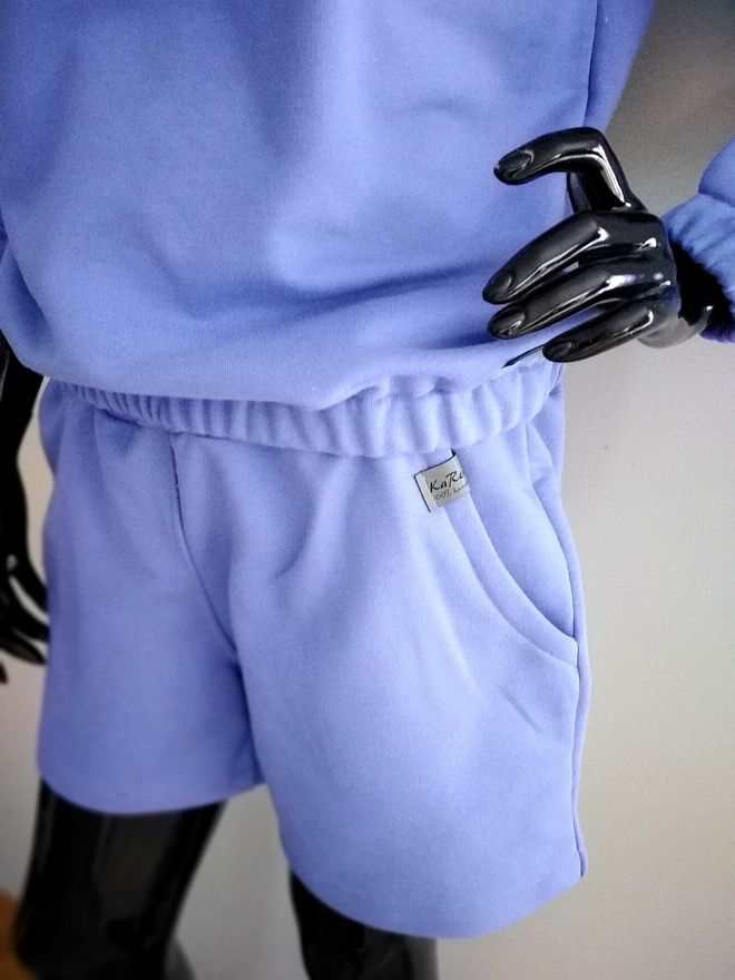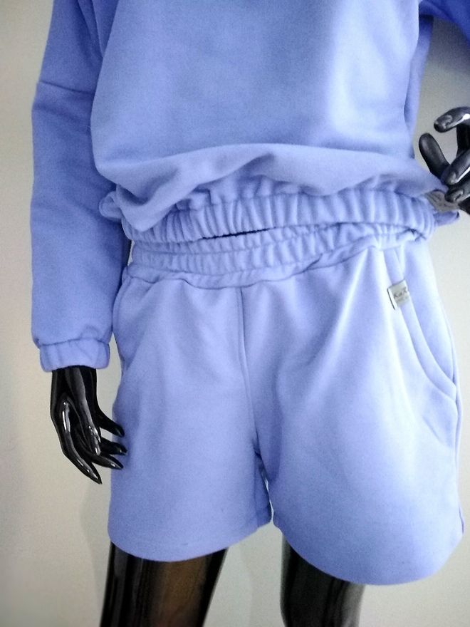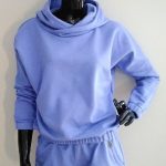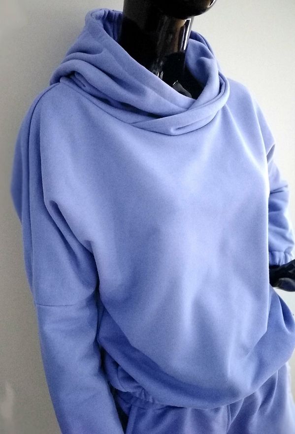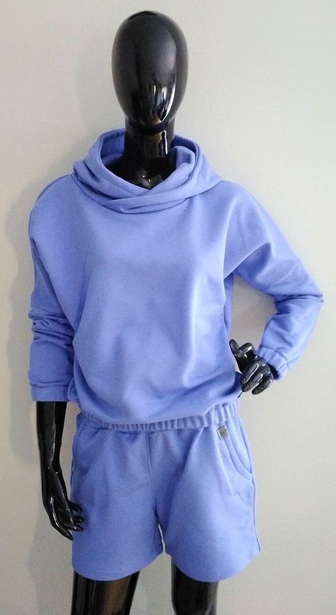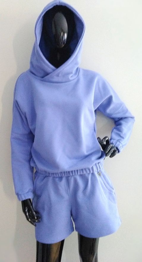 Piękne damskie komplet dresowy z dzianiny dresowej. Wygodny bluza typu nietoperz z kapturem z długim rękawem z gumeczkami ora z spodenkami krótkimi z kieszeniami. Kolor veri peri.