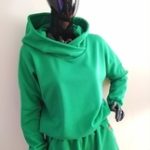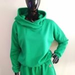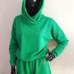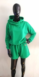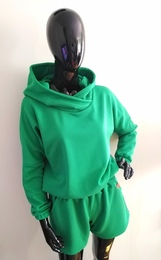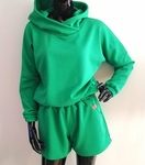 Piękne damskie komplet dresowy z dzianiny dresowej. Wygodny bluza typu nietoperz z kapturem z długim rękawem z gumeczkami ora z spodenkami krótkimi z kieszeniami. Kolor soczystej zieleni.