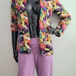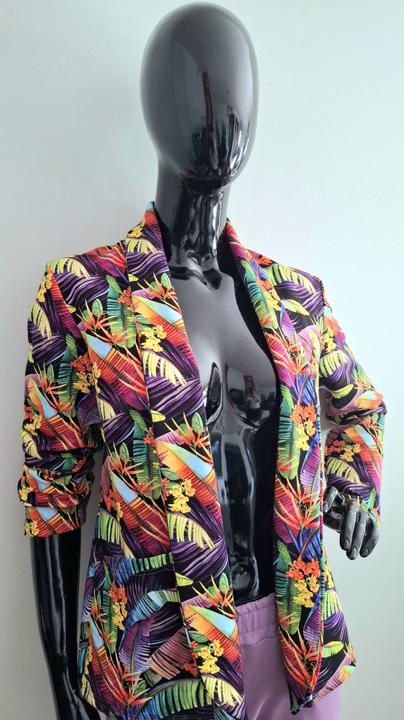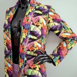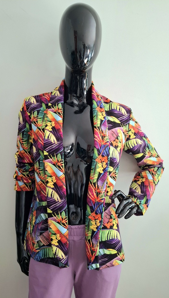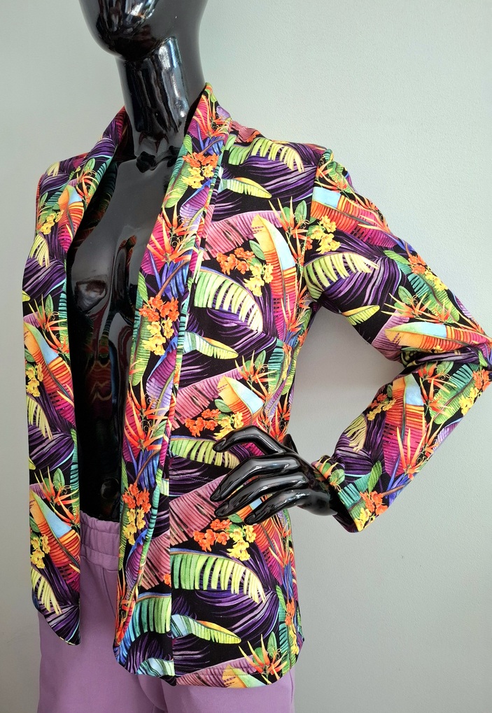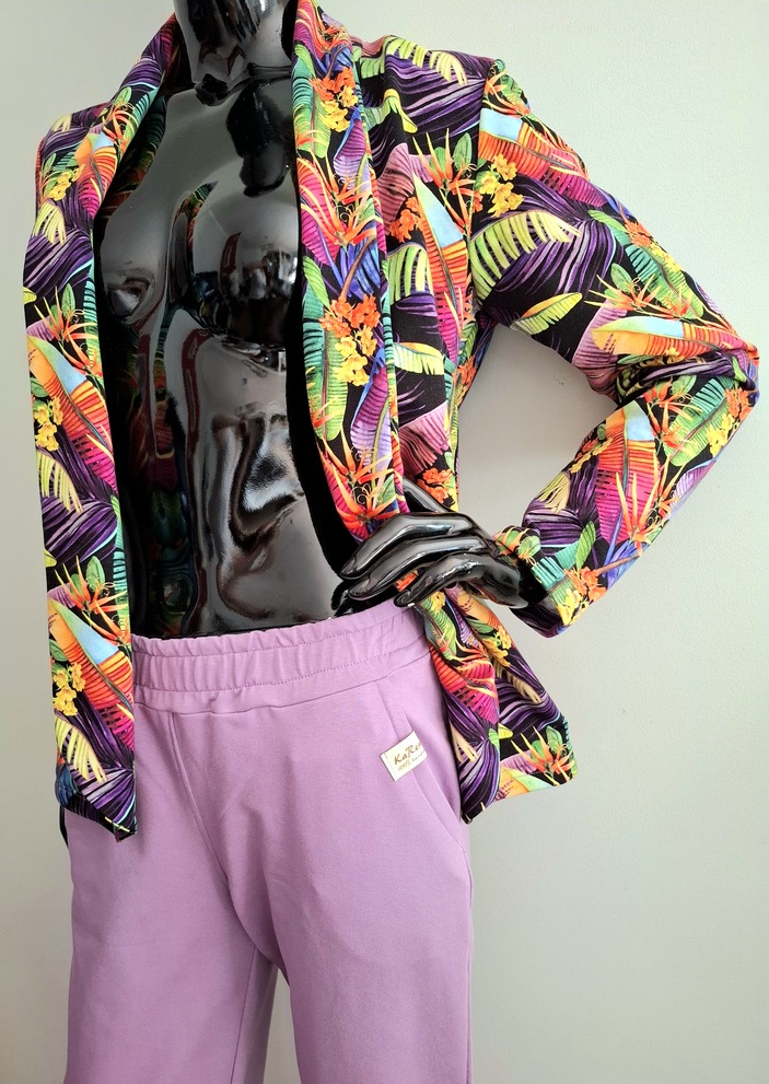 Przepiękny print kolorowych liści w połączeniu ze spodniami w kolorze lila. Całość uszyta jest z dzianiny dresowej premium drukowanej cyfrowo. Dzięki domieszce elastanu zestaw jest bardzo miękki i wygodny i nie krępuje ruchów. Spodnie mają wyższy stan, z kieszeniami i zwężonej nogawce ku dołowi.