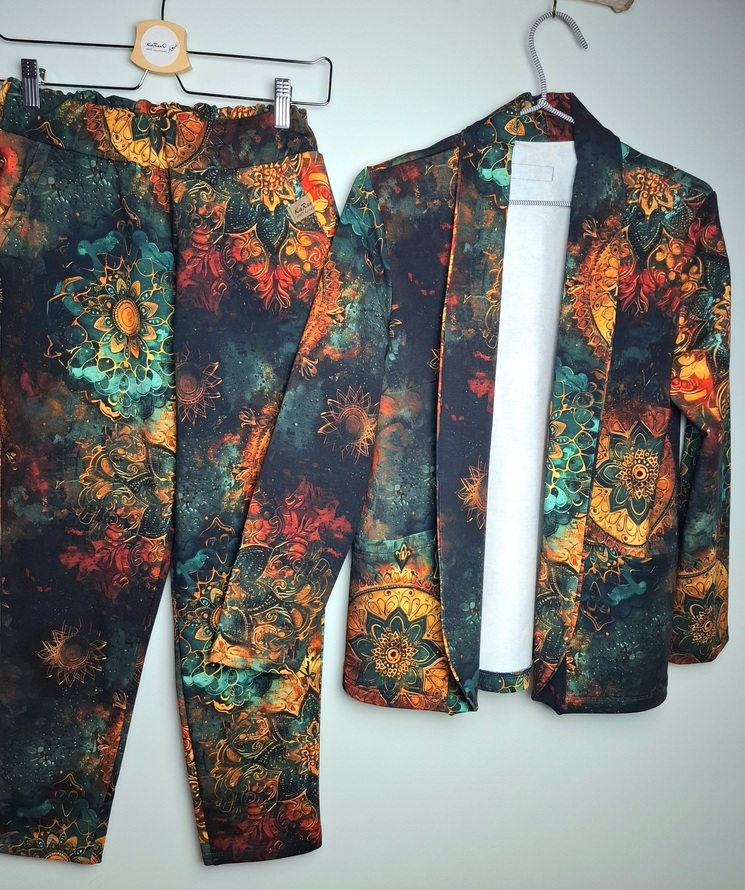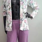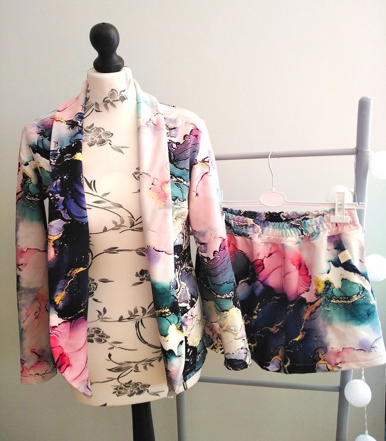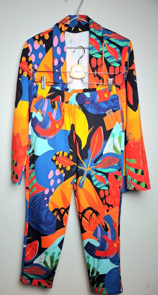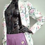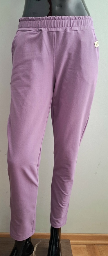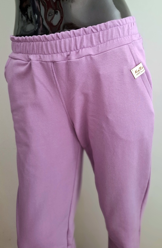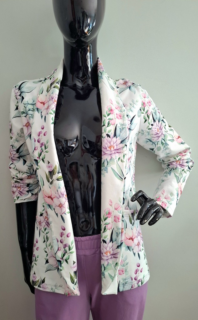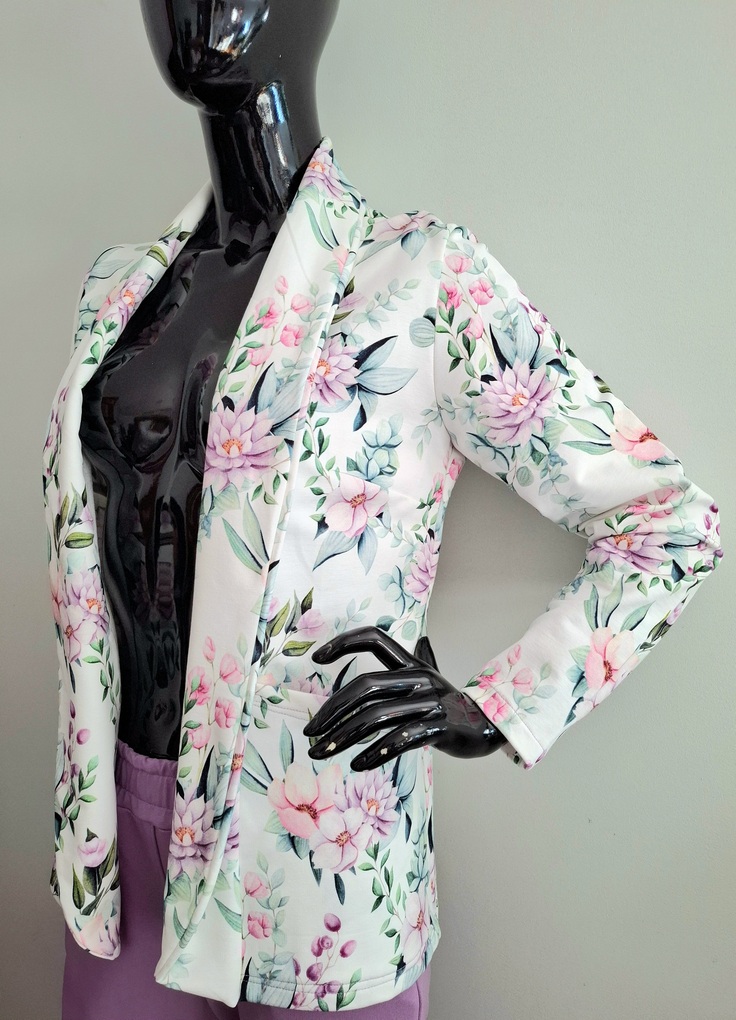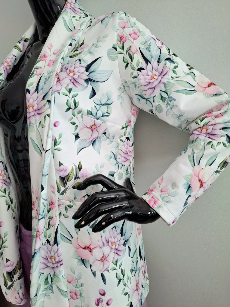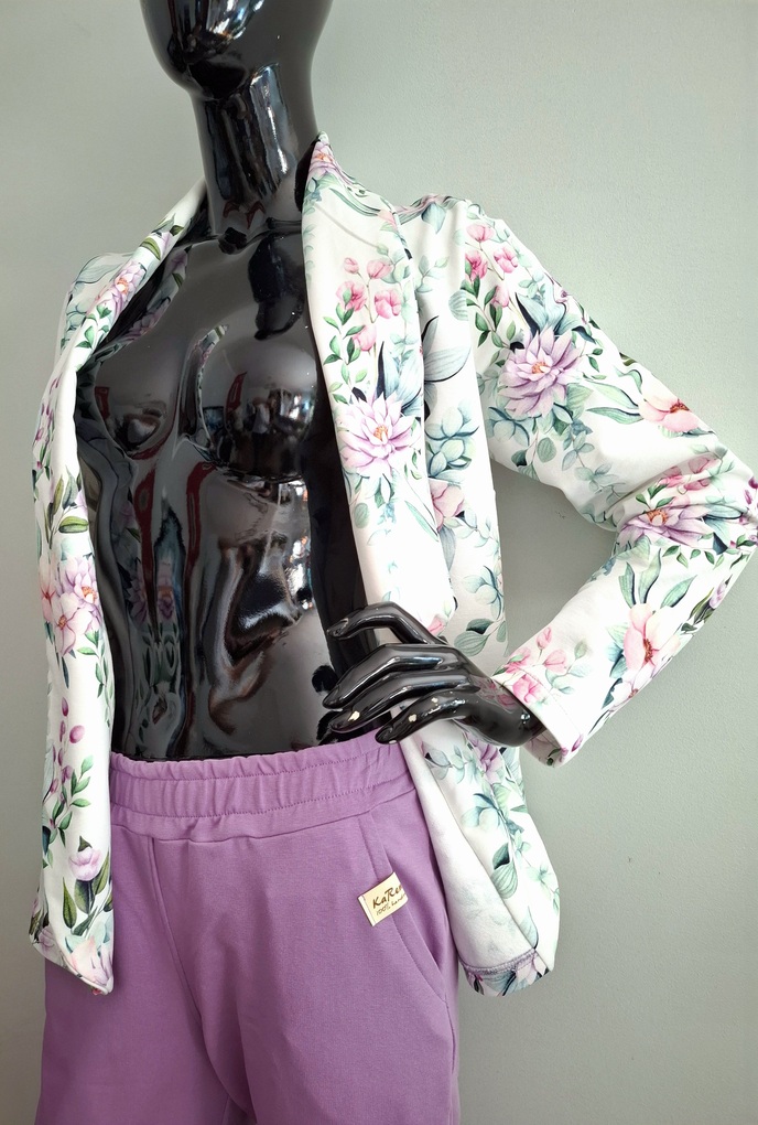 Przepiękny print pastelowych kwiatów w połączeniu ze spodniami w kolorze lila. Całość uszyta jest z dzianiny dresowej premium drukowanej cyfrowo. Dzięki domieszce elastanu zestaw jest bardzo miękki i wygodny i nie krępuje ruchów. Spodnie mają wyższy stan, z kieszeniami i zwężonej nogawce ku dołowi.