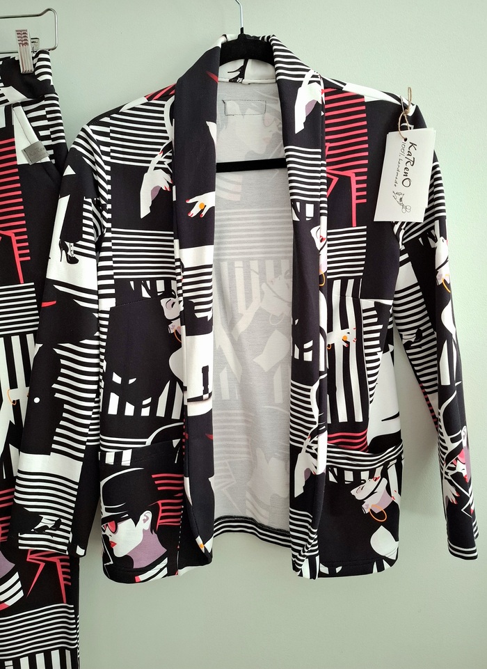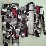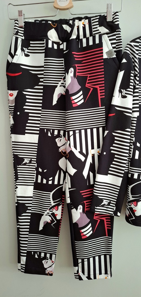 Przepiękny print biało czarny z elementami czerwieni, uszyty z dzianiny dresowej premium drukowanej cyfrowo. Dzięki domieszce elastanu zestaw jest bardzo miękki i wygodny i nie krępuje ruchów. Spodnie mają wyższy stan, z kieszeniami i zwężonej nogawce ku dołowi.