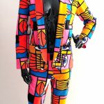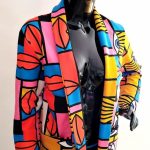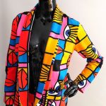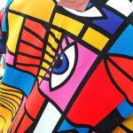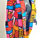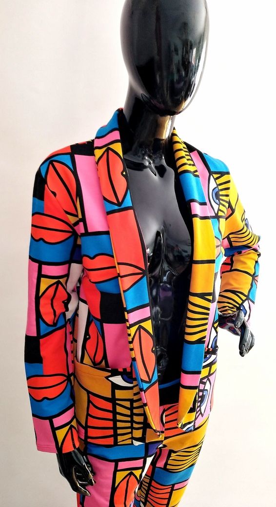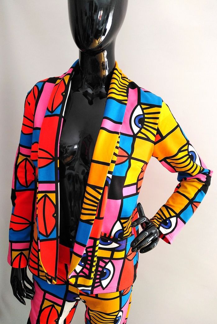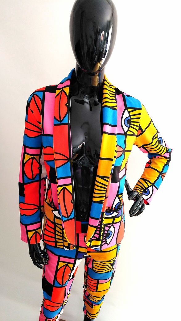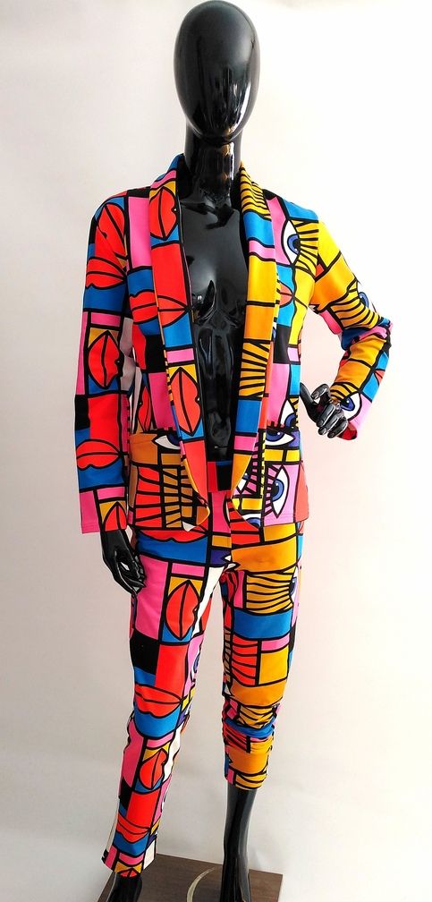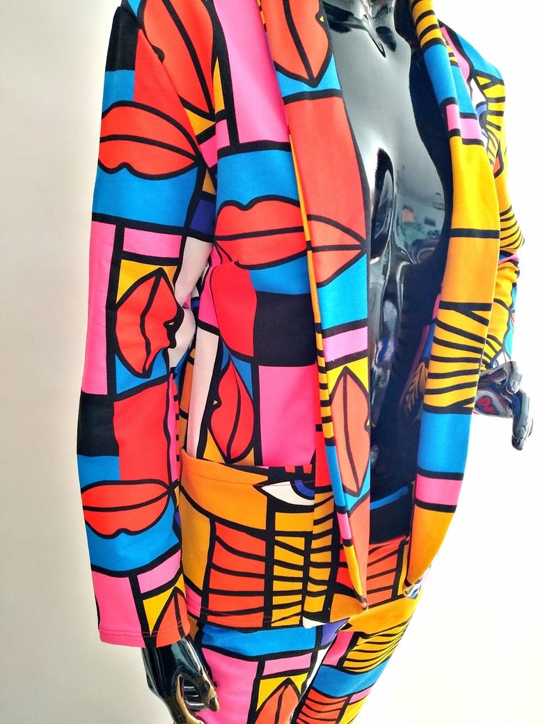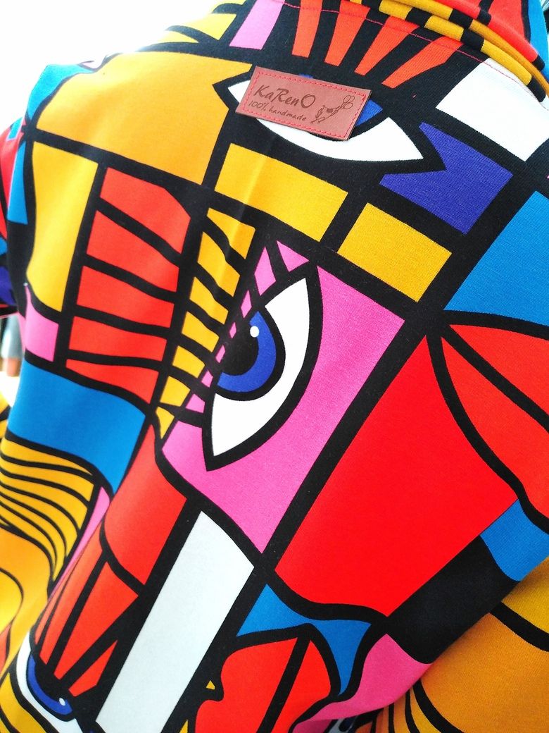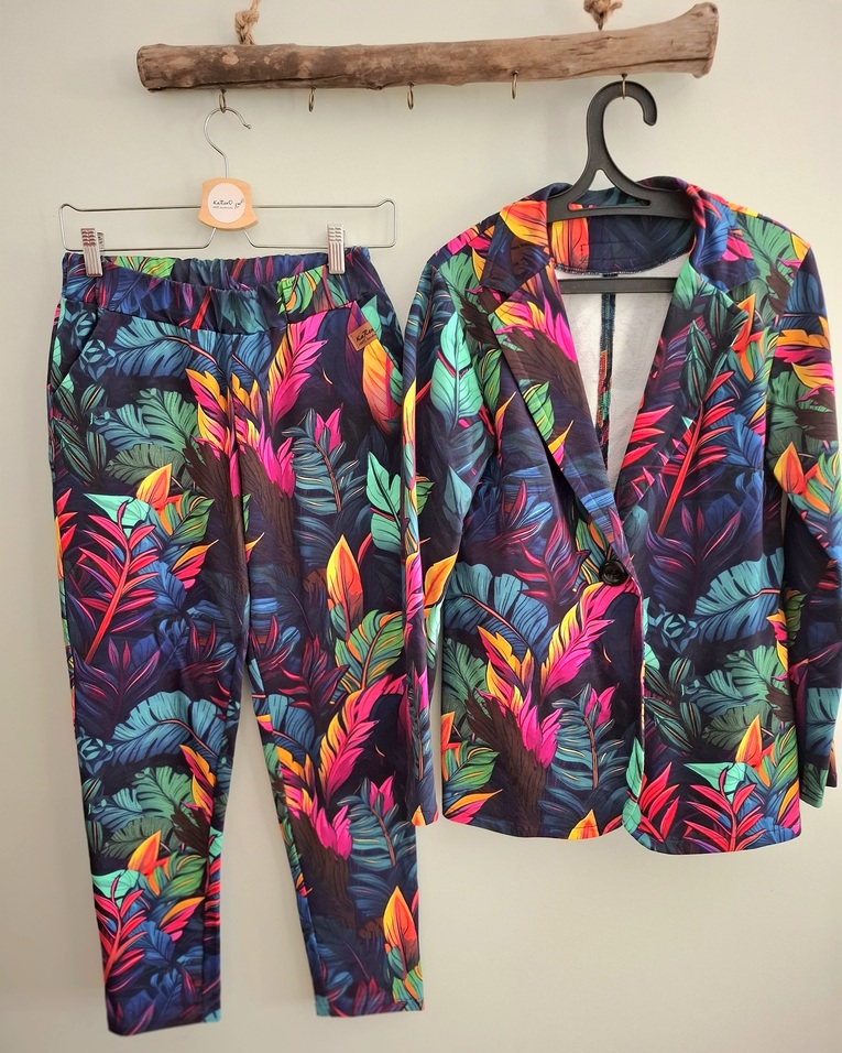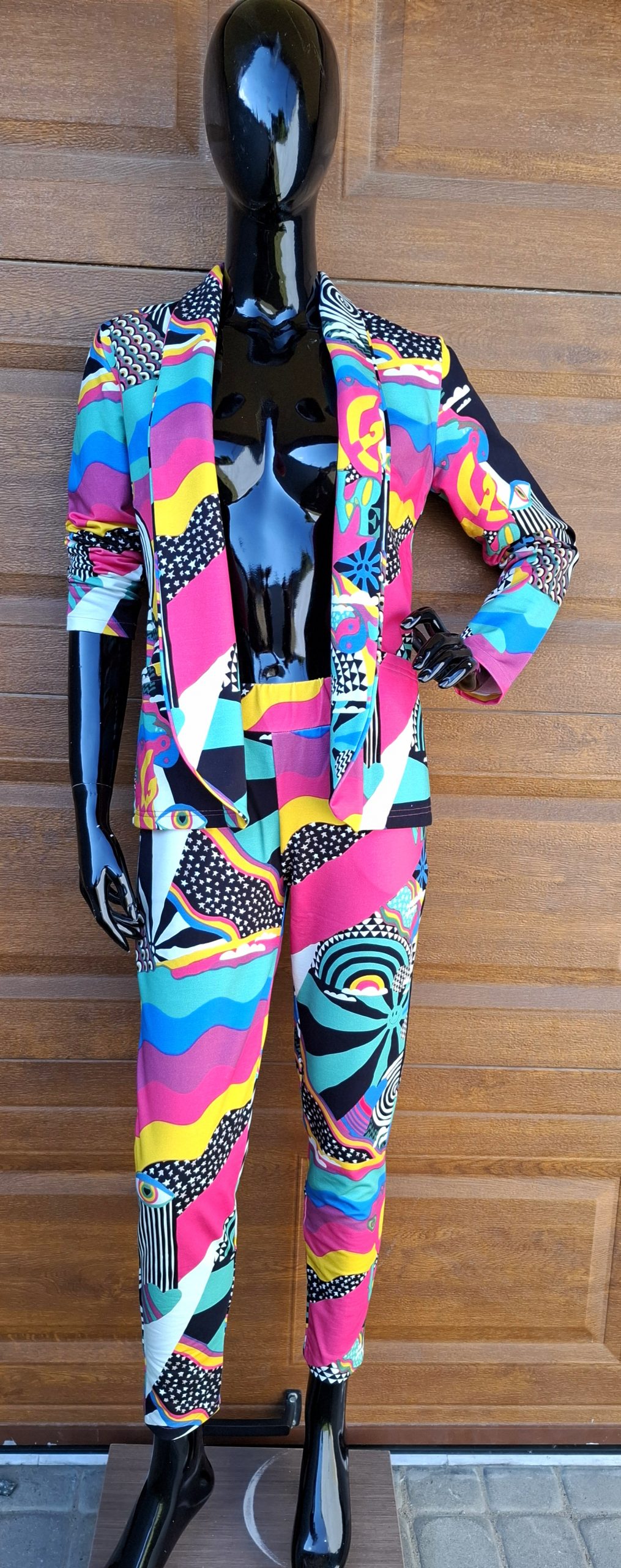 Przepiękny print kolorowy, geometryczny, uszyty z dzianiny dresowej premium drukowanej cyfrowo. Dzięki domieszce elastanu zestaw jest bardzo miękki i wygodny i nie krępuje ruchów. Spodnie mają wyższy stan, z kieszeniami i zwężonej nogawce ku dołowi.