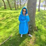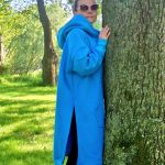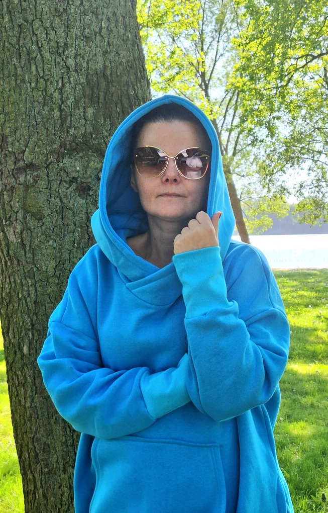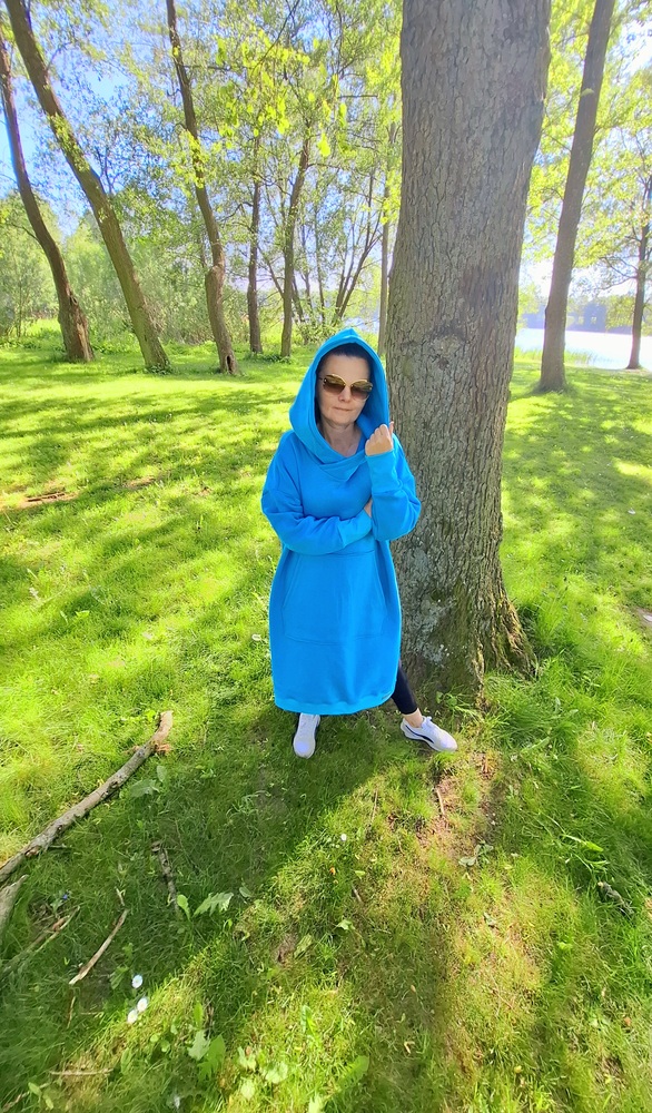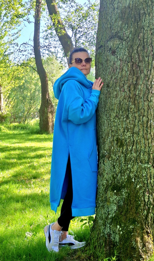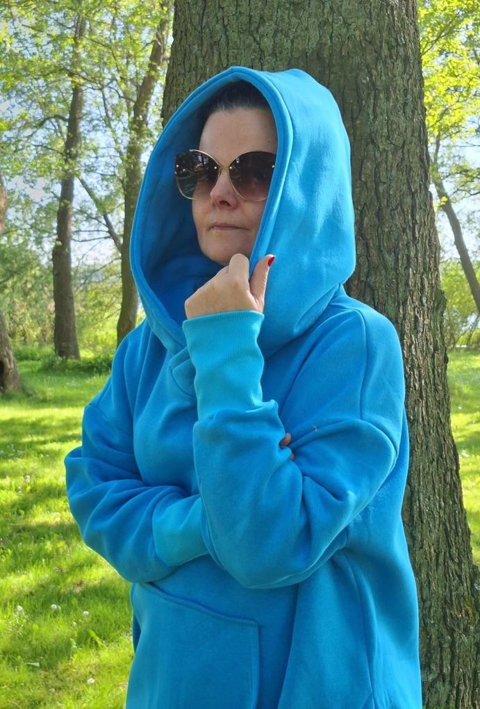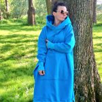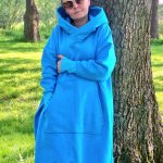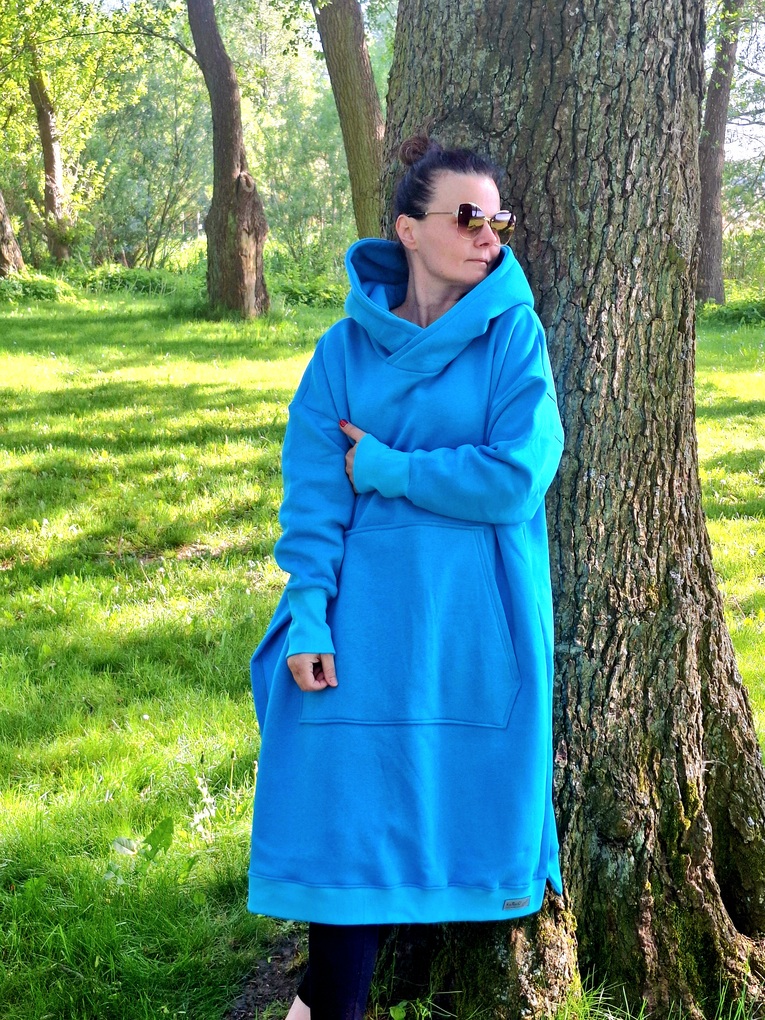 Przepiękna i zjawiskowa damska długa bluza. Fason długi za kolano, rozcięcia po bokach. Bardzo duży i obszerny kaptur, oraz duża kieszeń na przodzie. Całość uszyta jest z dzianiny dresowej drapanej premium (na misiu pod spodem) o gramaturze ok 300g. Całość w kolorze turkusowym.