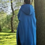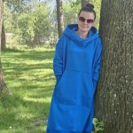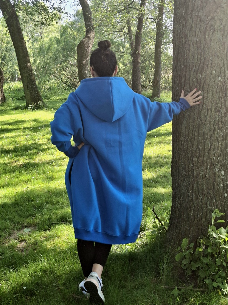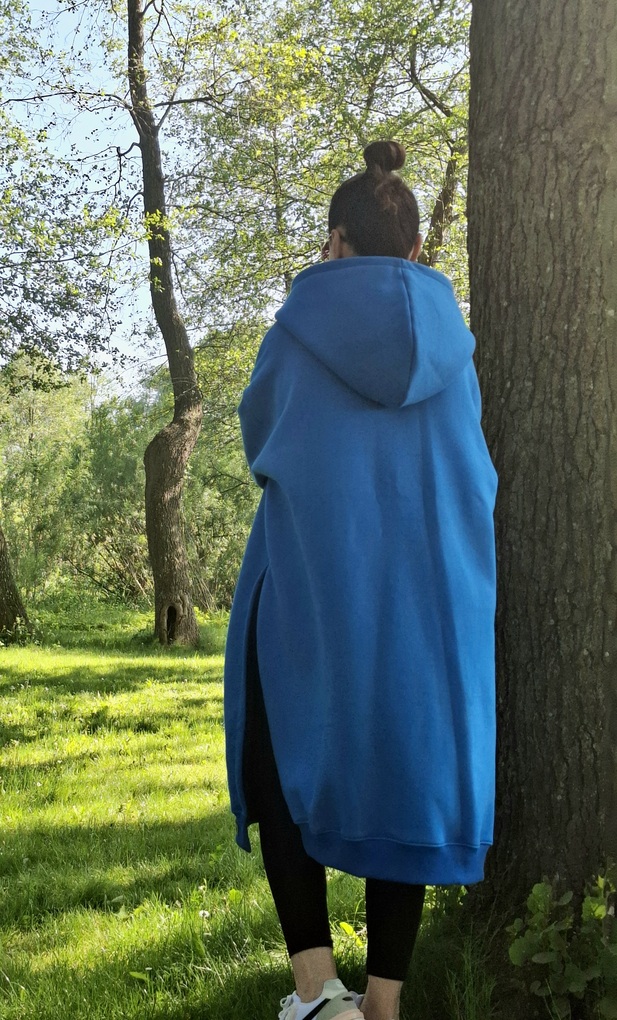 Przepiękna i zjawiskowa damska długa bluza. Fason długi za kolano, rozcięcia po bokach. Bardzo duży i obszerny kaptur, oraz duża kieszeń na przodzie. Całość uszyta jest z dzianiny dresowej drapanej  premium (na misiu pod spodem) o gramaturze ok 300g. Całość w kolorze chabrowym.