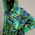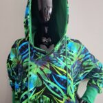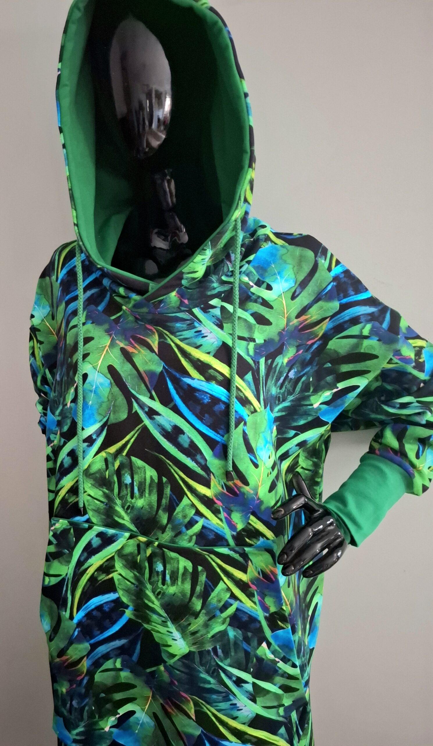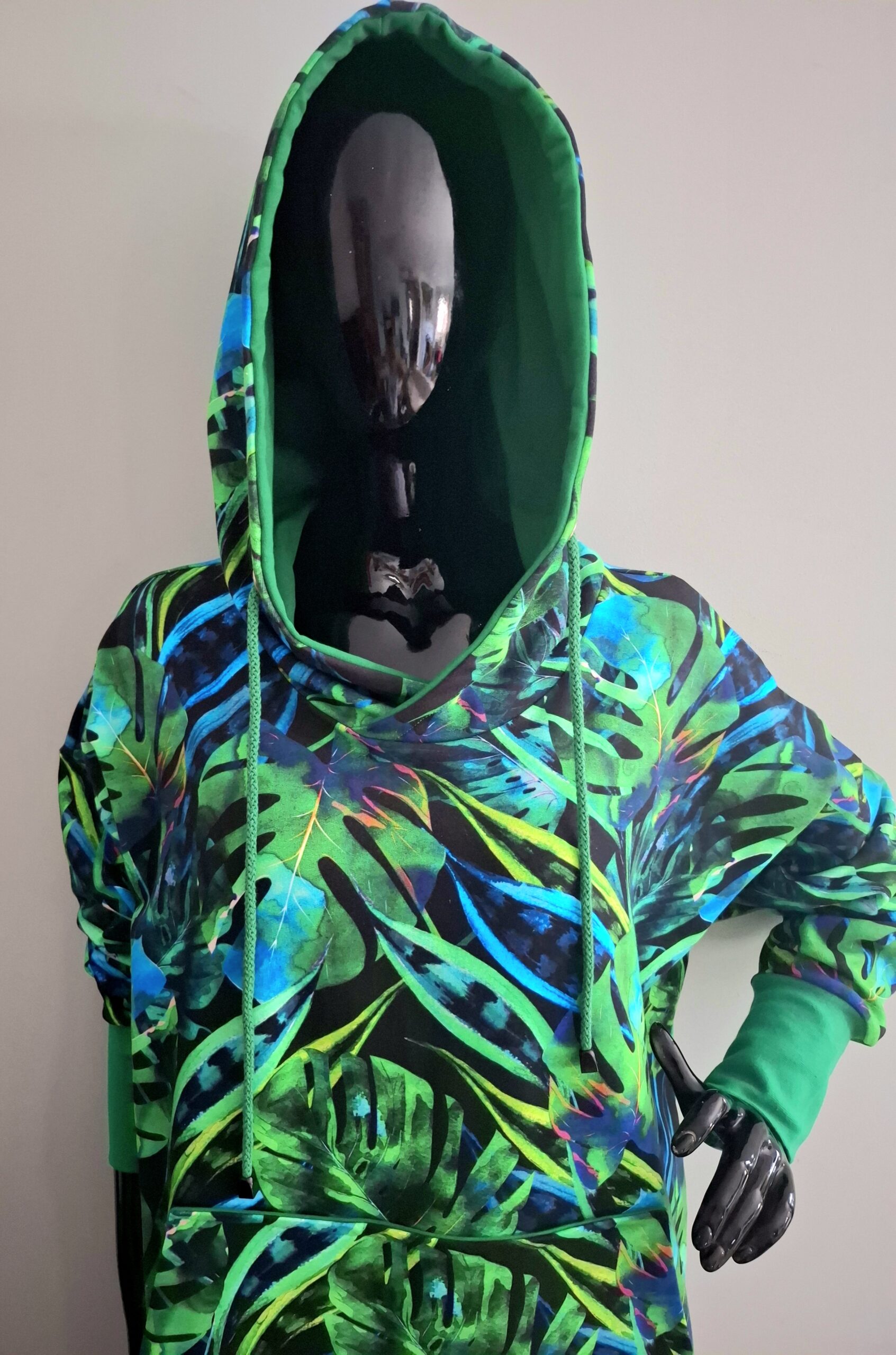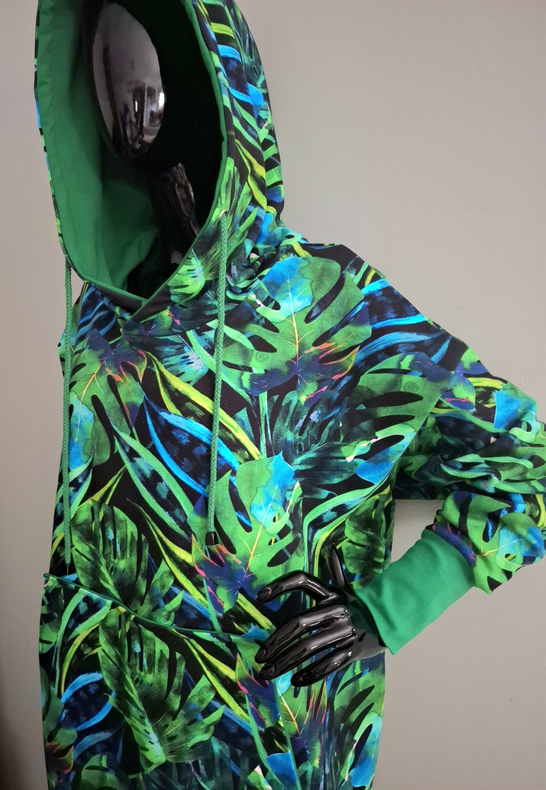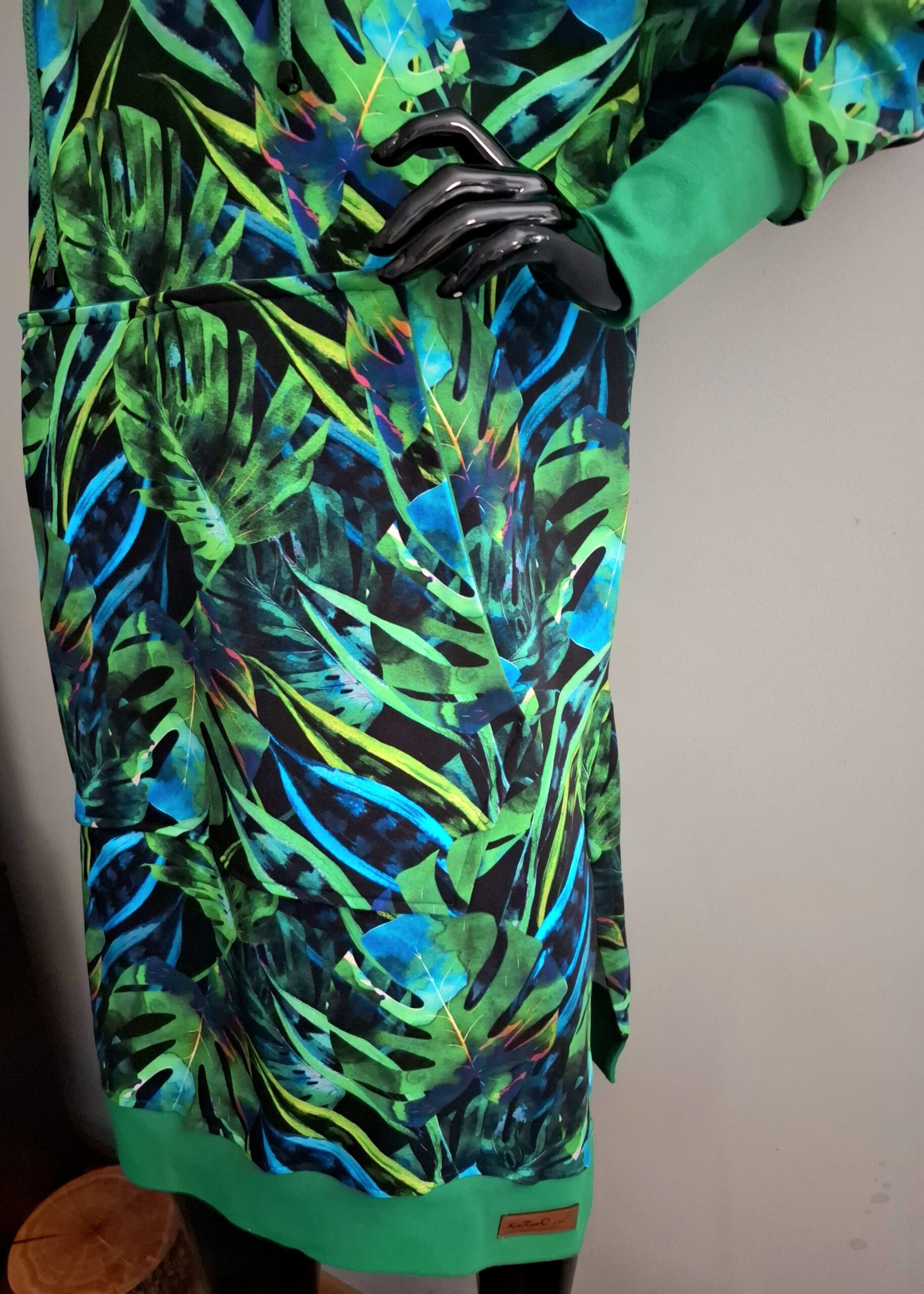 Przepiękna i zjawiskowa damska długa bluza. Fason długi za kolano, rozcięcia po bokach. Bardzo duży i obszerny kaptur, oraz duża kieszeń na przodzie. Całość uszyta jest z dzianiny dresowej pętelkowej w piękny wzór liści monster.