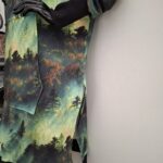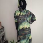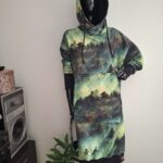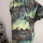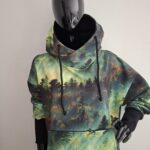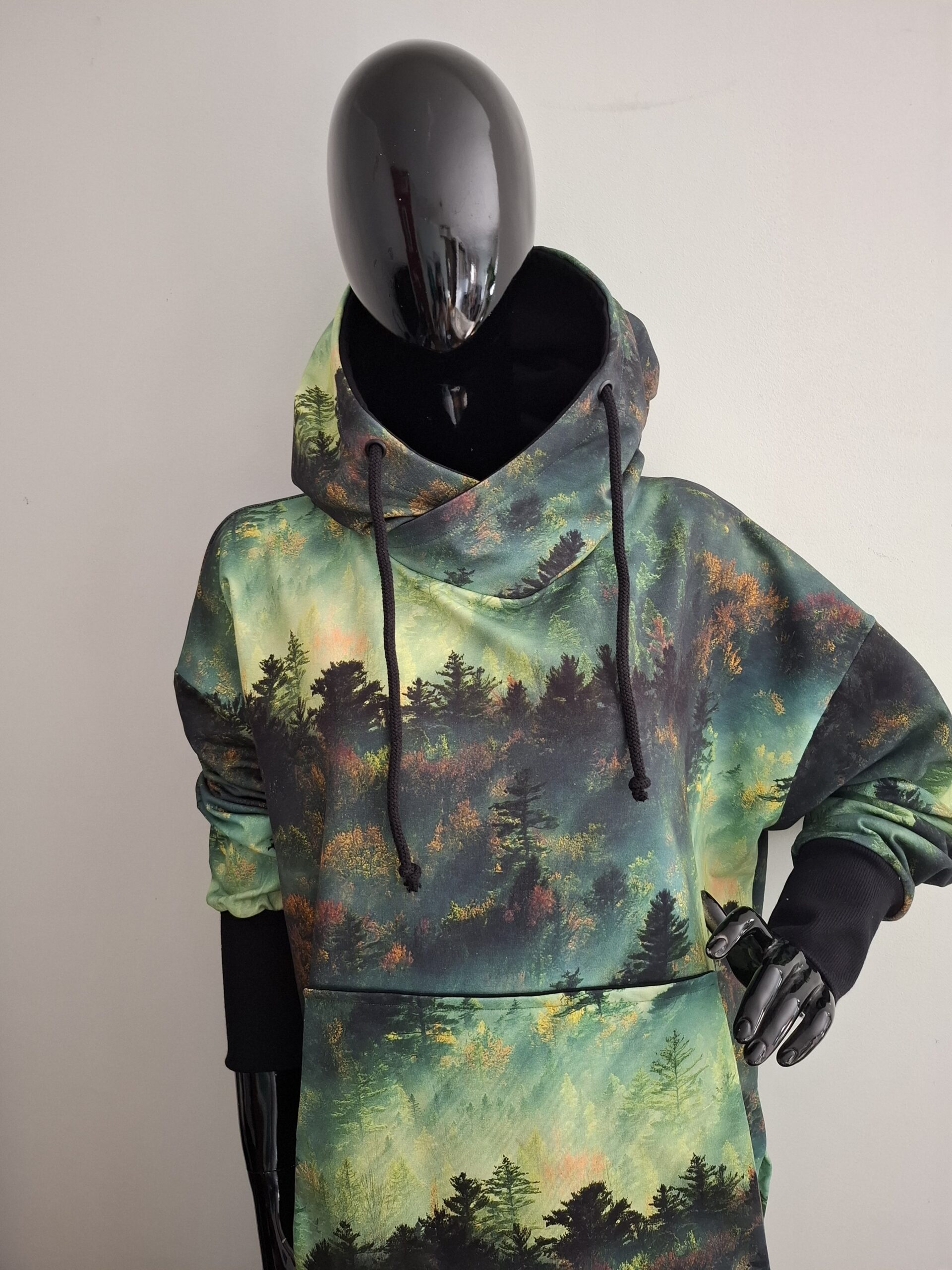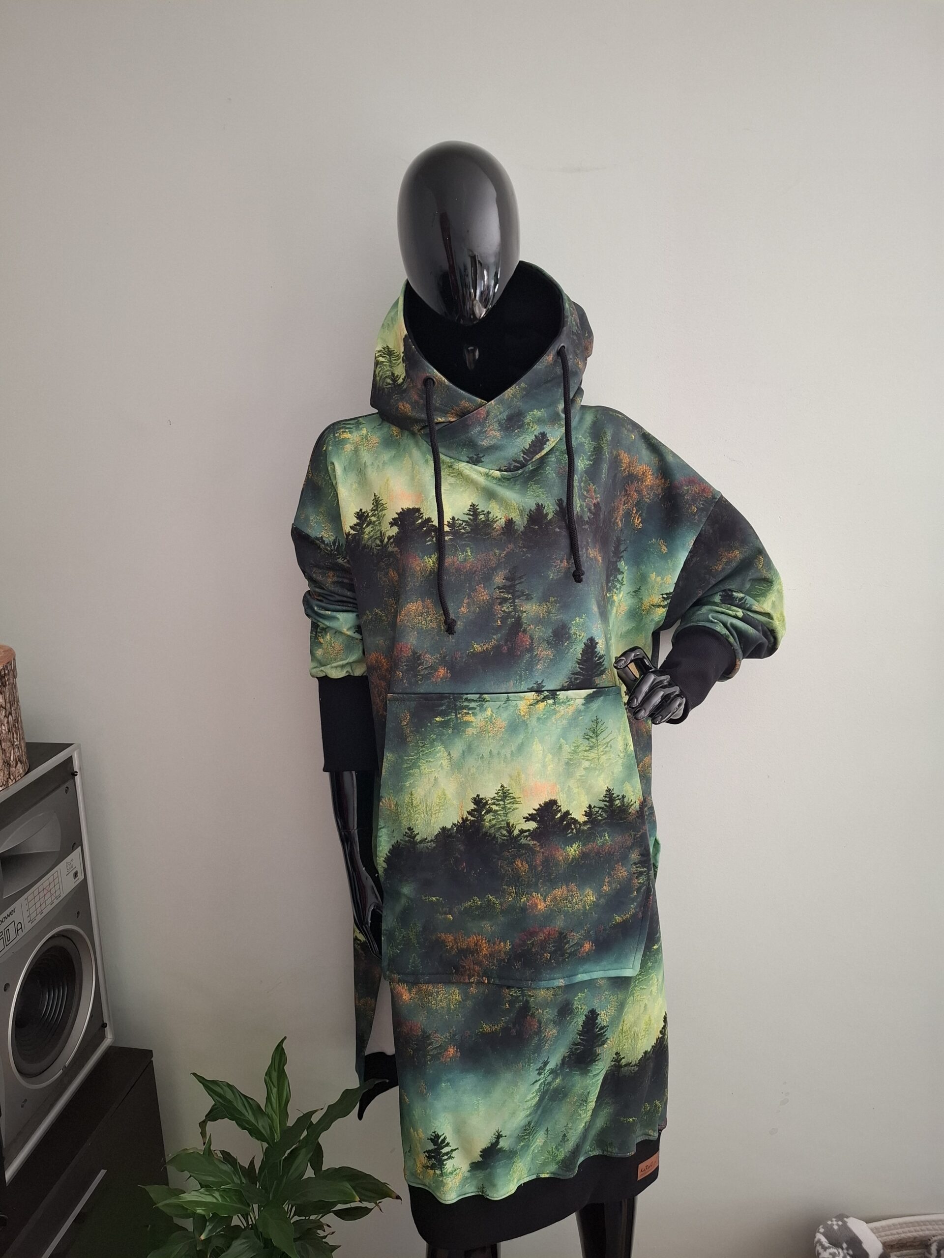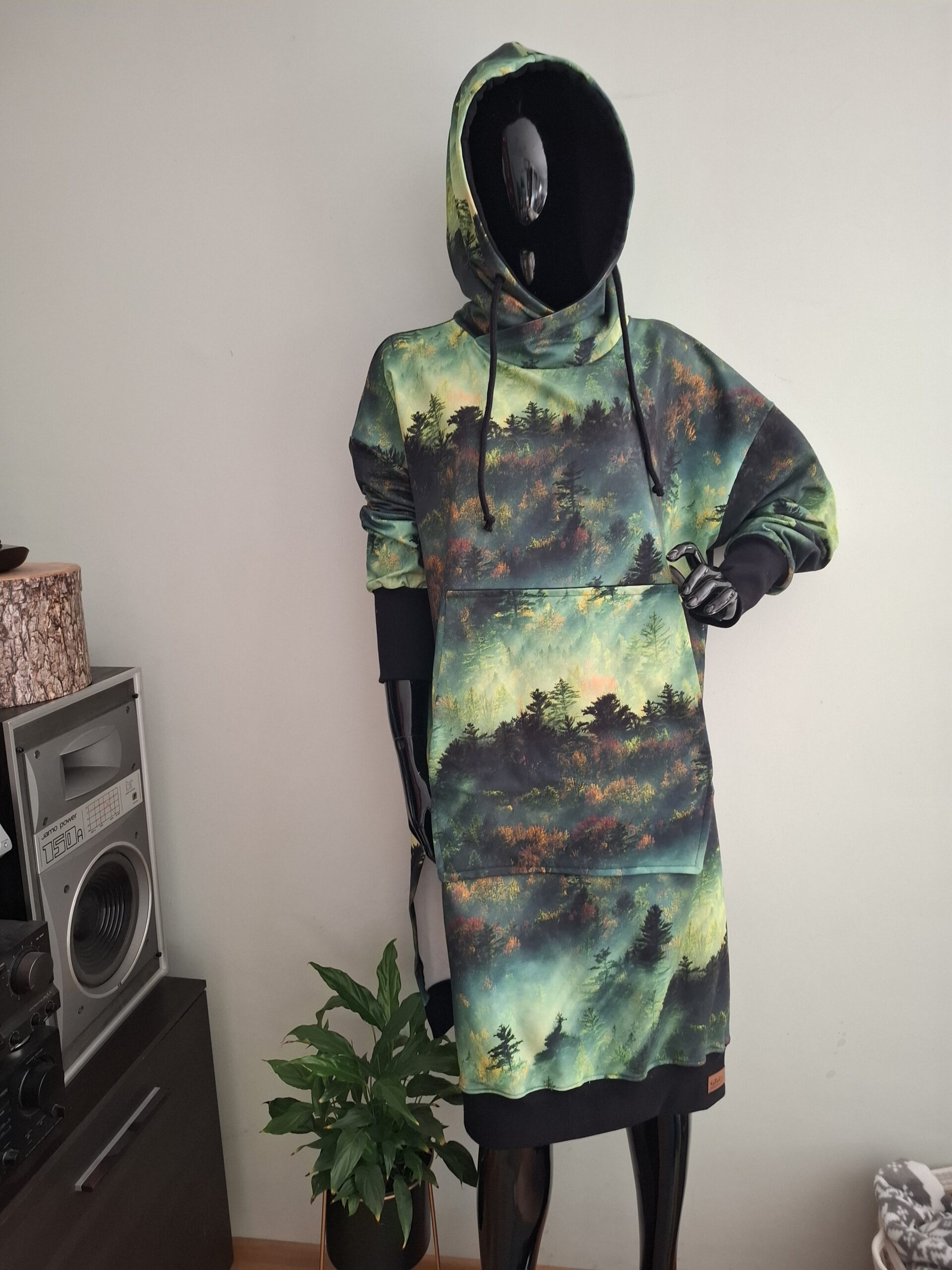 Przepiękna i zjawiskowa damska długa bluza. Fason długi za kolano, rozcięcia po bokach. Bardzo duży i obszerny kaptur, oraz duża kieszeń na przodzie. Całość uszyta jest z dzianiny dresowej pętelkowej w piękny wzór zielonego lasu.