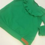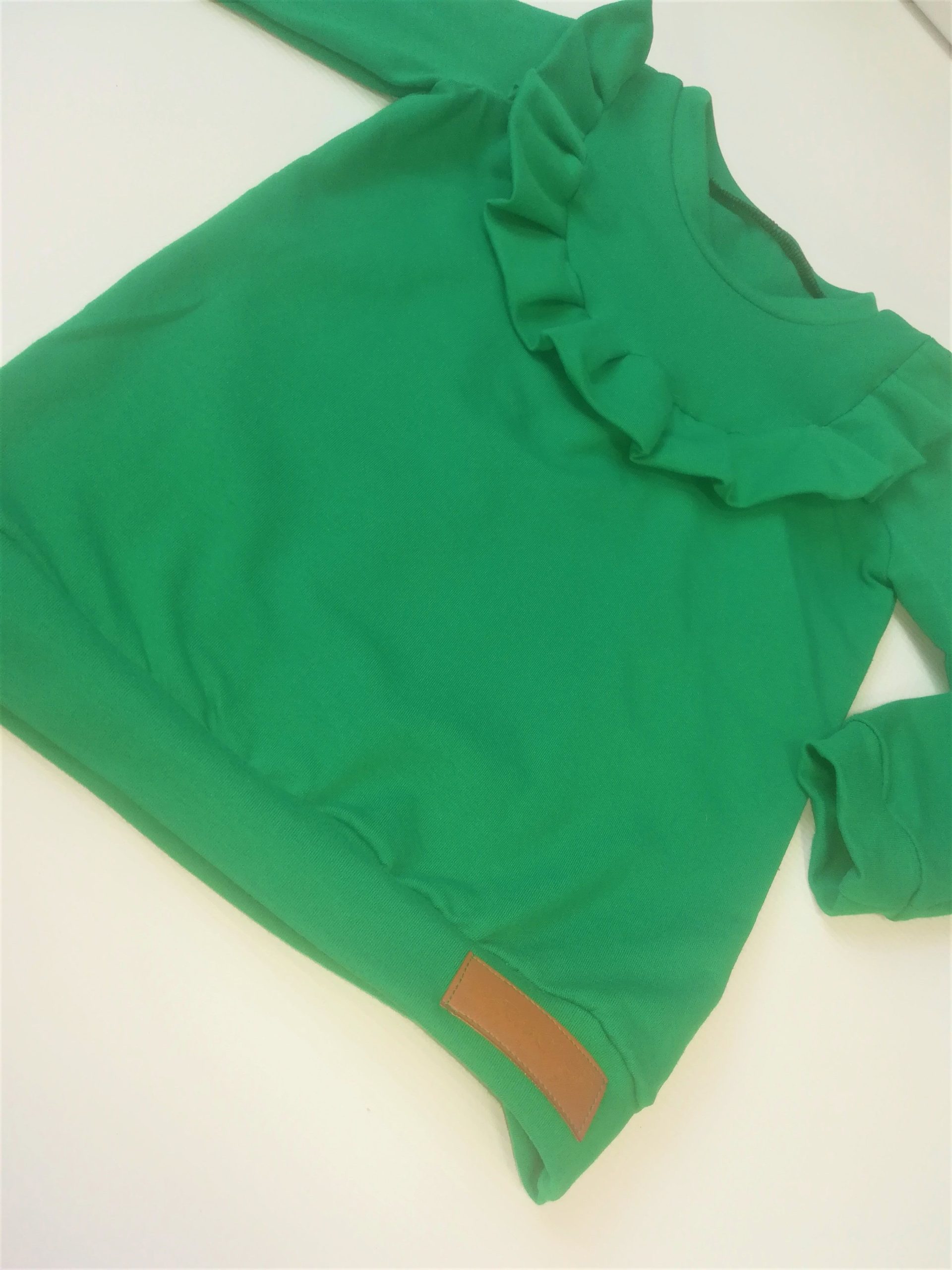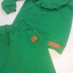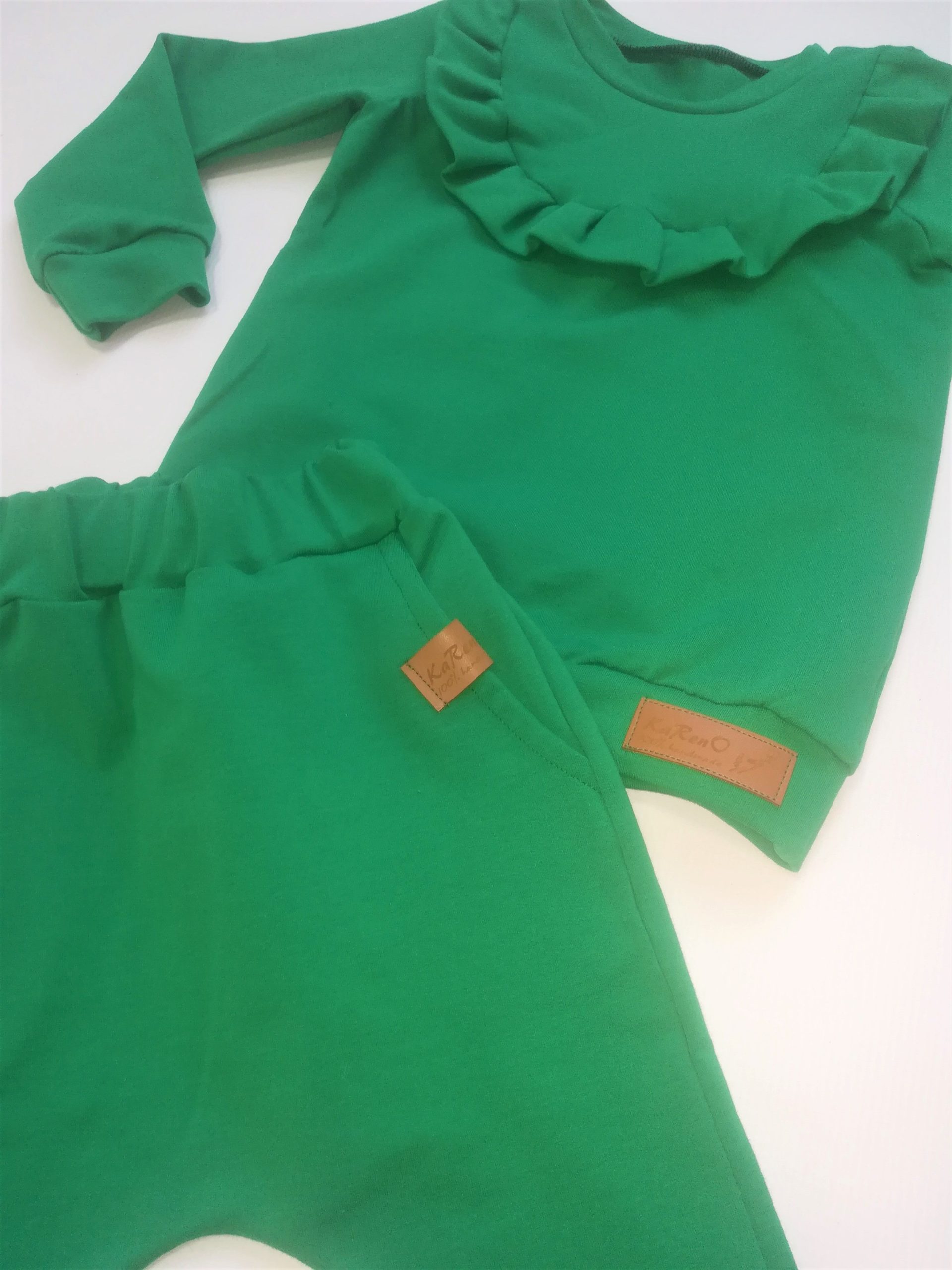 Cudowny komplet składający się z bluzy z falbanką, oaz spodni typu baggy z kieszeniami uszyty z dzianiny dresowej gładkiej w kolorze zieleni butelkowej.