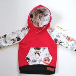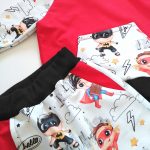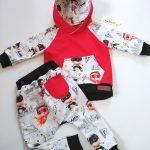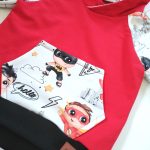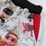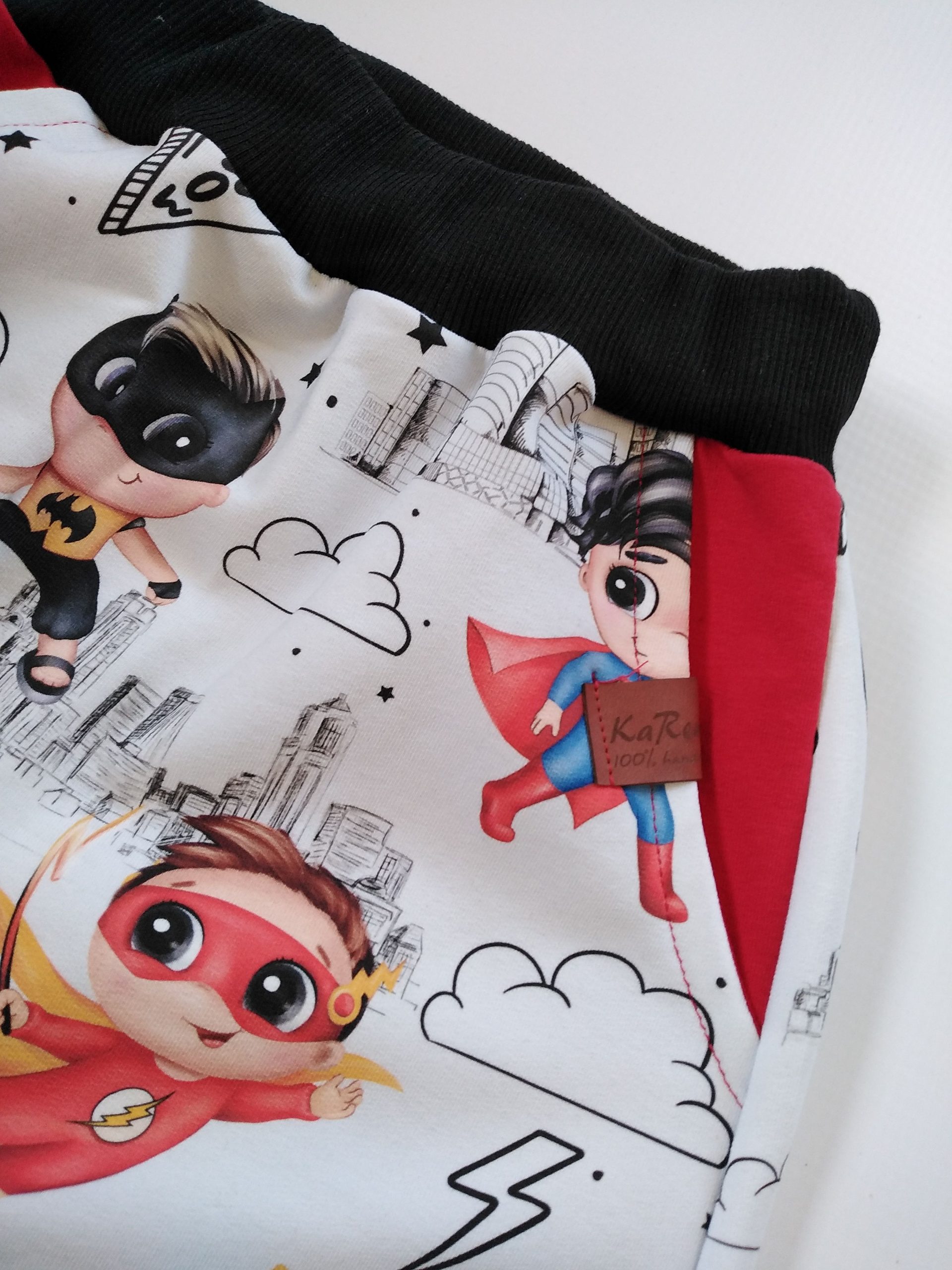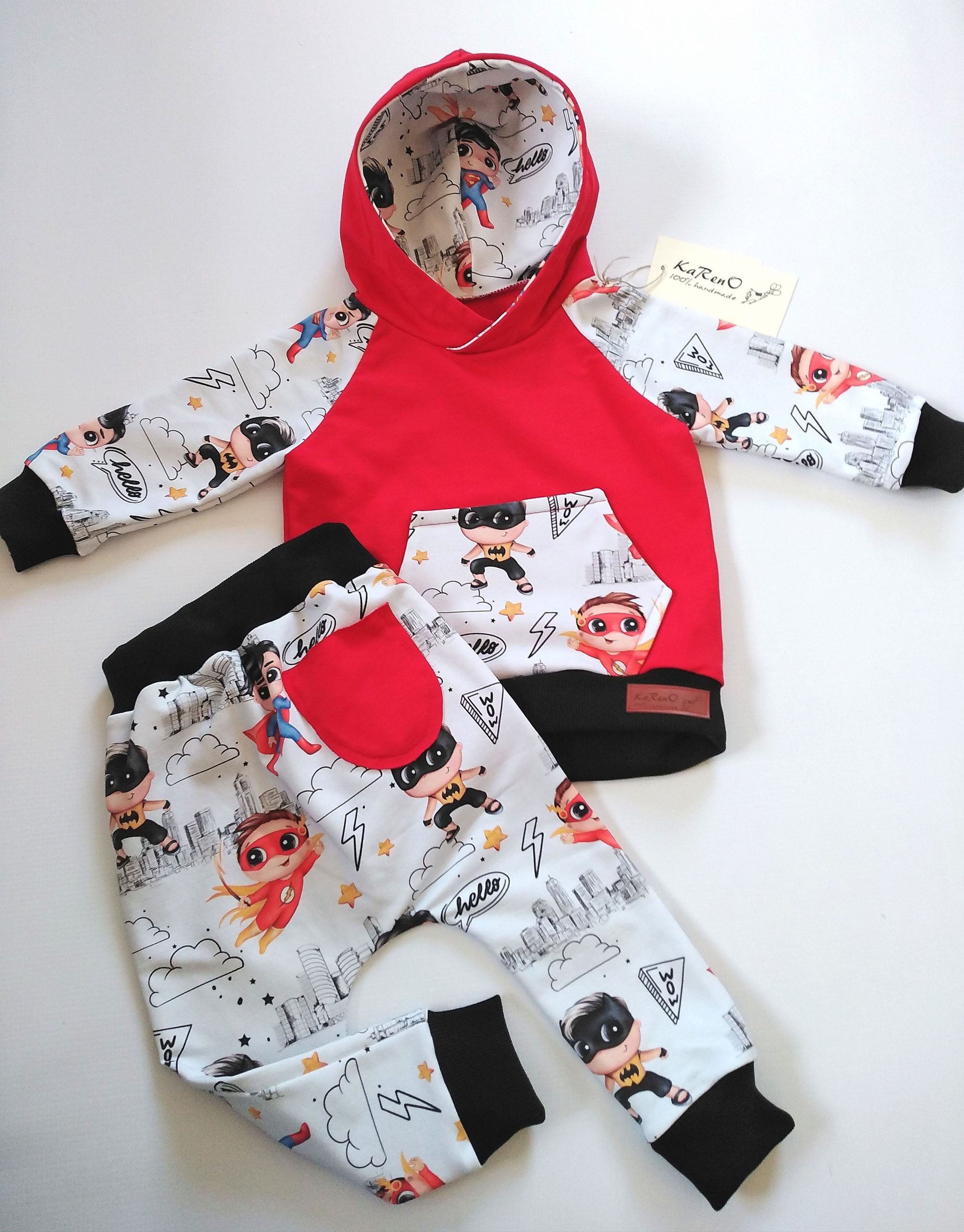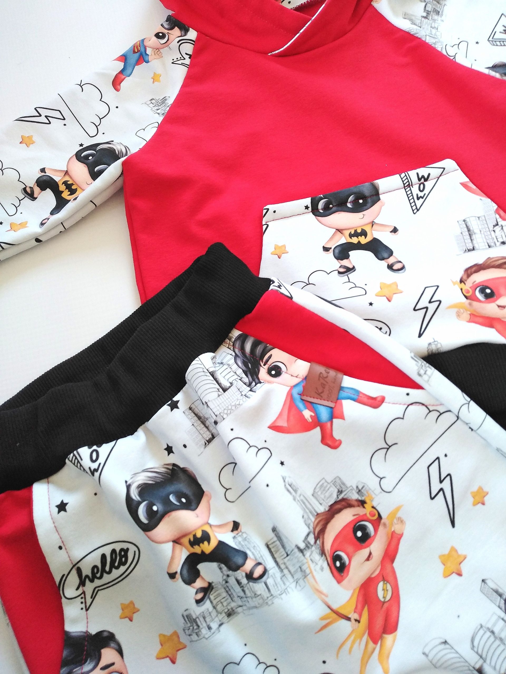 Dresik dziecięcy w świetny wzór SUPER BOHATERÓW na białym tle w połączeniu z dzianiną dresową w kolorze soczystej czerwieni.