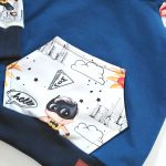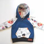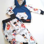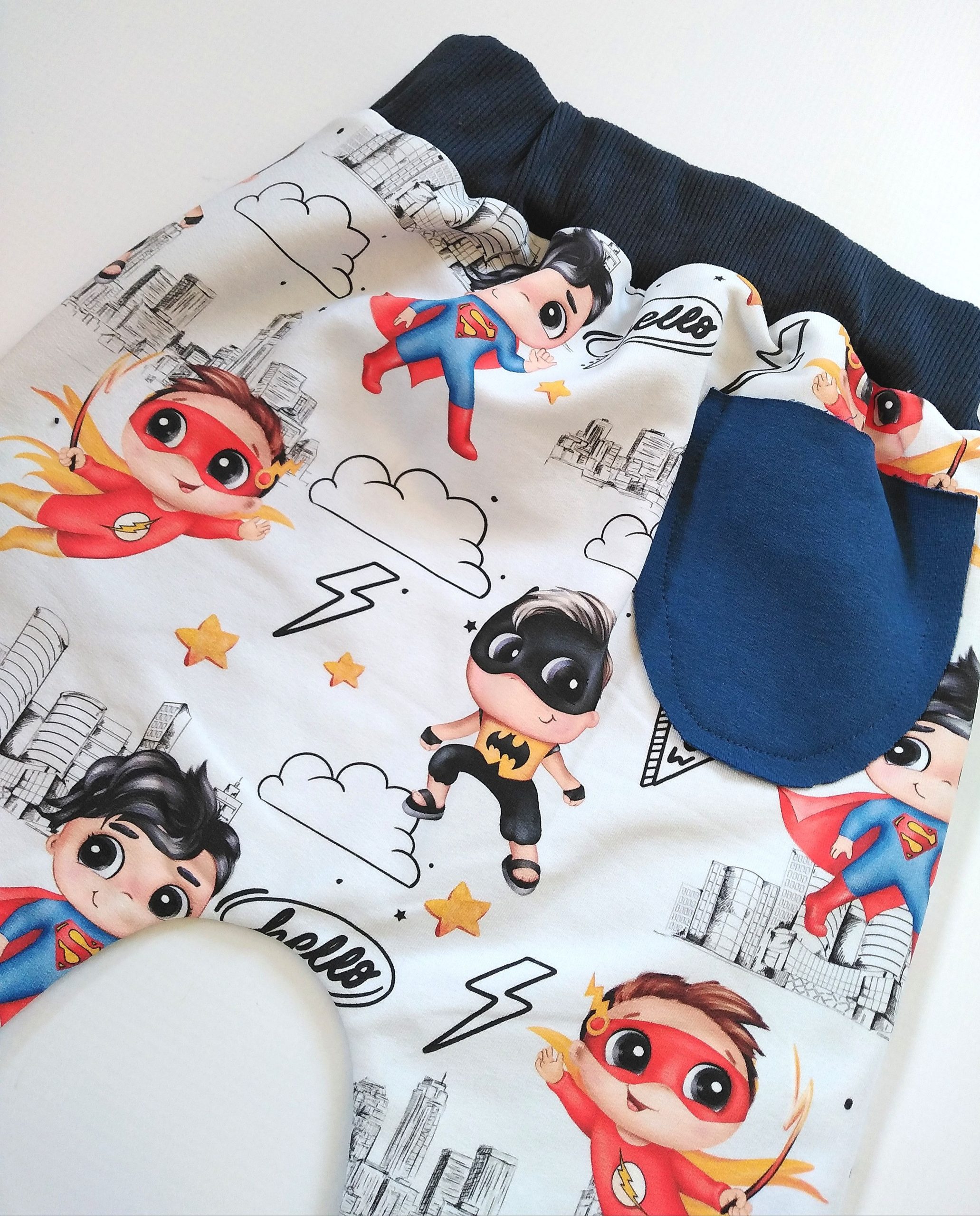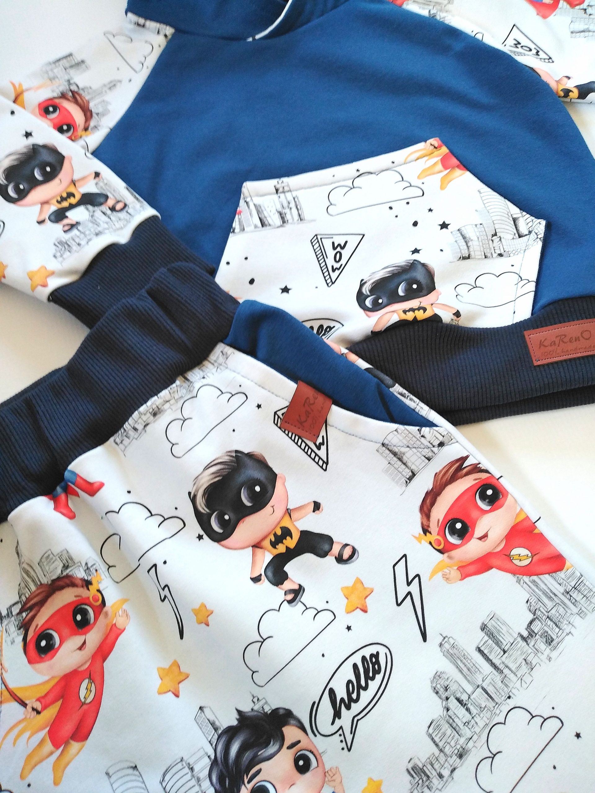 Dresik dziecięcy w świetny wzór SUPER BOHATERÓW na białym tle w połączeniu z dzianiną dresową w kolorze dżinsowym.