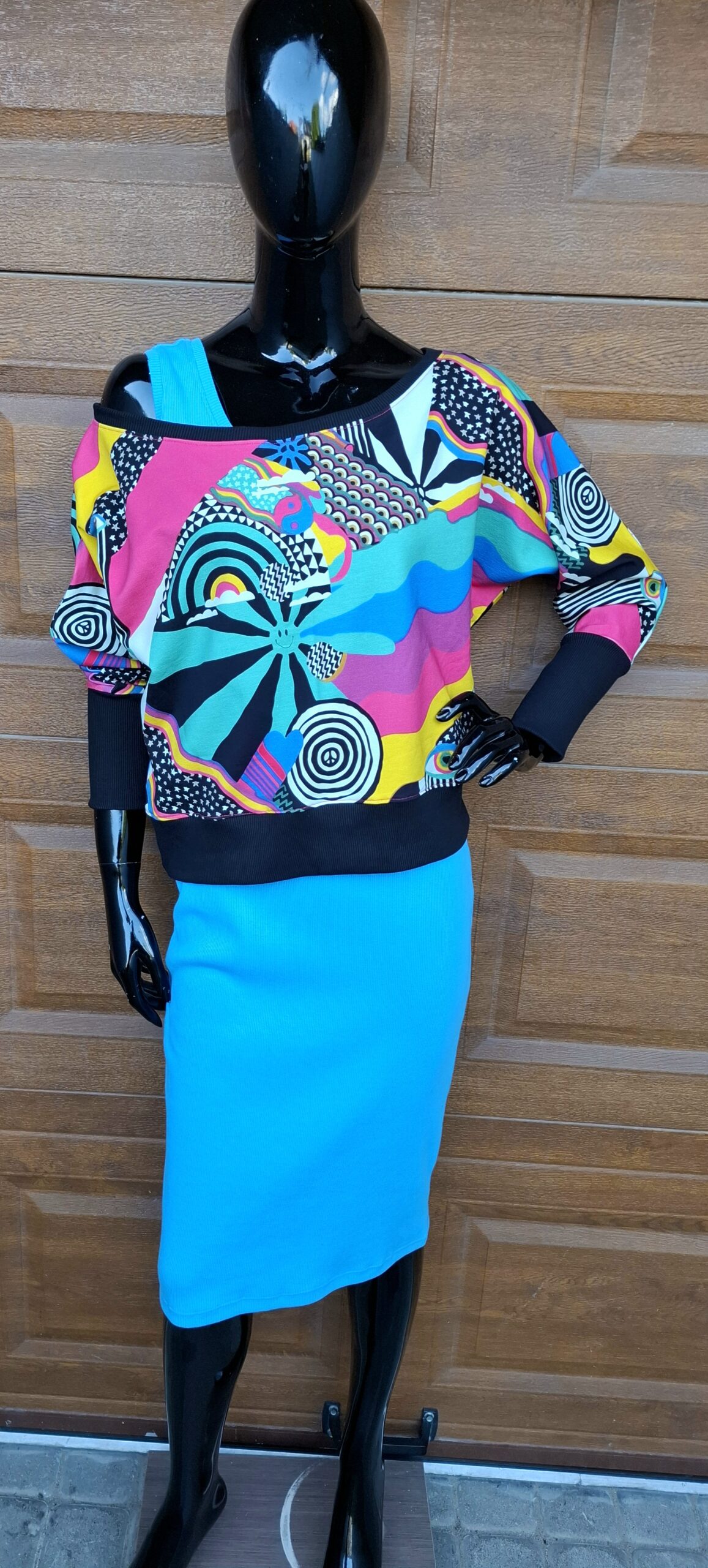 Piękny damski komplet składający się z sukienki ołówkowej bez rękawów uszytej z dzianiny ściągaczowej prążkowanej premium plus krótka bluza z dzianiny dresowej pętelkowej z elastanem z dekoltem w łódkę, dzięki czemu może delikatnie odsłaniać ramię.