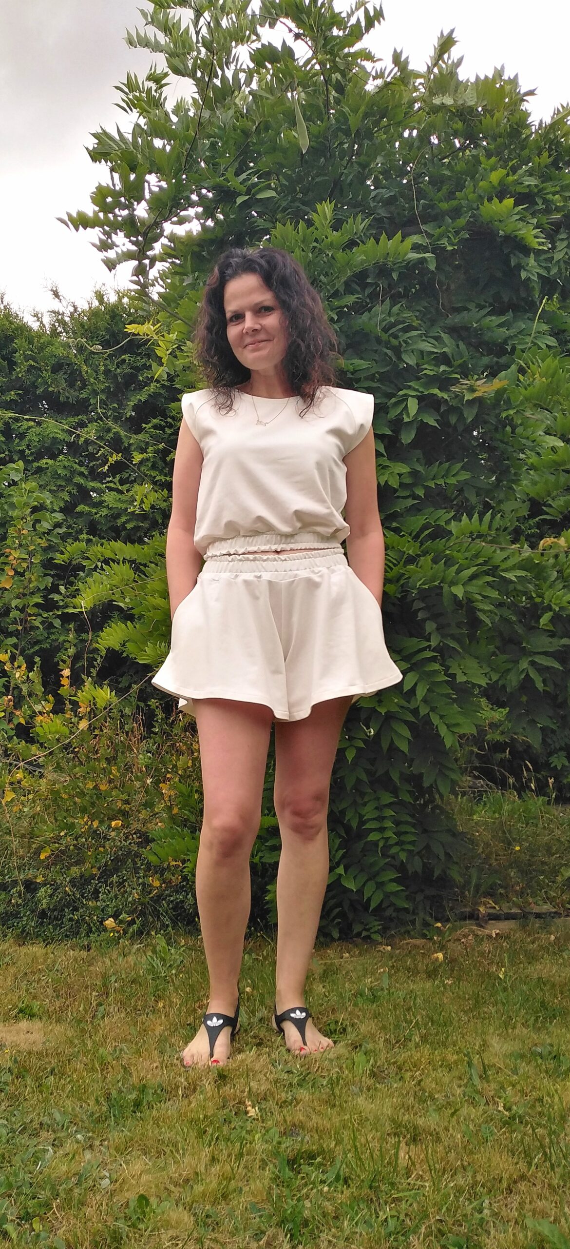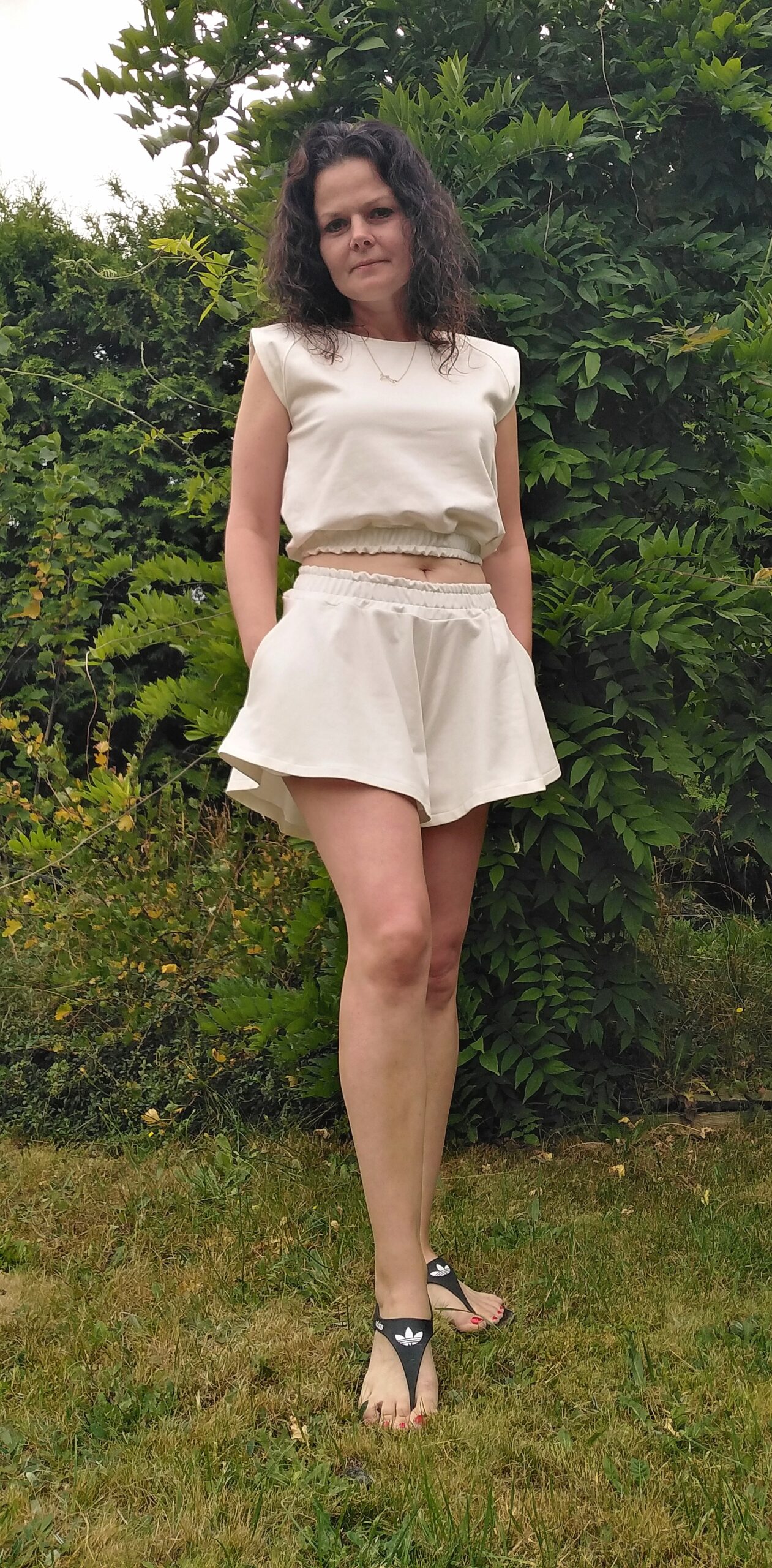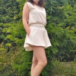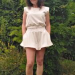 Składa się on się z krótkiej bluzeczki wykończonej na dole gumeczką (jej długość może być według twojego życzenia) uszytej z dzianiny dresowej pętelkowej premium, zaś dół kompletu to rozkloszowanie spodenki z kieszeniami imitujące krótką spódniczkę.