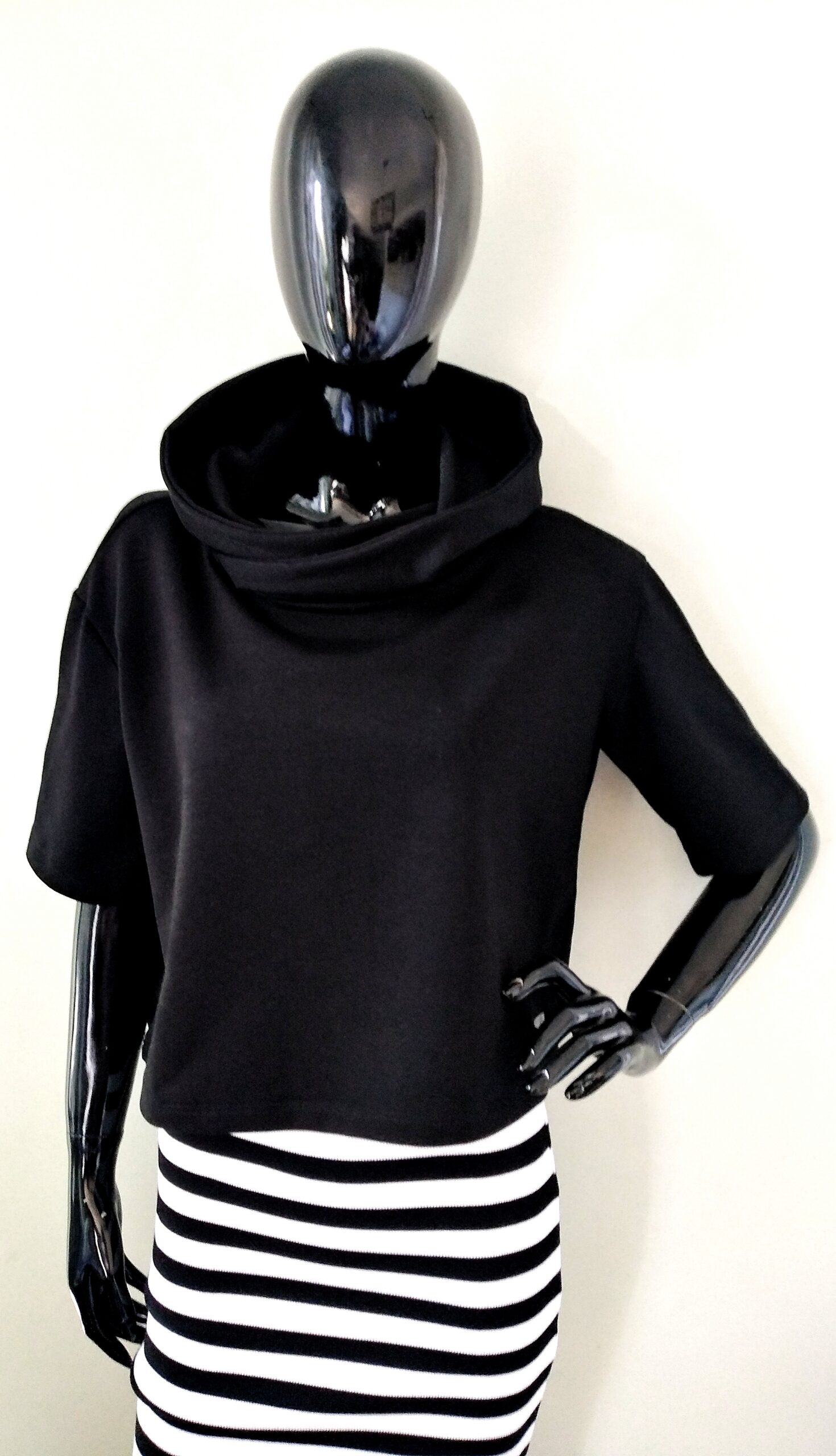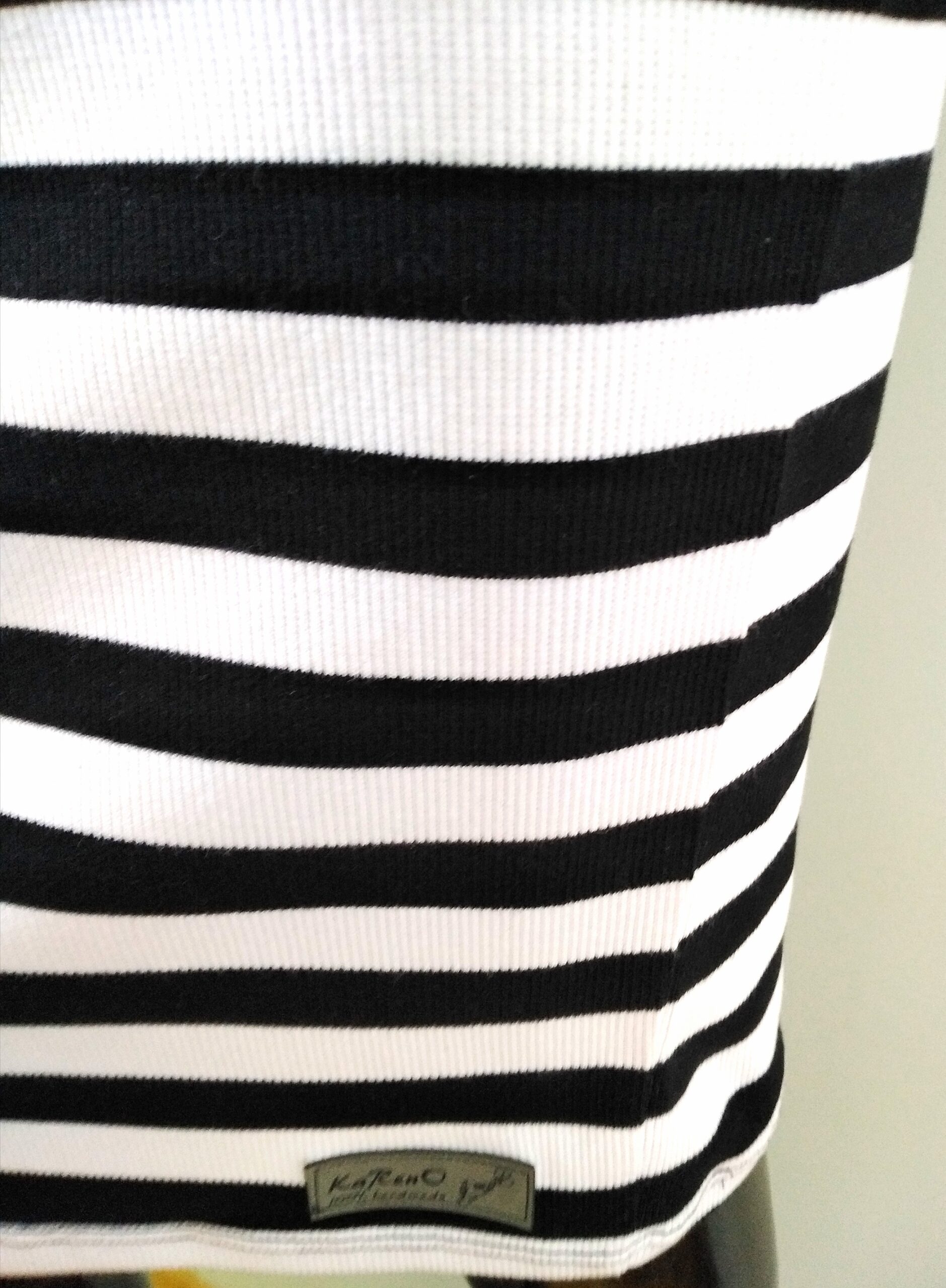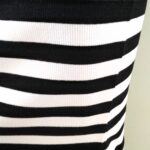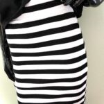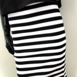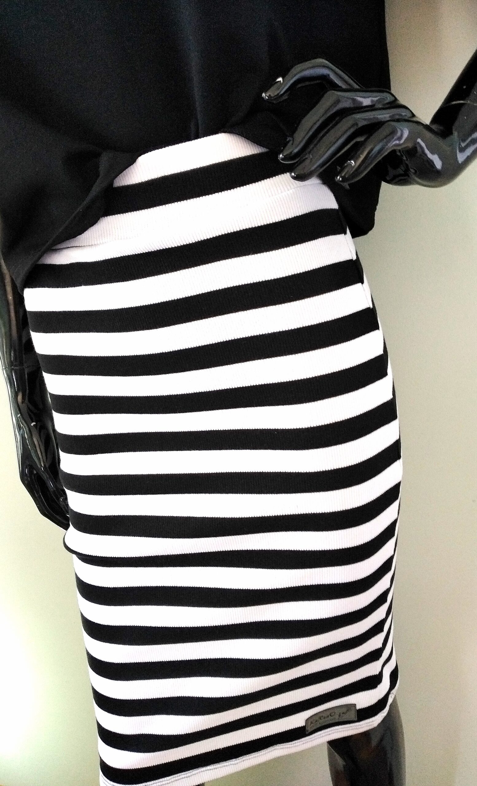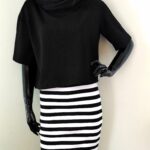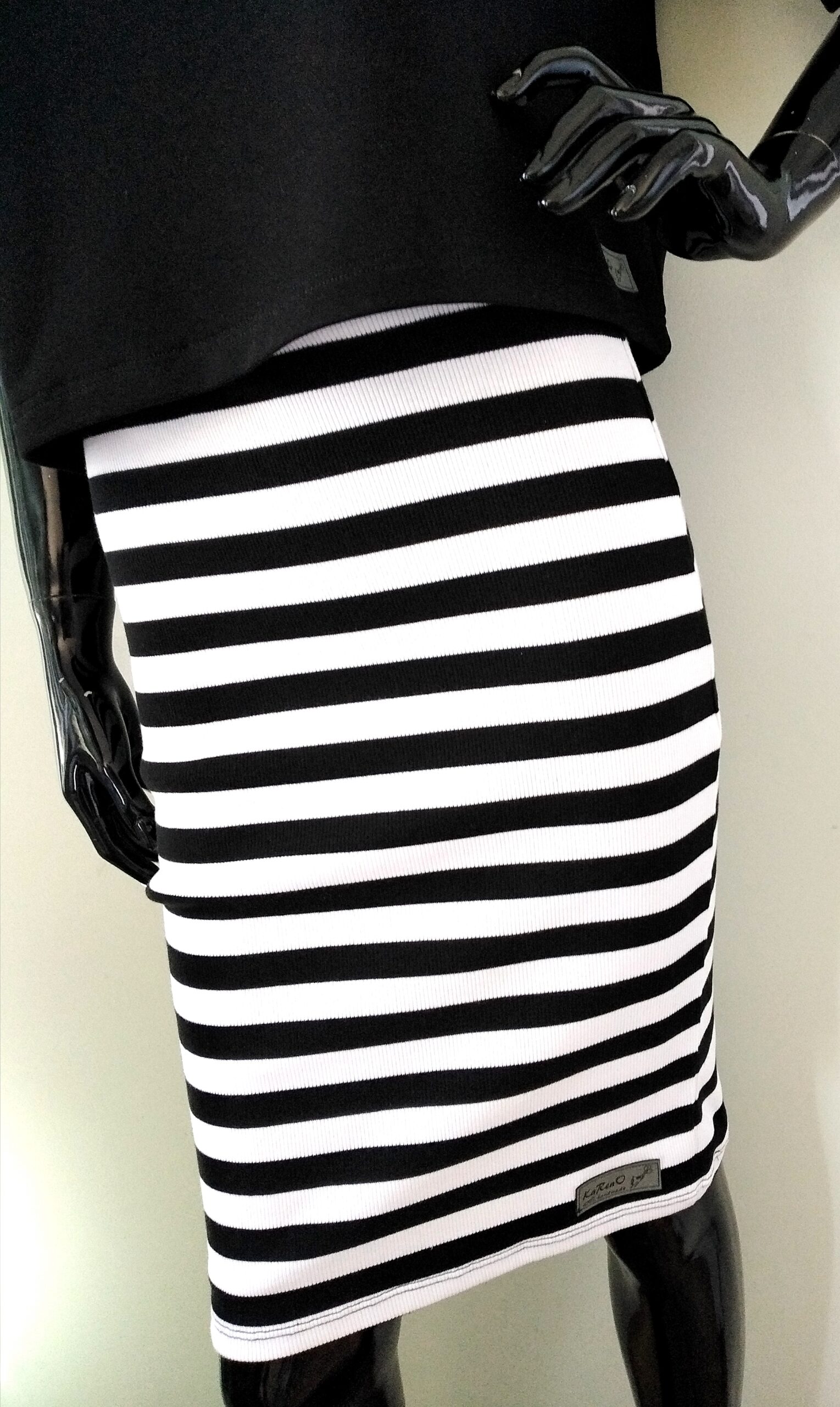 Bluza uszyta jest z dzianiny dresowej w kolorze czarnym, zaś spódnica w paski biało czarne prążek.
