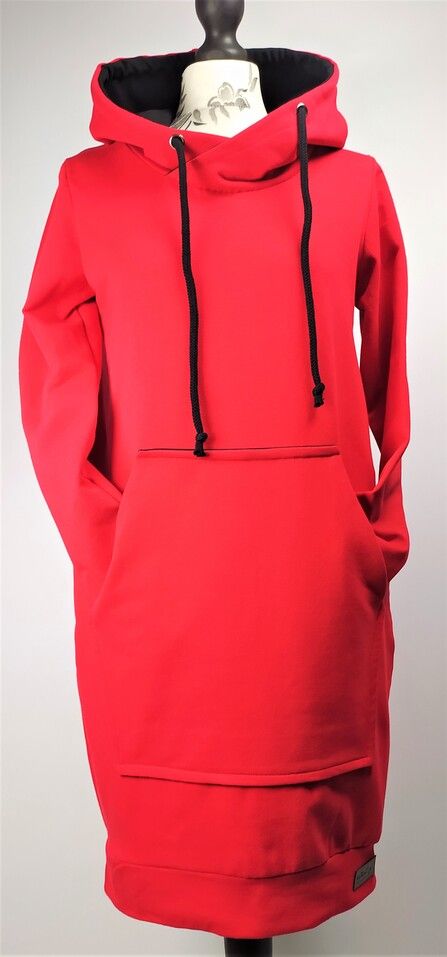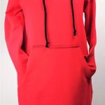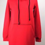 Modna sportowa sukienka damska z długim rękawem o prostym kroju delikatnie zwężona ku dołowi, z dużą kieszenią na przodzie i obszernym kapturem. Fason sukienki idealnie komponuje się z butami na obcasie, jak również z lekkim obuwiem kasual