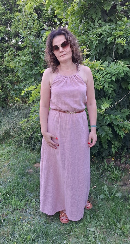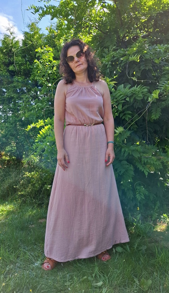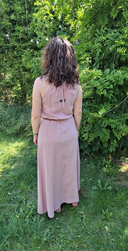 Przepiękna damska długa sukienka muślinowa w kolorze brudnego różu. Kobieca, zwiewna, idealna na co dzień, jak i na wieczorne wyjścia. Fason sukienki idealnie komponuje się z butami na obcasie, jak również z lekkim obuwiem kasual
