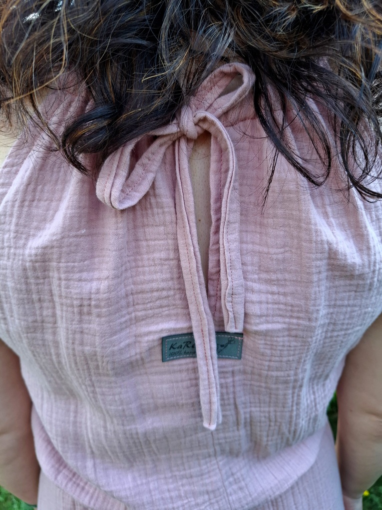 Muślin double gaze to dwuwarstwowa tkanina; przewiewna, lekko prześwitująca. Wykonana ze stuprocentowej bawełny, odpowiednio przygotowanej, aby wydobyć z niej całe naturalne dobro. Dzięki charakterystycznej strukturze marszczenia oraz drobnej perforacji, materiał jest lekki, niezwykle miękki i pozwala skórze oddychać. Termoregulacyjne właściwości bawełny sprawiają, że ubrania wykonane z muślinu double gaze w gorących warunkach chłodzą, a w sezonie przejściowym delikatnie ocieplają. Ponadto, materiał ten pochłania wilgoć dwa razy szybciej niż tradycyjna bawełna.