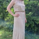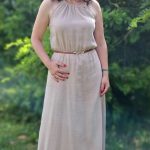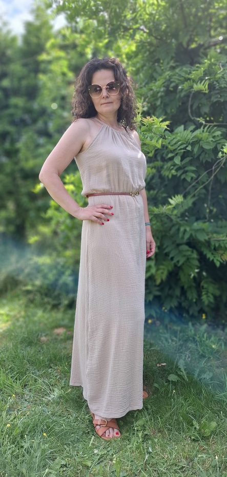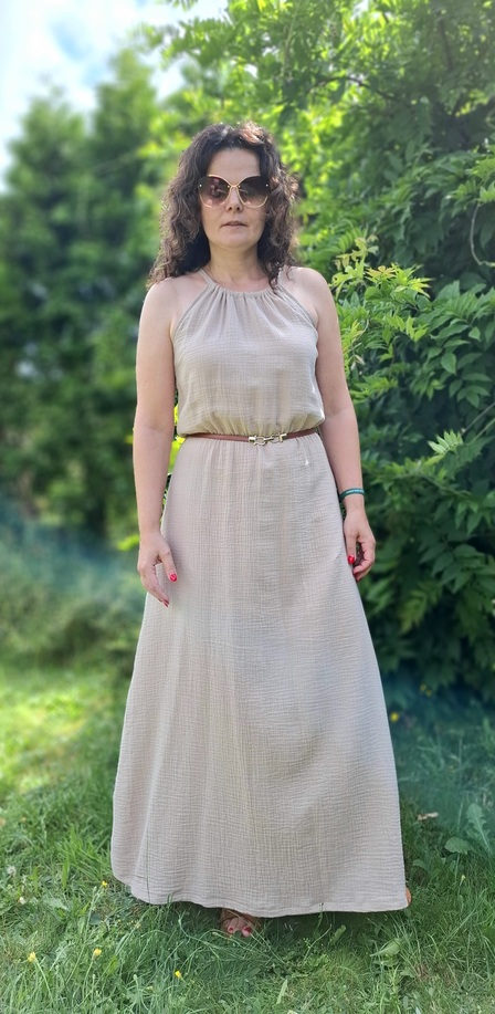 Przepiękna damska długa sukienka muślinowa w kolorze jasnego beżu. Kobieca, zwiewna, idealna na co dzień, jak i na wieczorne wyjścia. Fason sukienki idealnie komponuje się z butami na obcasie, jak również z lekkim obuwiem kasual