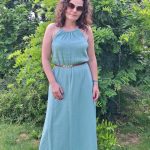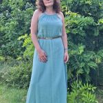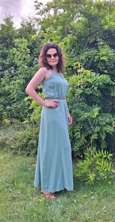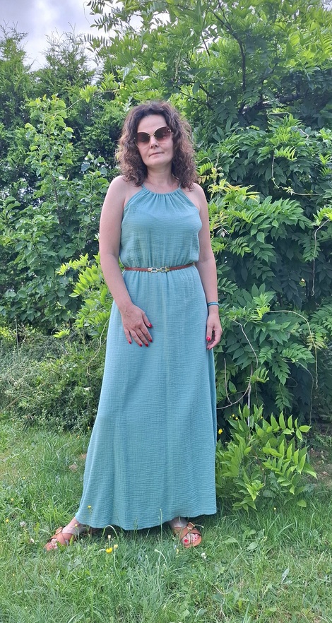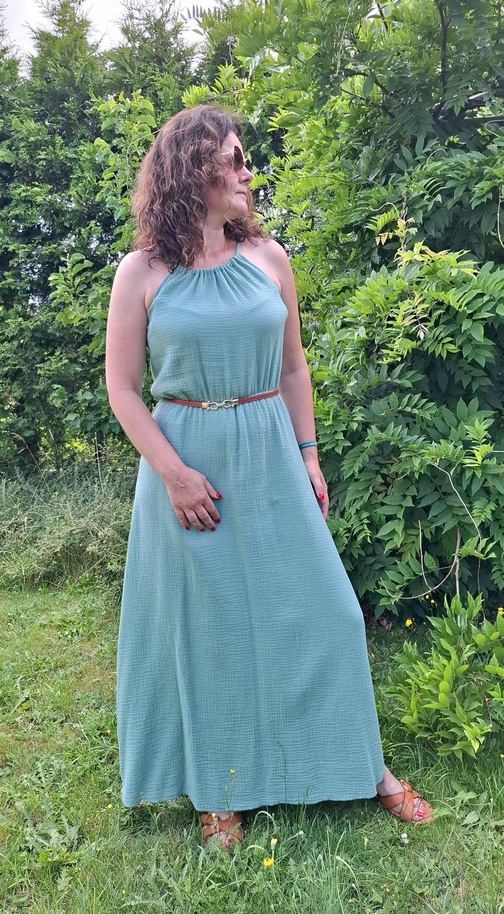 Przepiękna damska długa sukienka muślinowa w kolorze szałwiowym. Kobieca, zwiewna, idealna na co dzień, jak i na wieczorne wyjścia. Fason sukienki idealnie komponuje się z butami na obcasie, jak również z lekkim obuwiem kasual
