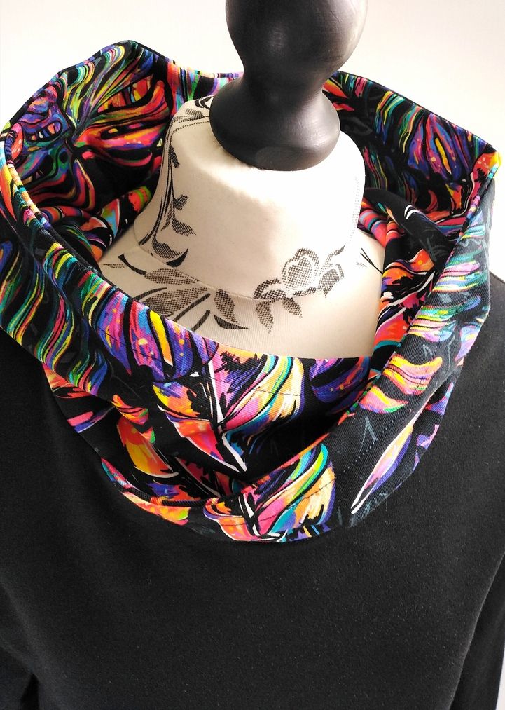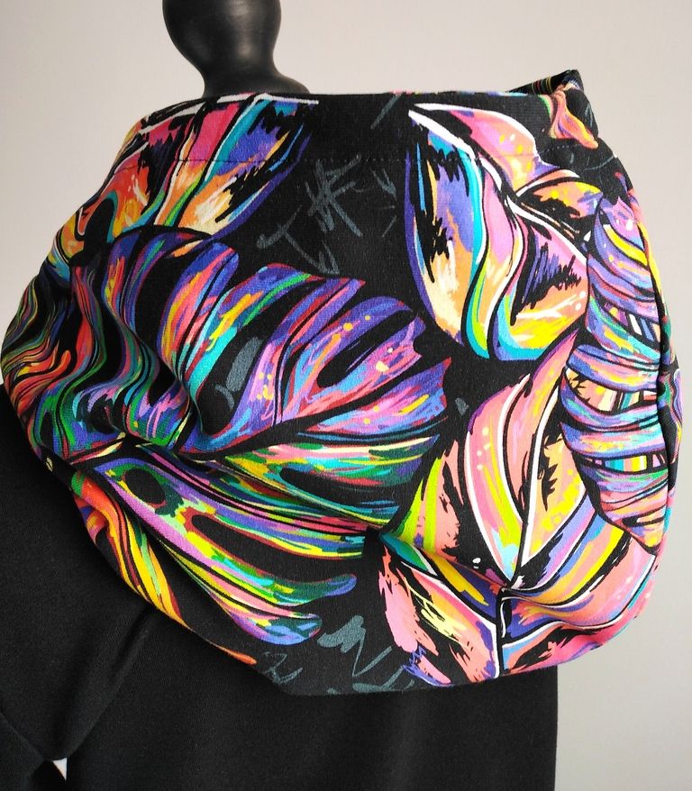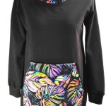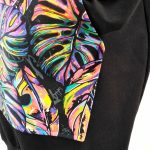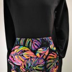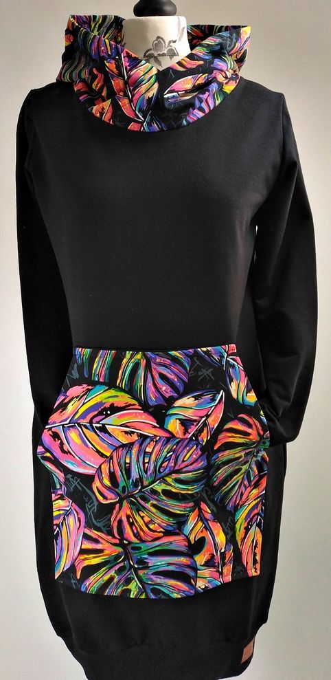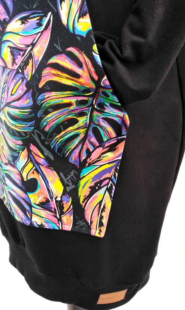 Przepiękna sukienka uszyta z wysokogatunkowej bawełny premium w czarnym kolorze w połączeniu z dzianiną w modny wzór kolorowych liści monster, dodatkowo dzięki domieszce elastanu 6-8% jest wygodna, elastyczna, idealna na co dzień, jak i na wyjątkowe okazje.