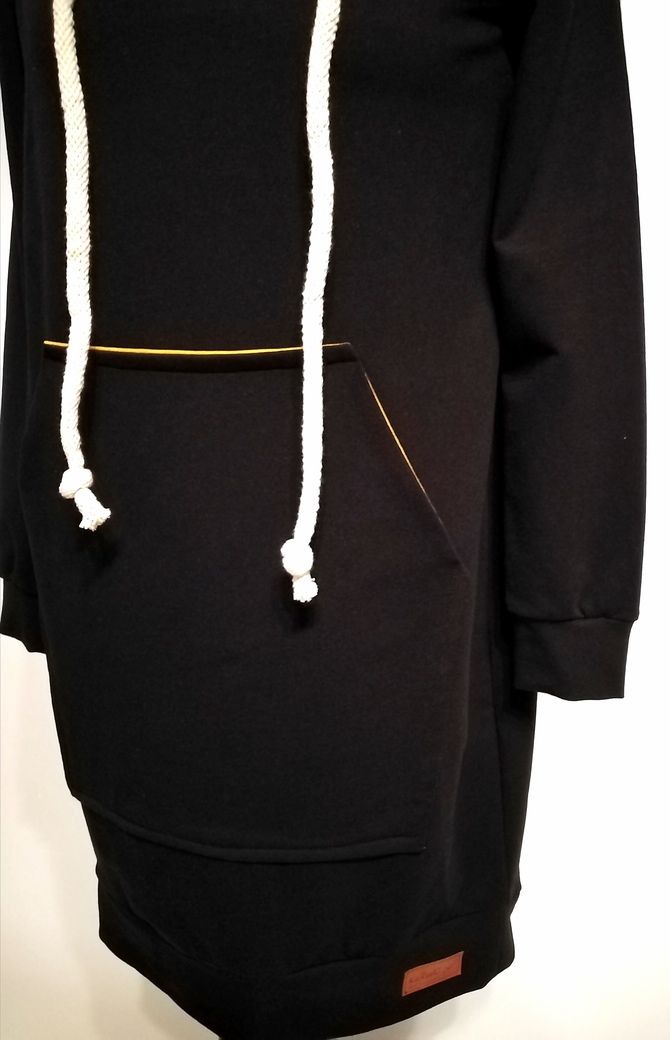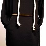 Modna sportowa sukienka damska z długim rękawem o prostym kroju delikatnie zwężona ku dołowi, z dużą kieszenią na przodzie i obszernym kapturem. Fason sukienki idealnie komponuje się z butami na obcasie, jak również z lekkim obuwiem kasual