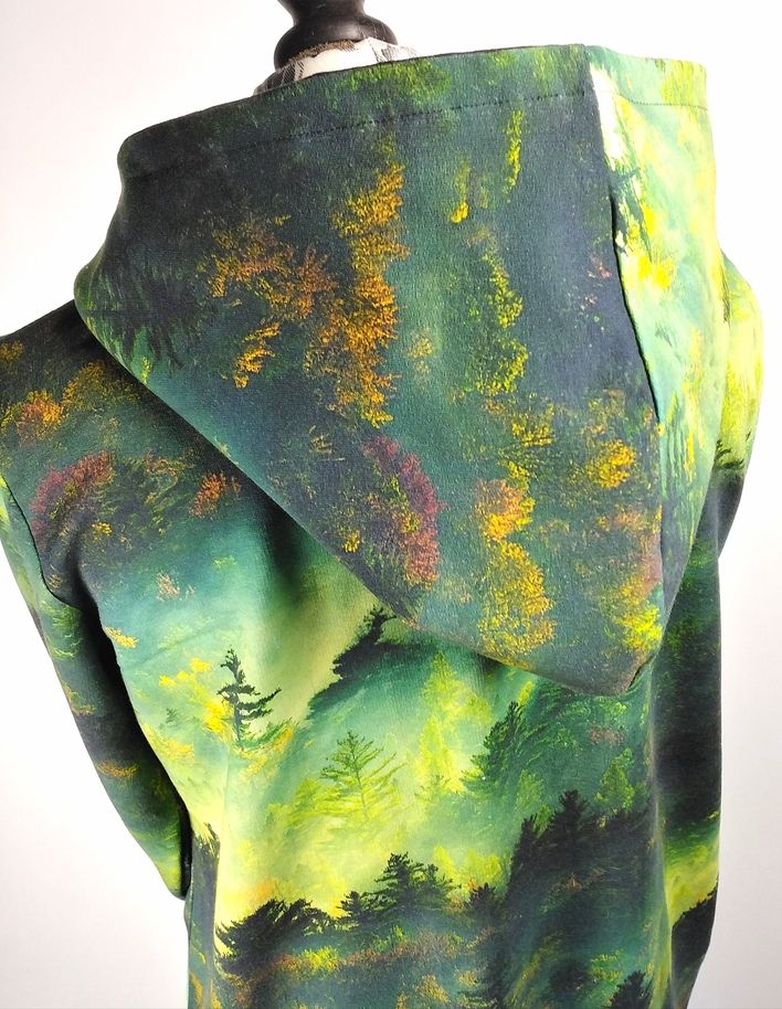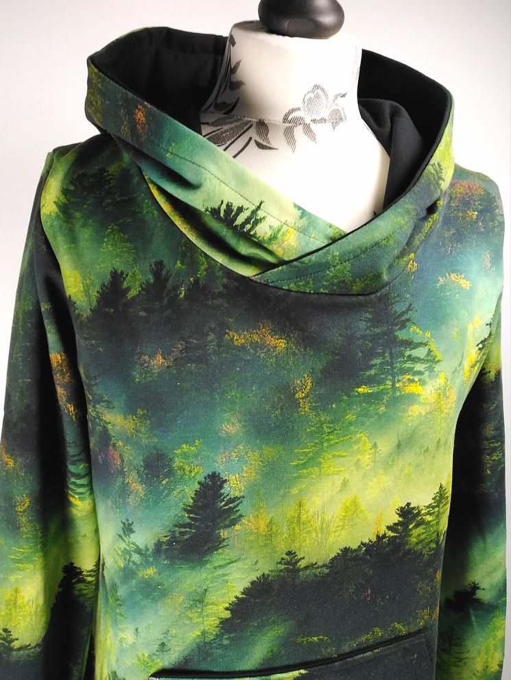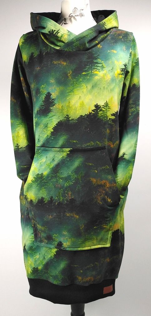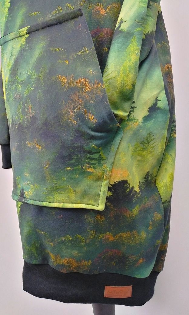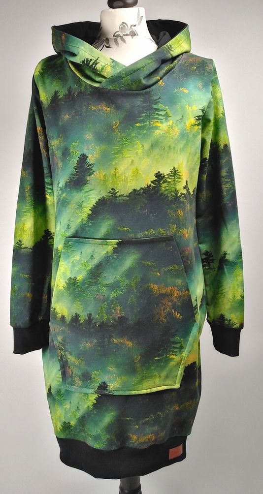Przepiękna sukienka uszyta z wysokogatunkowej dzianiny premium w modny wzór zielonego lasu o świcie, dodatkowo dzięki domieszce elastanu 6-8% jest wygodna, elastyczna, idealna na co dzień, jak i na wyjątkowe okazje.