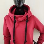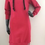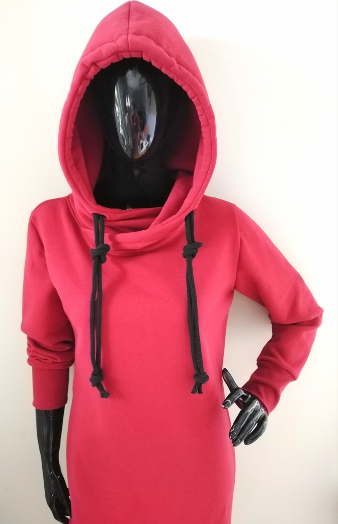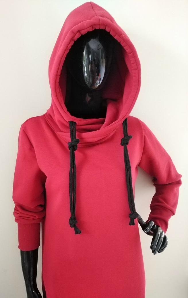 Modna sportowa sukienka damska z długim rękawem, delikatnie taliowana, z kieszeniami w szwach bocznych i obszernym kapturem. Uszyta z dzianiny dersowej drapanej na misiu pod spodem, idealna na jesienne i zimowe dni. Fason sukienki idealnie komponuje się z butami na obcasie, jak również z lekkim obuwiem kasual. Całość uzupełniona o gruby podwójny bawełniany sznurek w kapturze.