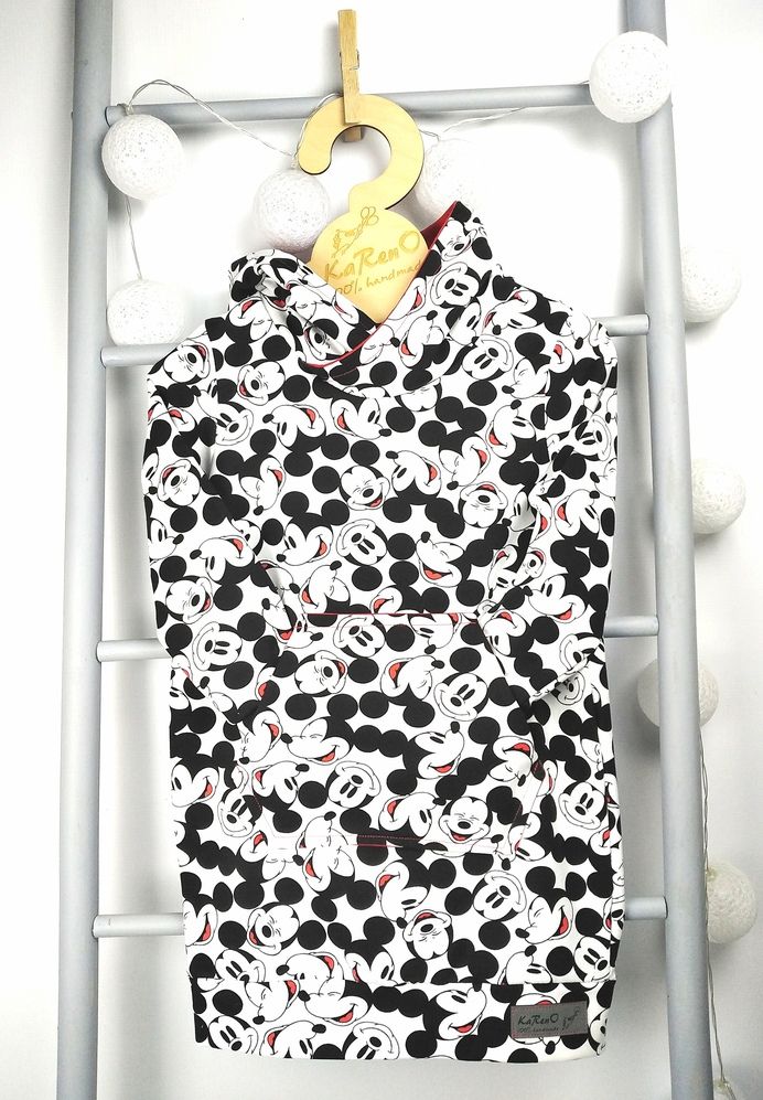 Przepiękna dziecięca sukienka dresowa z kapturek typu kangurka, z dużą kieszenią na przodzie, uszyta z wysokogatunkowej bawełny premium, w piękny głów Miki na białym tle, nadruk na dzianinie wykonany jest metodą cyfrową co zapewnia najwyższą jakość nadruku, dodatkowo dzięki domieszce elastanu 6-8% jest wygodna, elastyczna, idealna na co dzień, jak i na wyjątkowe okazje.