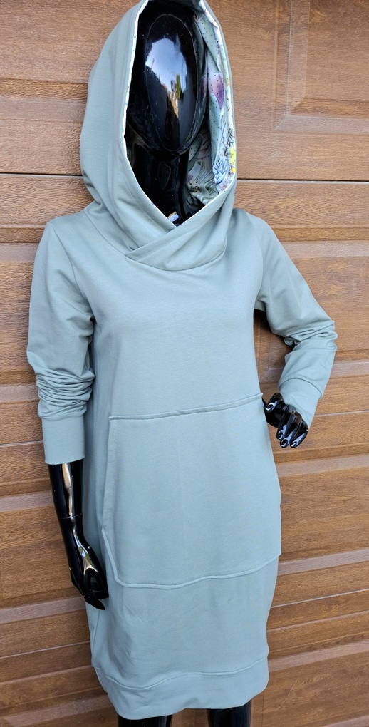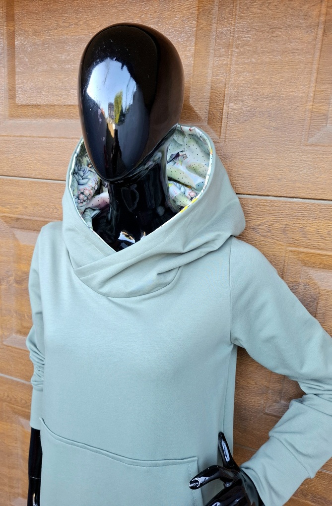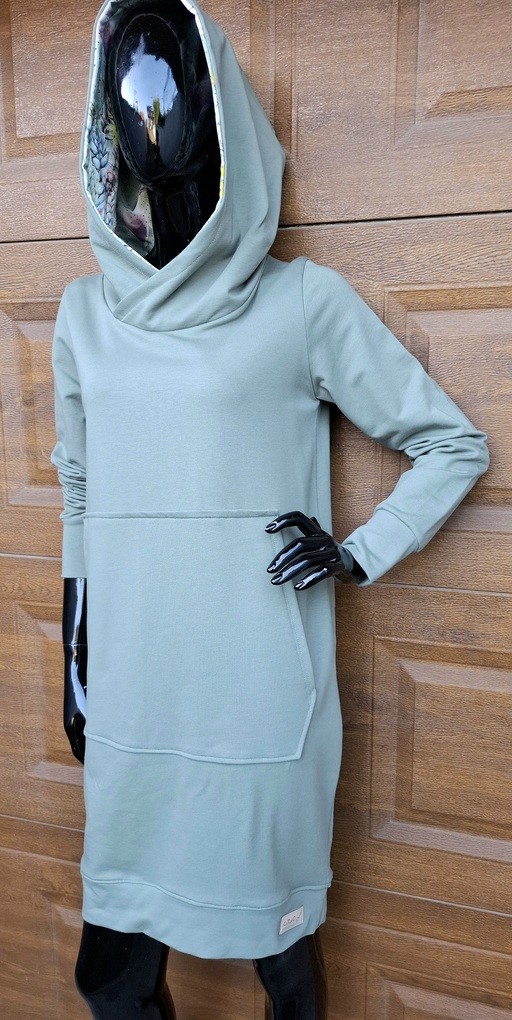 Przepiękna sukienka uszyta z wysokogatunkowej dzianiny premium w pięknym kolorze brudny niebieski (minerał), wewnętrzna strona kaptura wykończona wzorem w pastelowe kaktusy, dodatkowo dzięki domieszce elastanu 6-8% jest wygodna, elastyczna, idealna na co dzień,