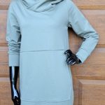 Modna sportowa sukienka damska z długim rękawem o prostym kroju delikatnie zwężona ku dołowi, z kieszenią na przodzie i obszernym kapturem. Fason sukienki idealnie komponuje się z butami na obcasie, jak również z lekkim obuwiem kasual