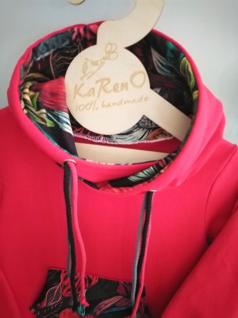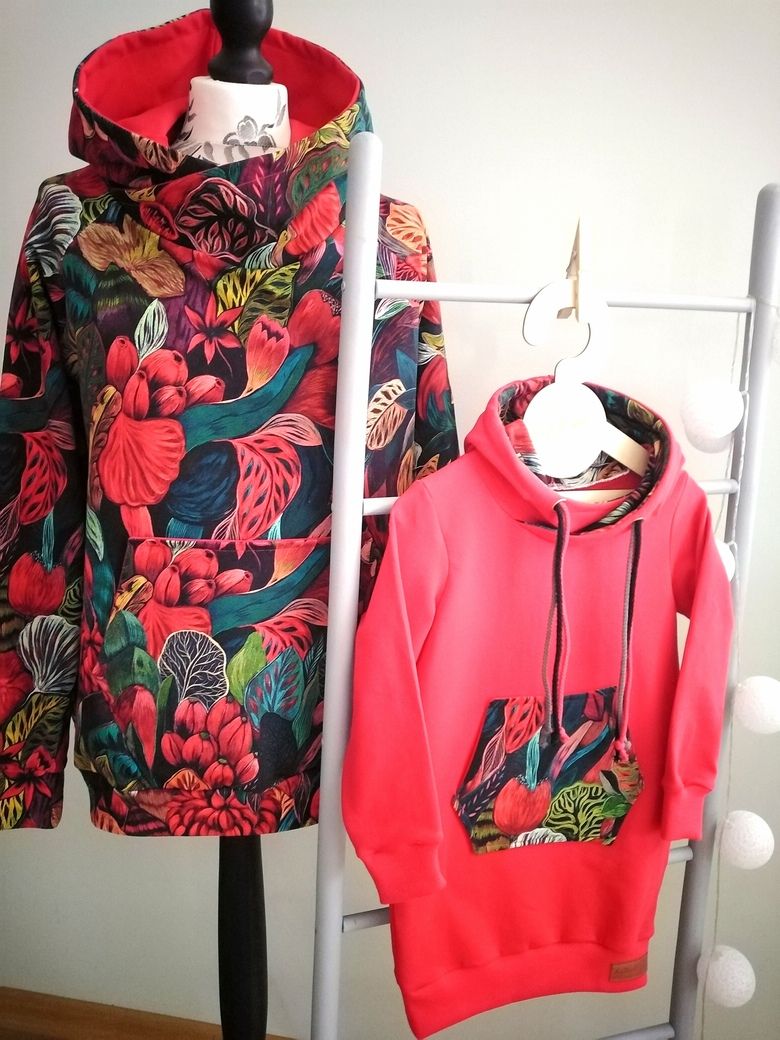 Przepiękna dziecięca sukienka dresowa z kapturek typu kangurka, z dużą kieszenią na przodzie, uszyta z wysokogatunkowej bawełny premium, w kolorze czerwonym plus kwiaty, nadruk na dzianinie wykonany jest metodą cyfrową co zapewnia najwyższą jakość nadruku, dodatkowo dzięki domieszce elastanu 6-8% jest wygodna, elastyczna, idealna na co dzień, jak i na wyjątkowe okazje.