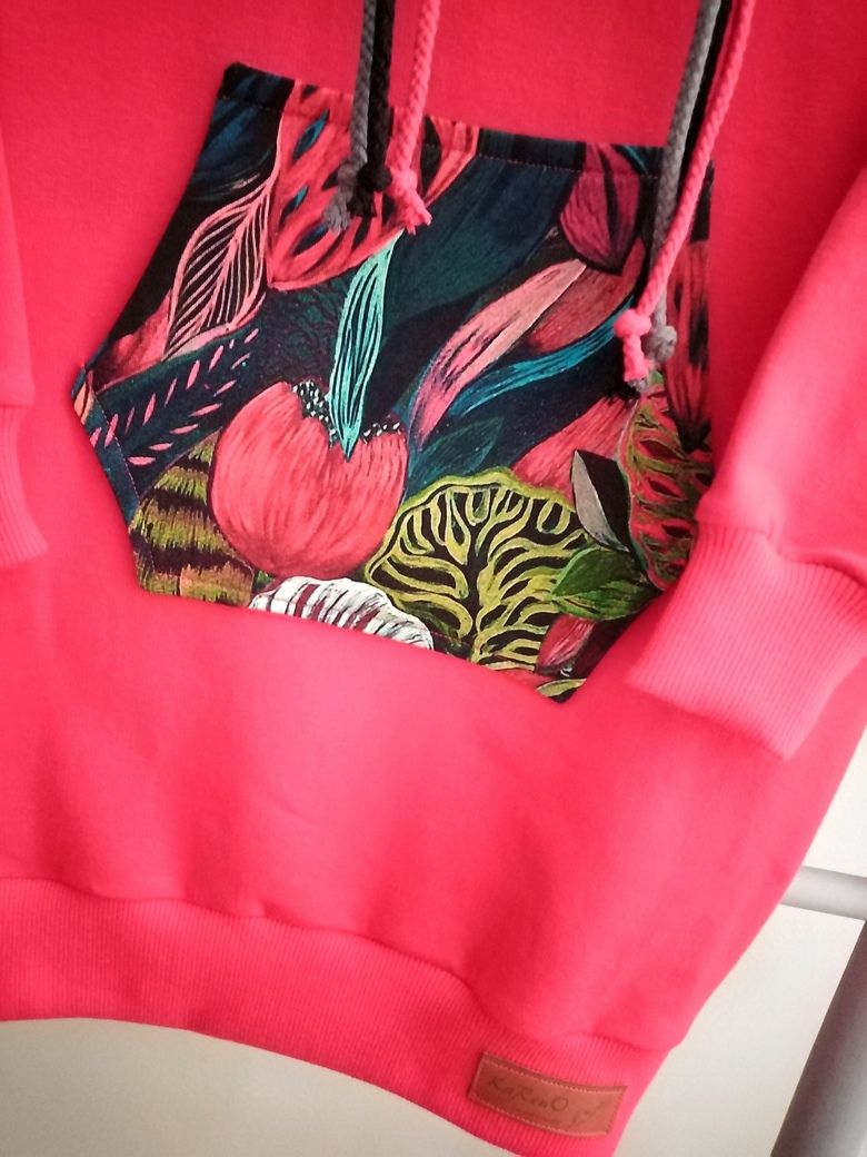 Sukieneczka dresowa dziewczęca z kapturem typu kangurka z dużą kieszenią na przodzie w pięknym kolorze soczystej czerwieni w połączeniu z dzianiną w modny wzór kwiatowy