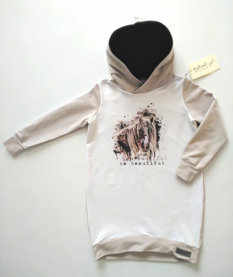 Przepiękna dziecięca sukienka dresowa z kapturek typu kangurka, z dużą kieszenią na przodzie, uszyta z wysokogatunkowej bawełny premium, w piękny print kotków, nadruk na dzianinie wykonany jest metodą cyfrową co zapewnia najwyższą jakość nadruku, dodatkowo dzięki domieszce elastanu 6-8% jest wygodna, elastyczna, idealna na co dzień, jak i na wyjątkowe okazje.