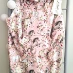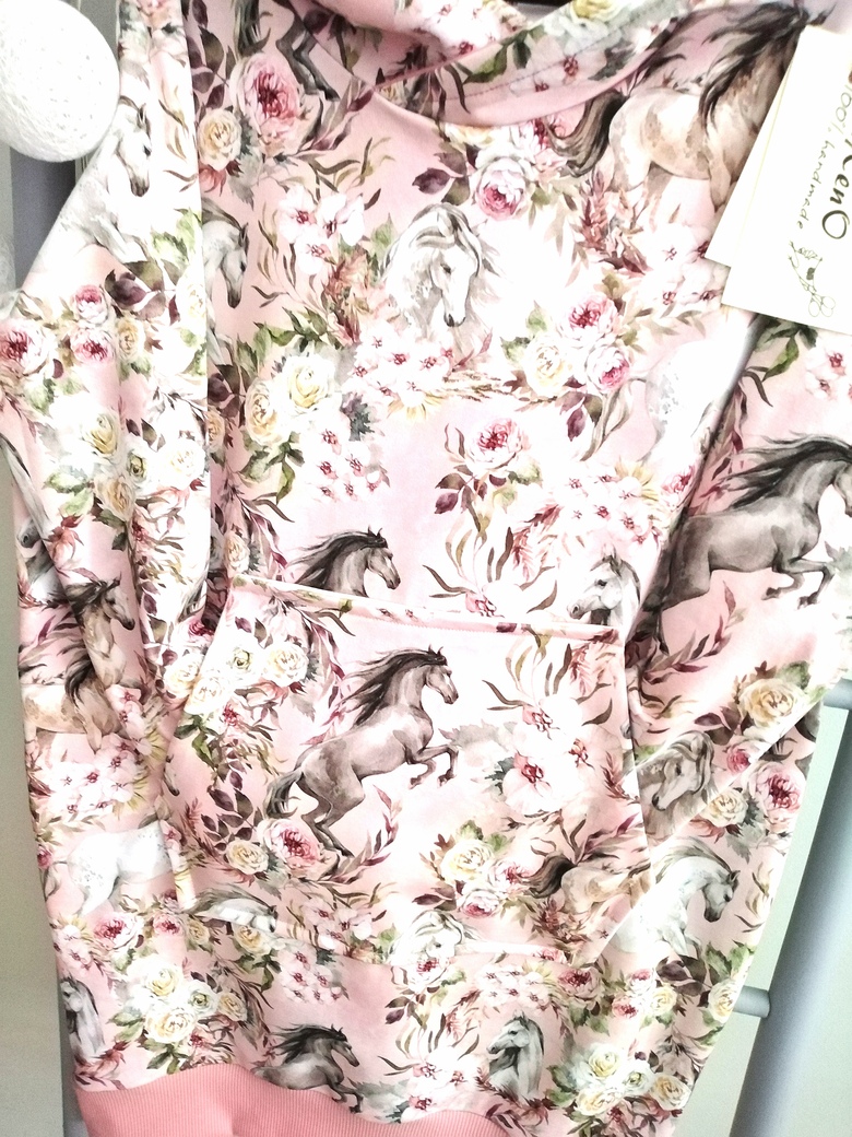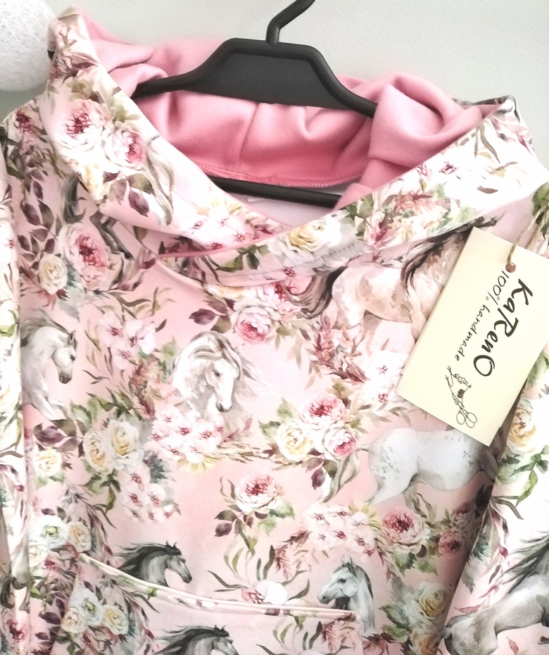 Sukieneczka dresowa dziewczęca z kapturem typu kangurka z dużą kieszenią na przodzie w piękny wzór koni w kwiatach w odcieniu brudnego różu